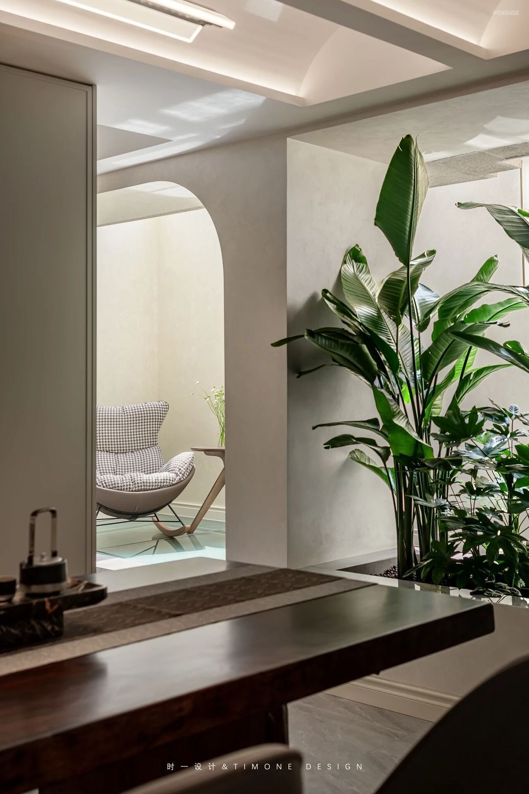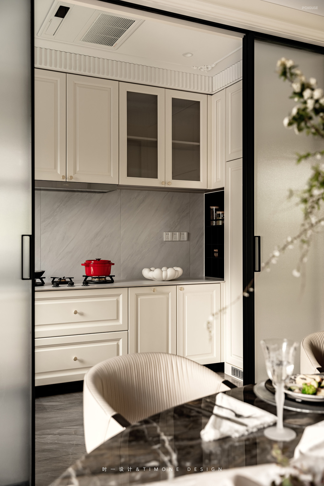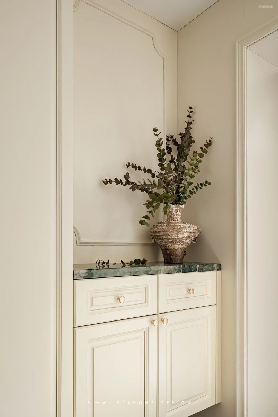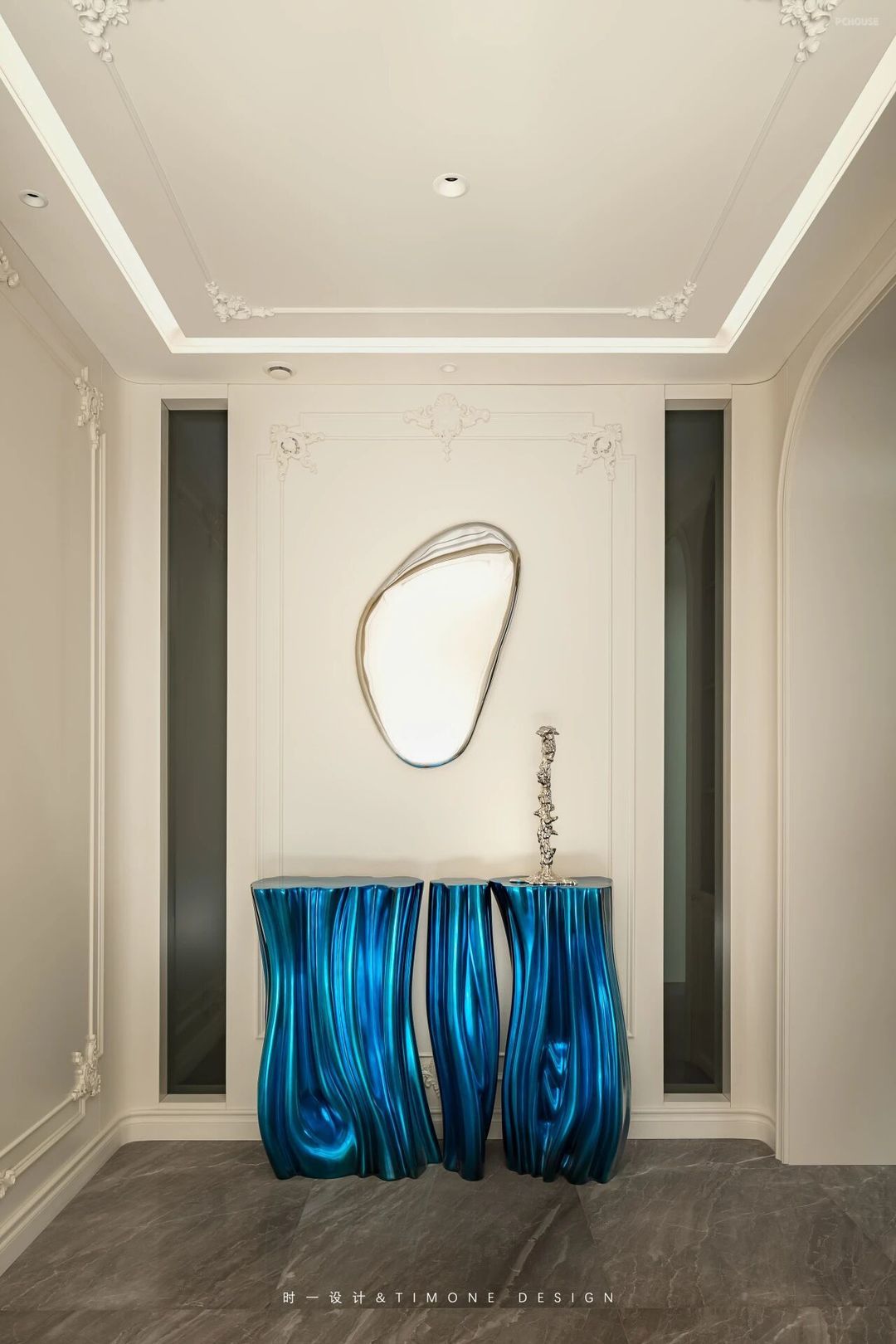 空间的色彩层次,由不同情绪质感的“白”演绎,调和均衡,令视觉感到松弛舒适。对于居住场景的设想,灵感源于“褶子”的美学元素,通过现代法式的特色符号演绎,以不规则、曲线等不同层次的造型,演绎优雅生活的艺术美学。