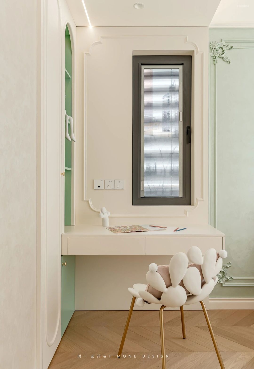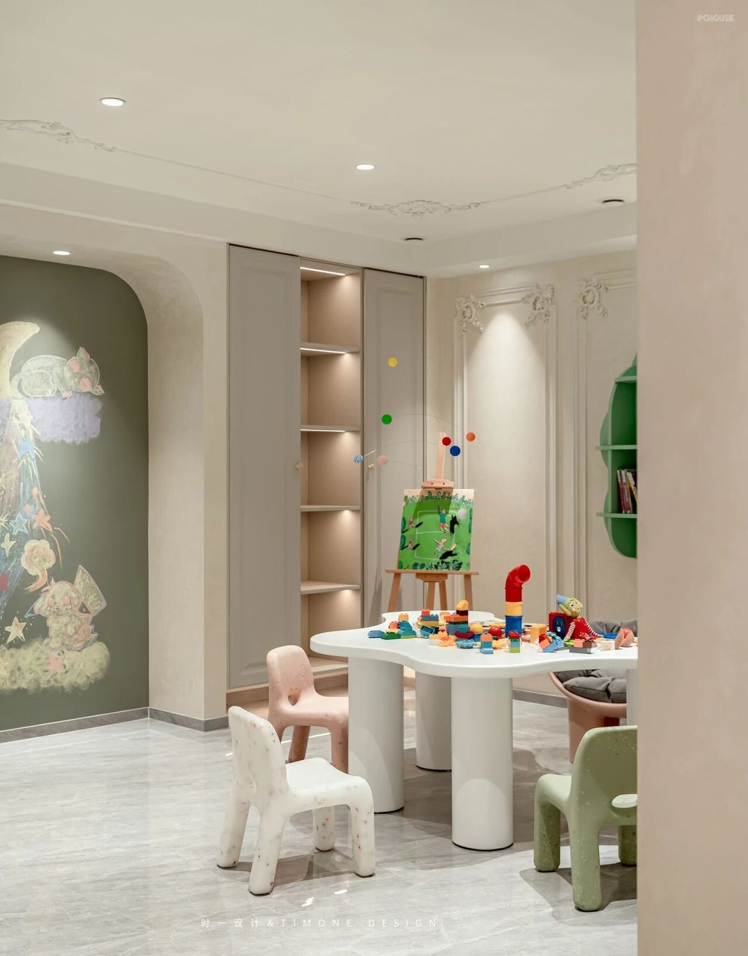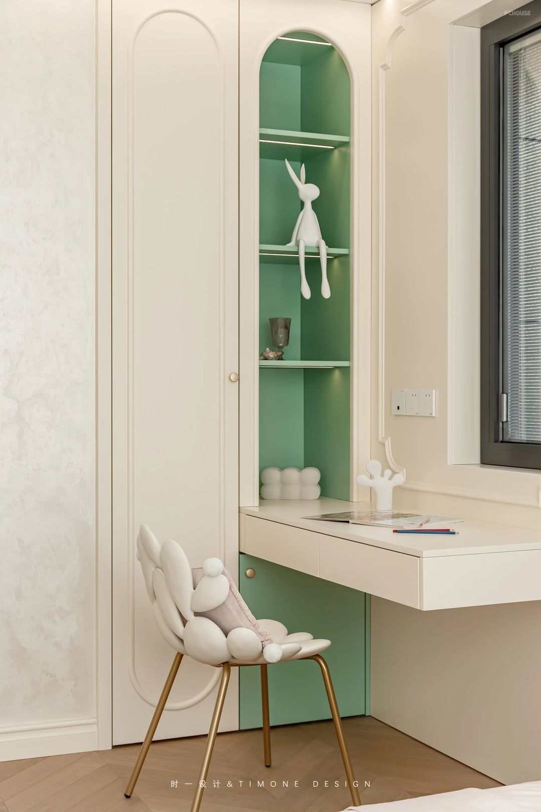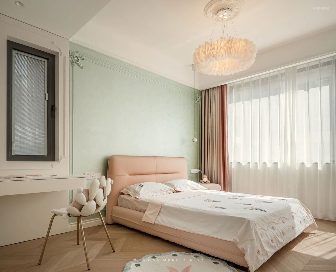 抹茶绿石膏线背景墙勾勒出微型凡尔赛宫廓形,藕粉色天鹅绒公主床搭配珍珠母贝床头柜,芭蕾舞者壁灯轻旋于羽毛状墙饰旁,每个细节都在诉说优雅成长的秘密。