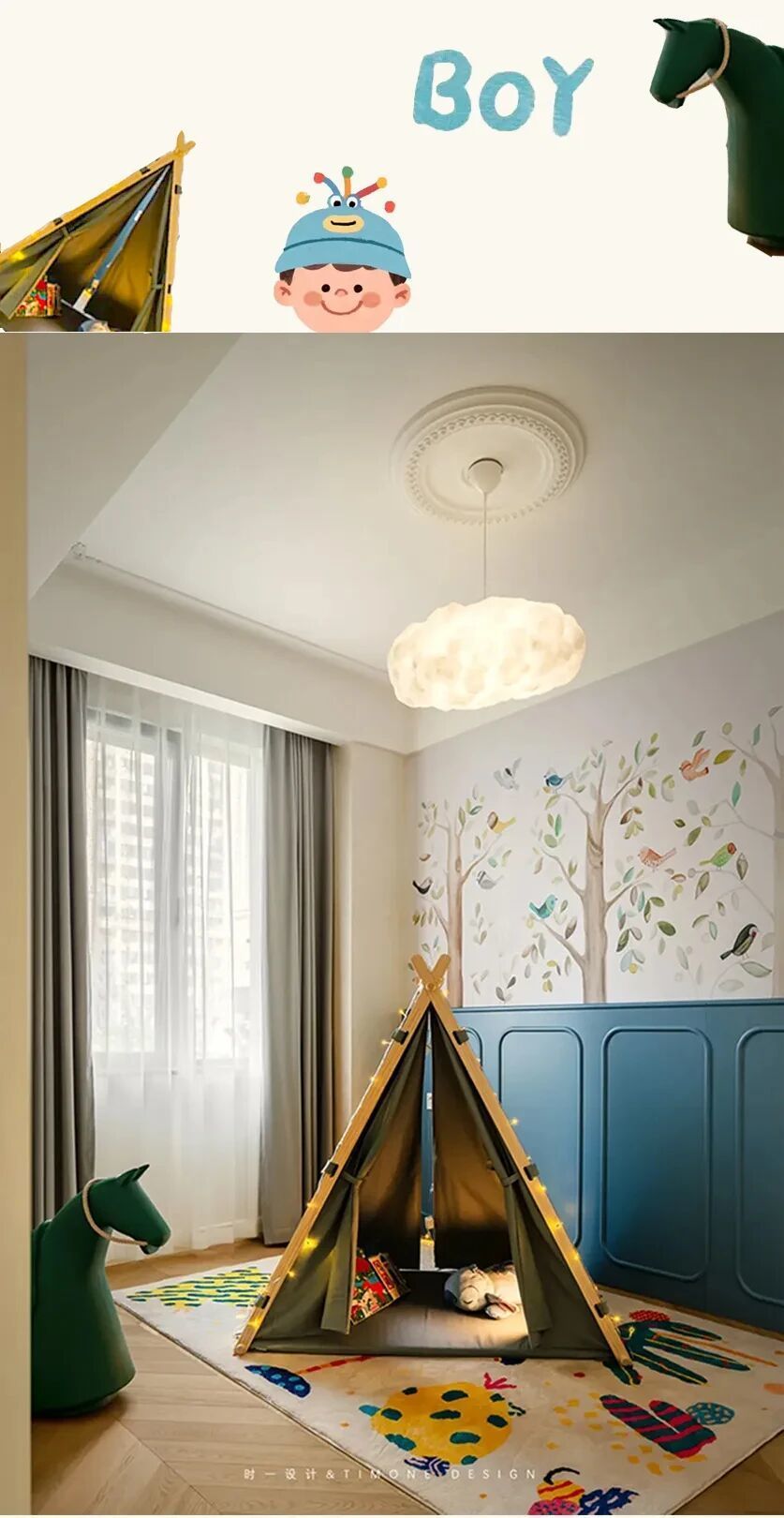 深蓝墙板与林间小鸟壁纸构筑丛林探险屋,帐篷床、攀岩灯,在自然野趣中唤醒小小探险家。