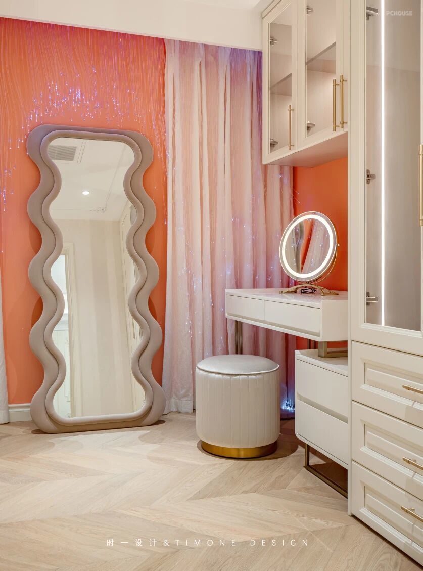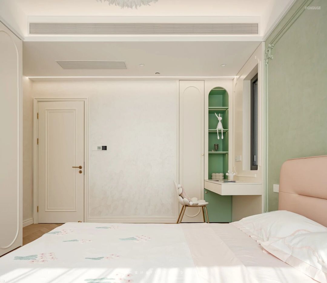 藕粉与抹茶绿拼色墙如马卡龙渐变,云朵形软包床幔垂落水晶流苏。藤编梳妆台与抽象艺术挂画碰撞,在法式雕花门框间编织少女的童话梦境。