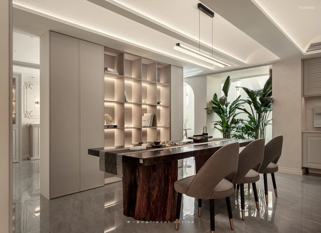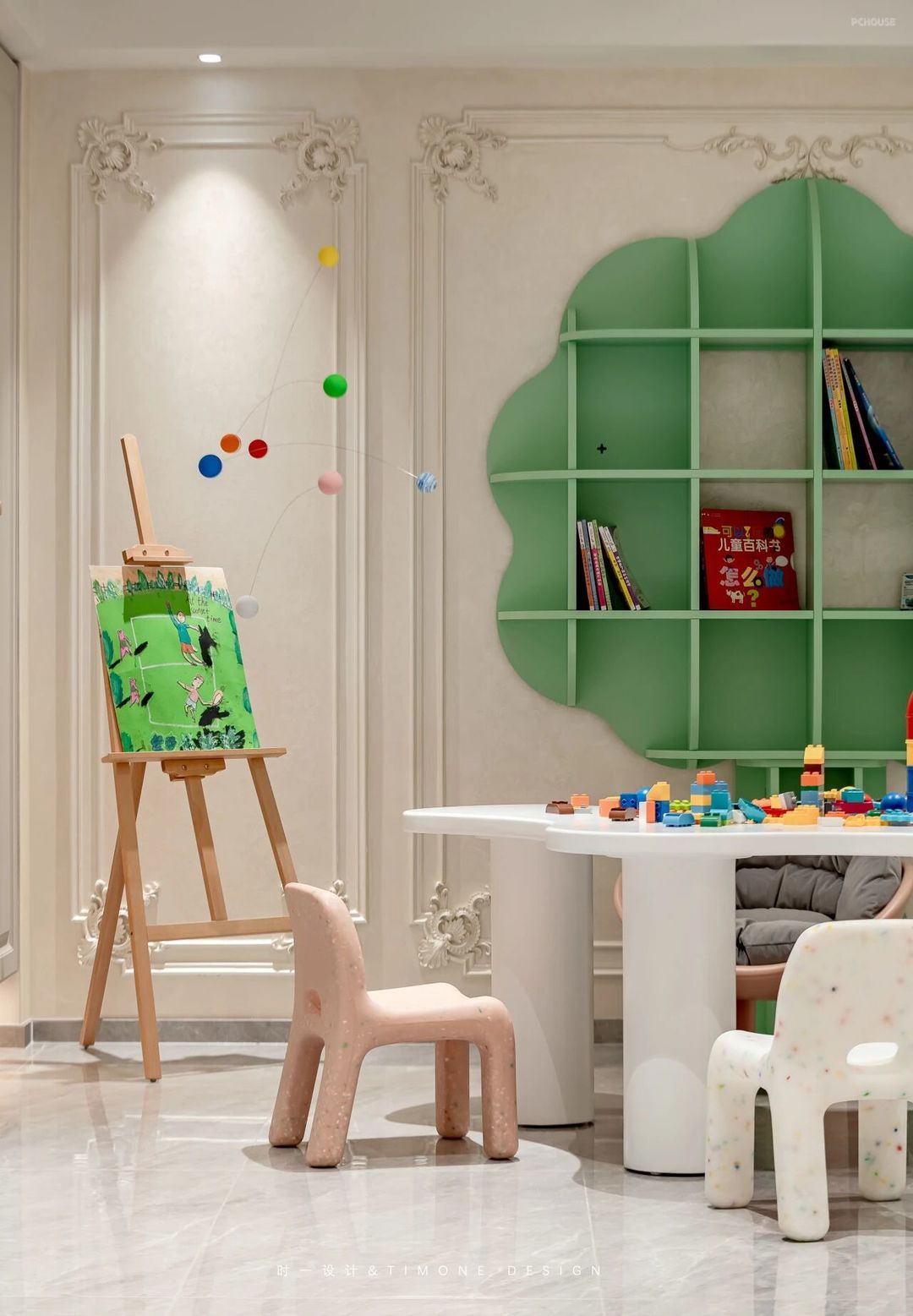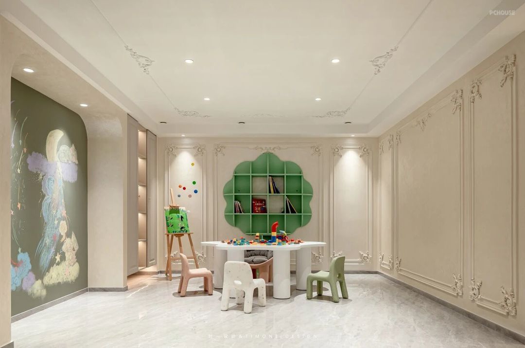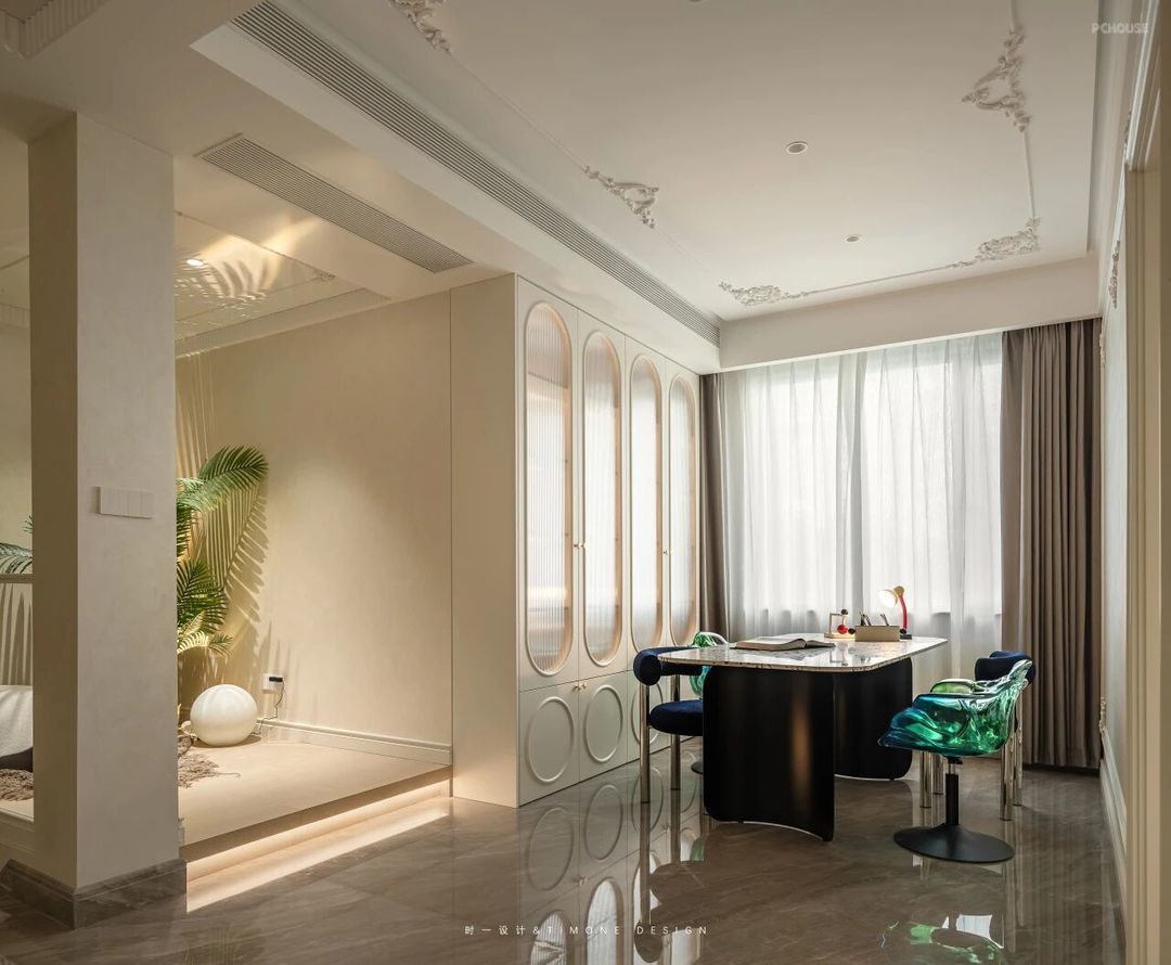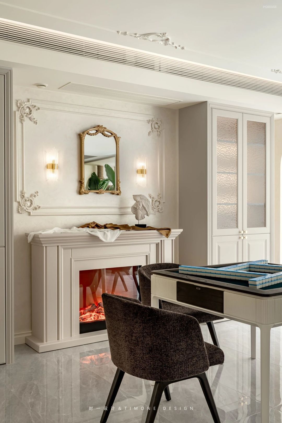 复古法式壁炉以做旧鎏金雕花定格时光,抹茶绿护墙板拼接石膏线浮雕,可旋转书柜墙暗藏投影幕布,这里可以是冬日围炉夜话的剧场,亦是品茗阅读的私人博物馆。