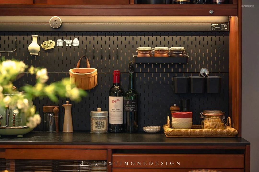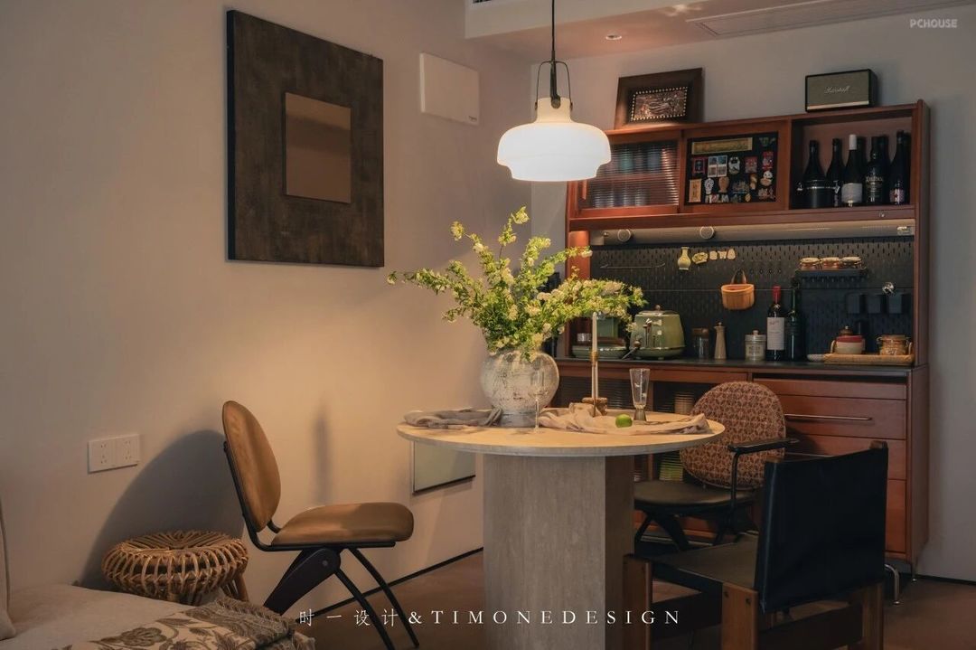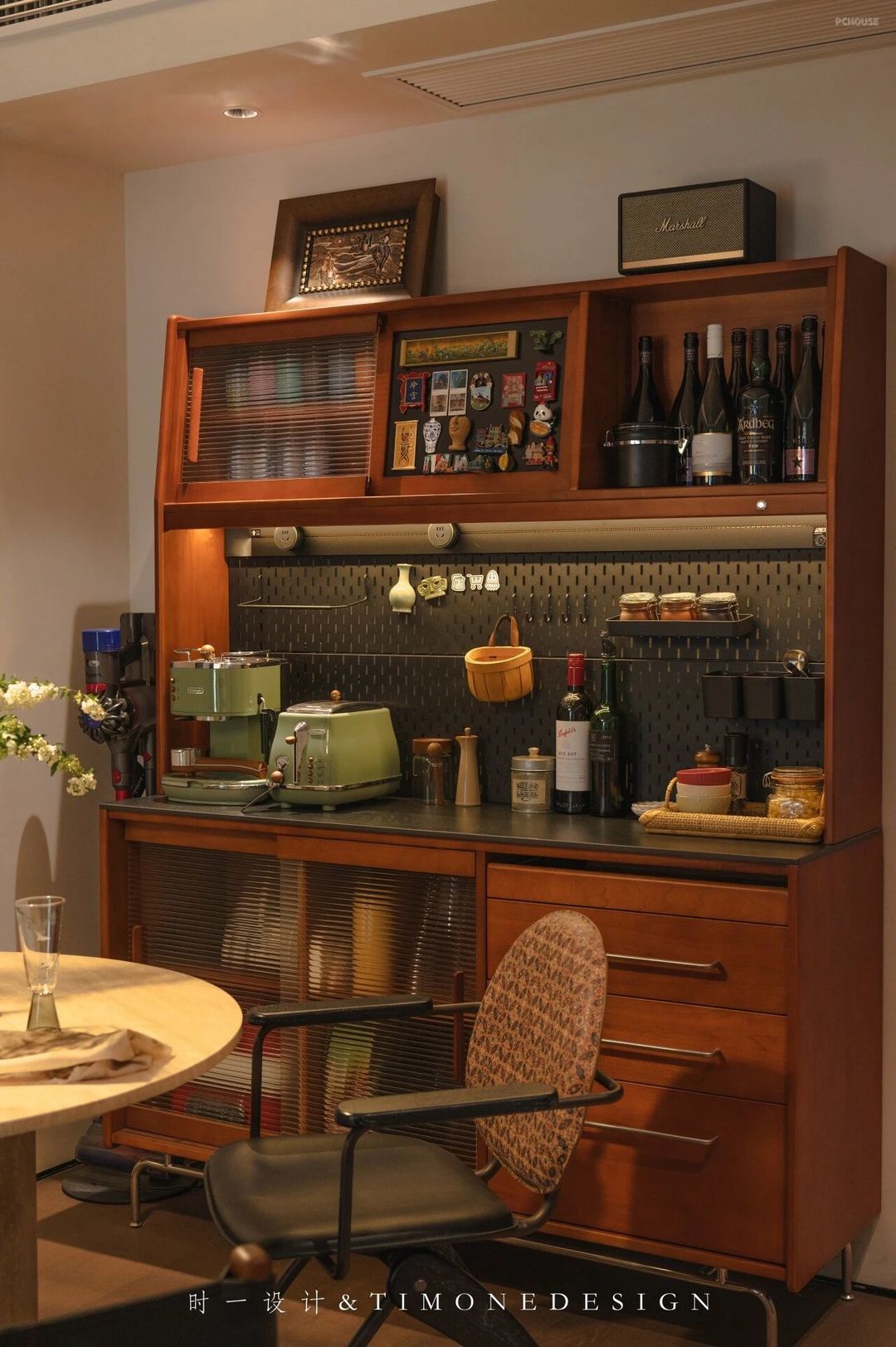 一旁的木质餐边柜深沉古朴,柜上陈列着咖啡机、红酒与精致器皿,洞洞板挂着小巧物件,实用与装饰性兼具。柜顶的相框与音响,增添生活故事感。