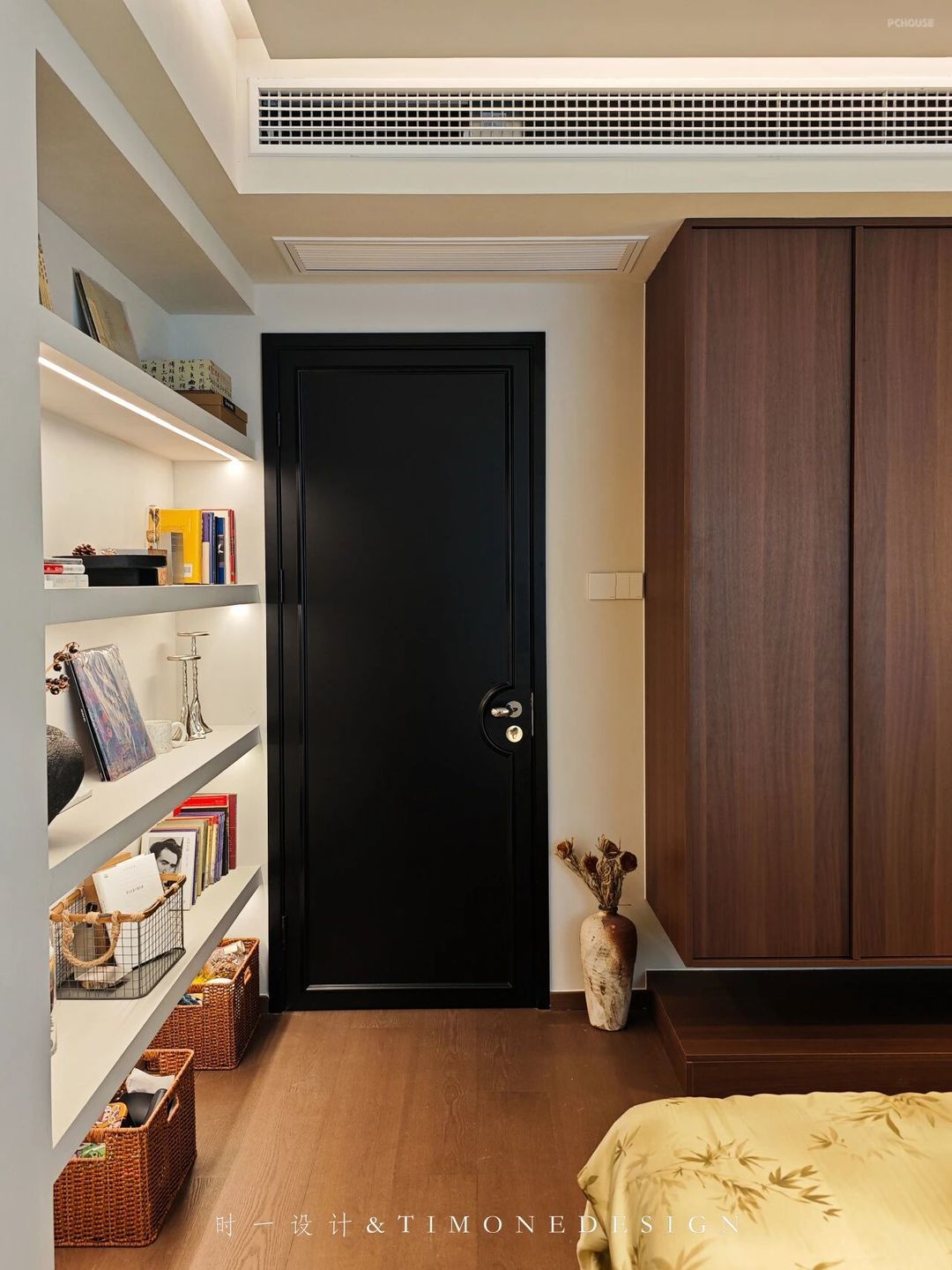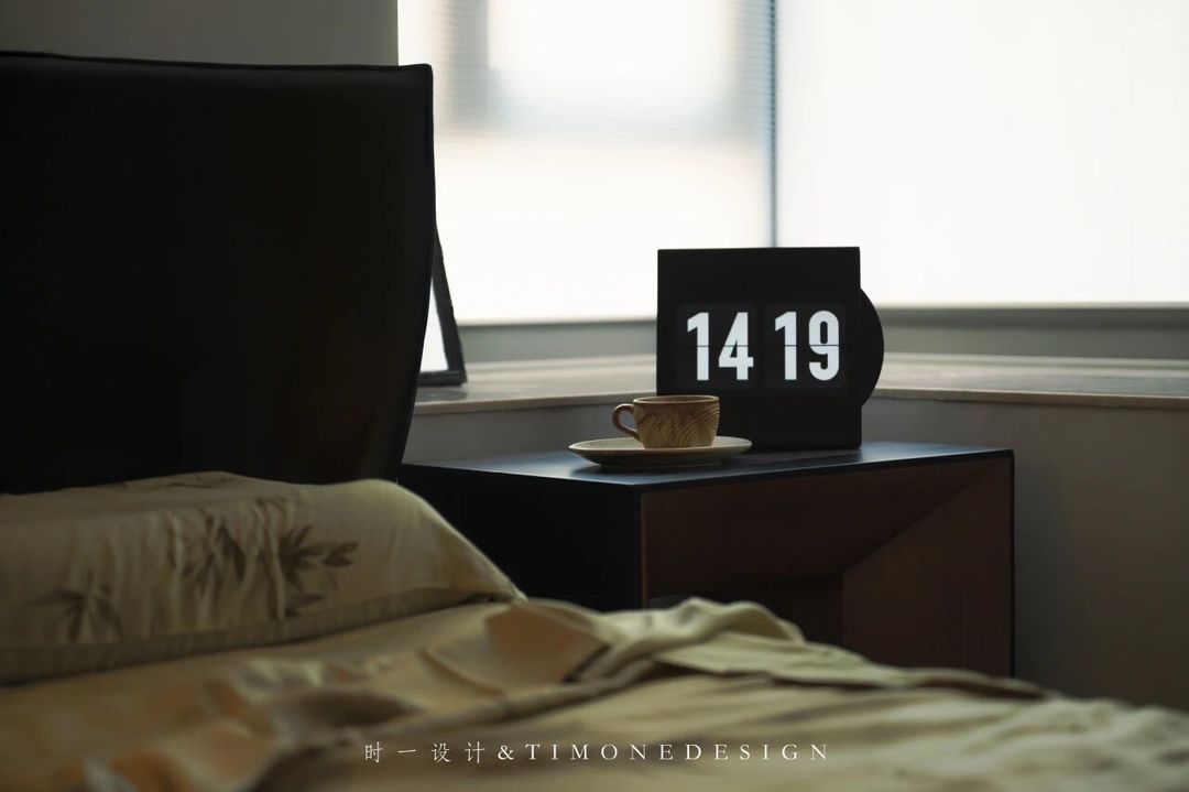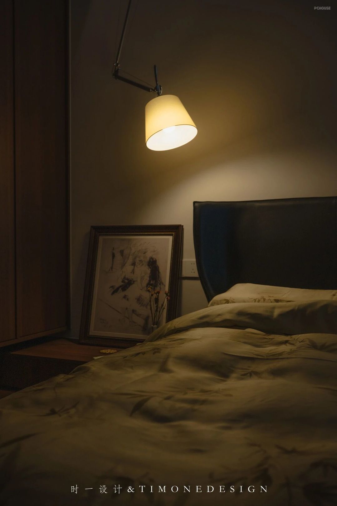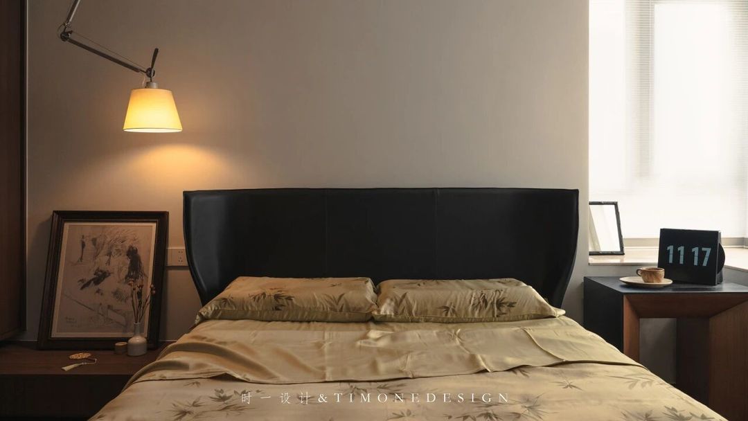 卧室弥漫着简约而不失韵味的气息,黑色床头沉稳大气,搭配米黄色竹叶图案的床品,自然雅致。一侧壁灯倾洒暖黄光芒,下方木质台面上,黑白素描画框与插着干花的小瓶相映成趣,几样精致小物点缀其间,尽显细腻格调。
