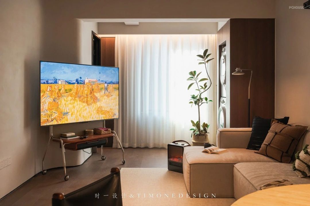踏入这方客厅,仿若步入时光雕琢的优雅之境。暖调灯光温柔洒落,勾勒出空间的柔和轮廓。经典的黑色移动电视沉稳矗立,与一旁复古造型的小桌相映成趣,小桌上随意摆放的书籍,增添着几分闲适韵味。