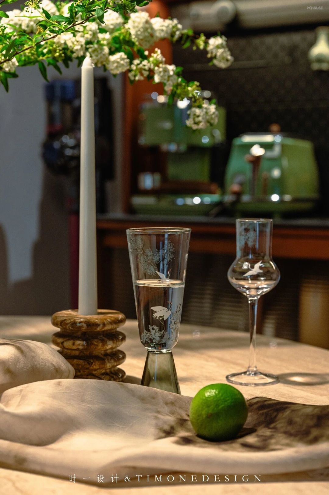暖光倾洒,营造出温馨而怀旧的氛围。洞石餐桌搭配风格独特的椅子,桌上花瓶中绿意盎然的花枝轻展,为空间注入自然生机。