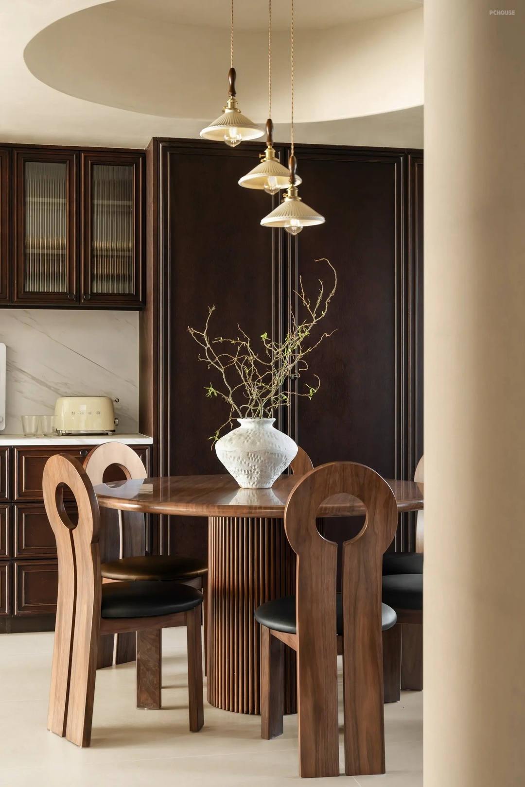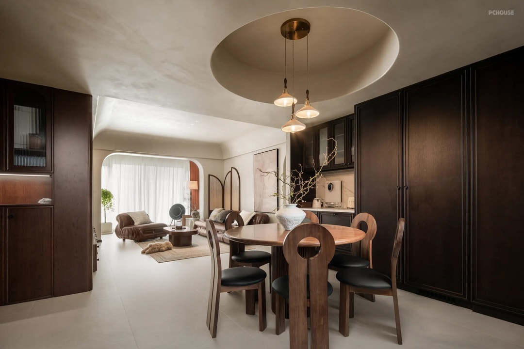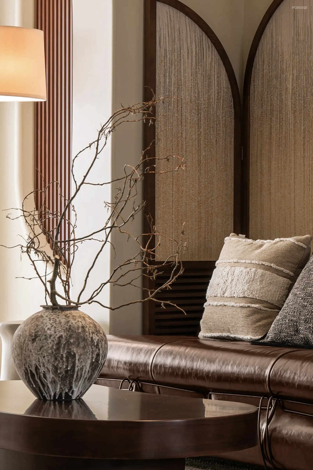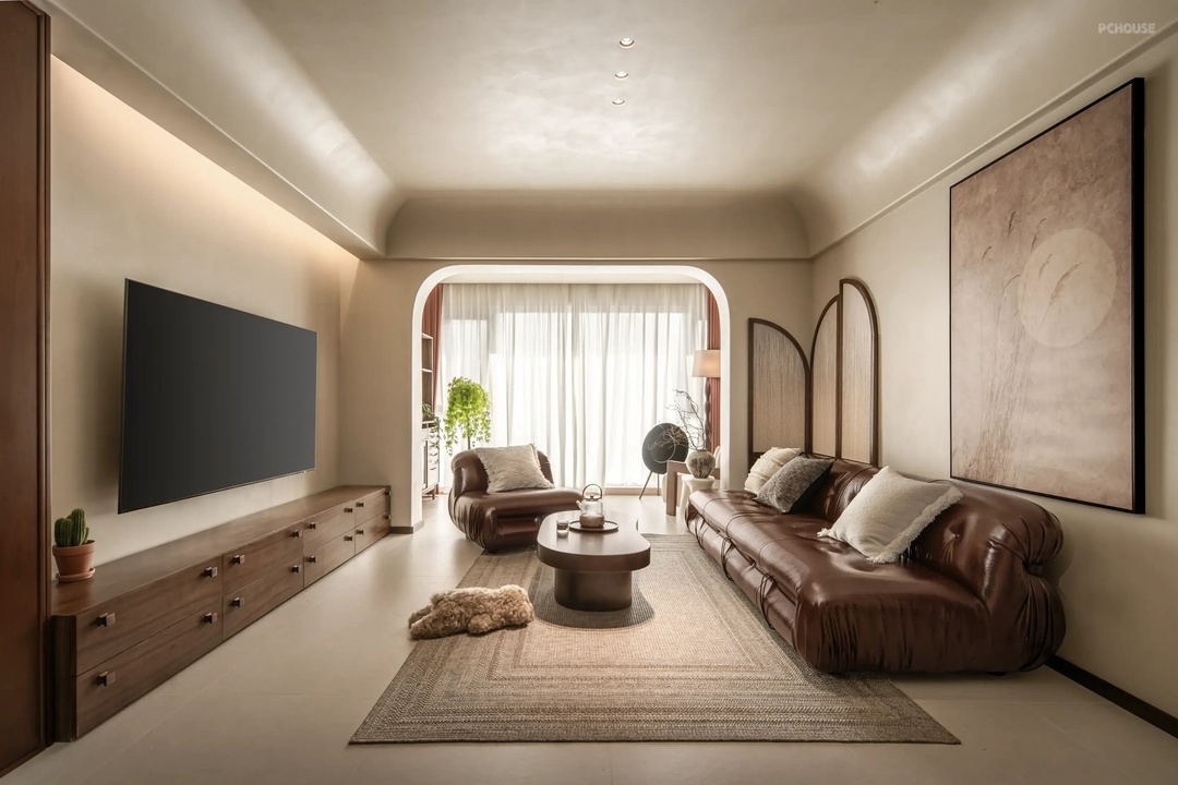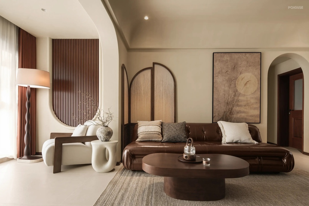前言: 当空间褪去繁杂装饰,回归质朴本真,便能承载生活的松弛与诗意。本项目以自然材质、柔和色调为笔,绘就兼具温暖与质感的居住画卷。开放式与半私密区域穿插,拱门、隔断弱化边界,让家既有交流的开阔,又有独处的角落。自然元素如干枝、绿植,复古符号如雕花家具、皮质软包,相互渗透,不刻意追随时髦,却把 “宜居” 二字,藏进每一处材质、光线与陈设的对话里,打造出有温度、有故事的私宅模样。