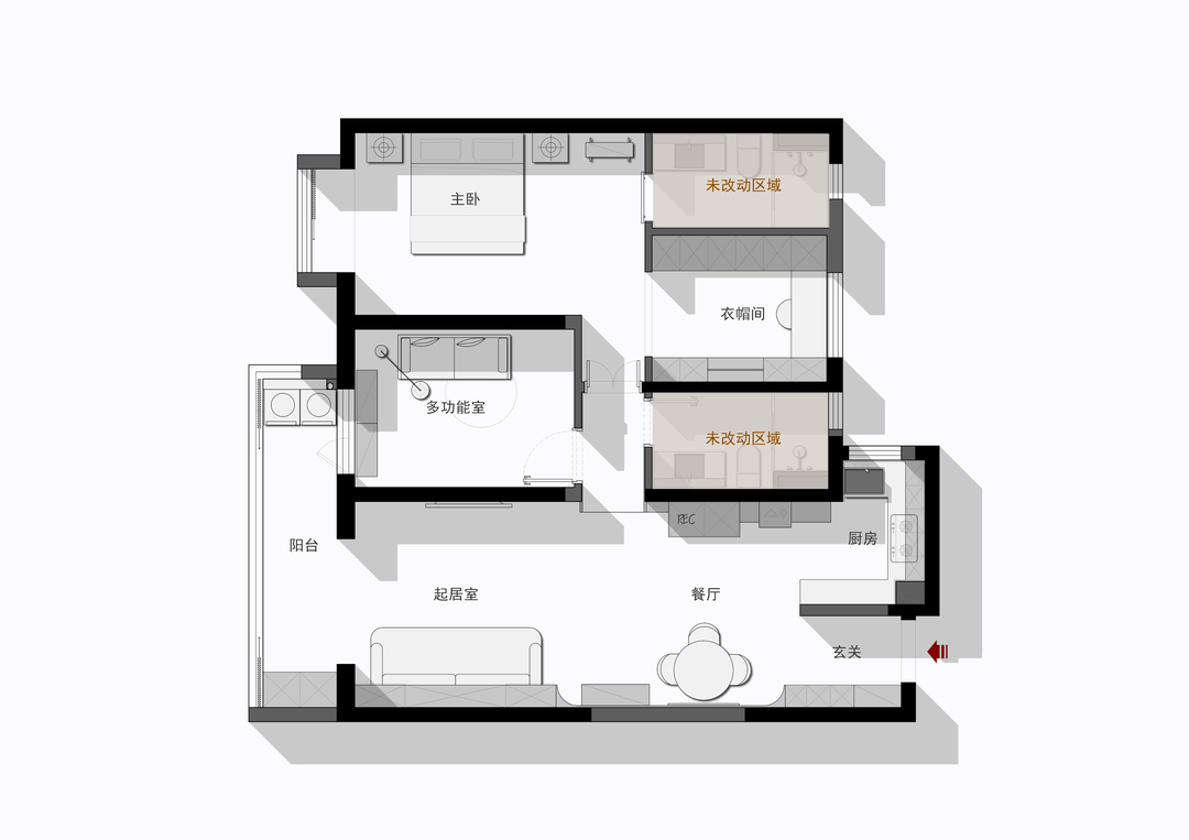 本案的屋主是一位年轻的独居女性,这间房子的原始户型是精装交付的小三居住宅,而其装修风格与空间格局无法满足屋主的审美期待和生活习惯。
