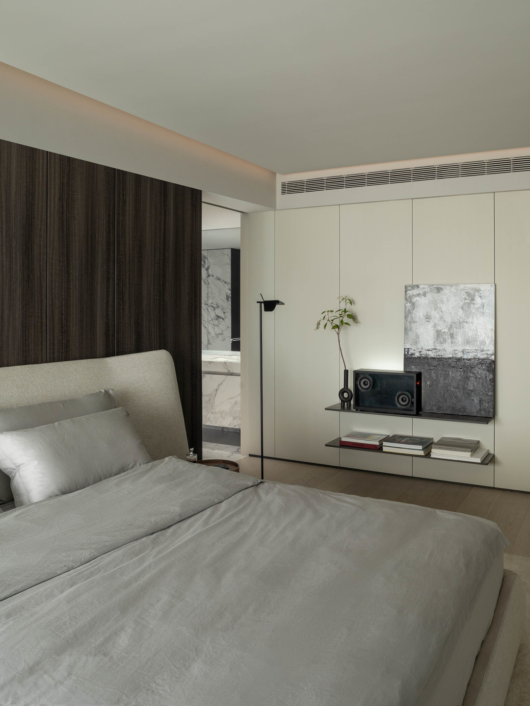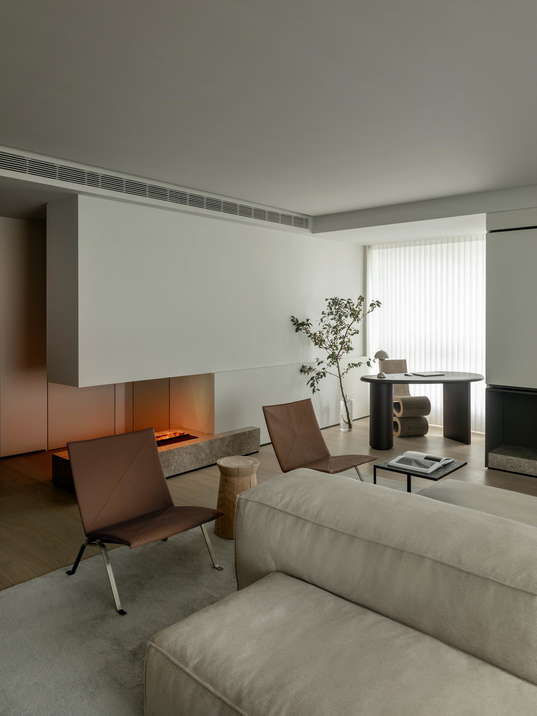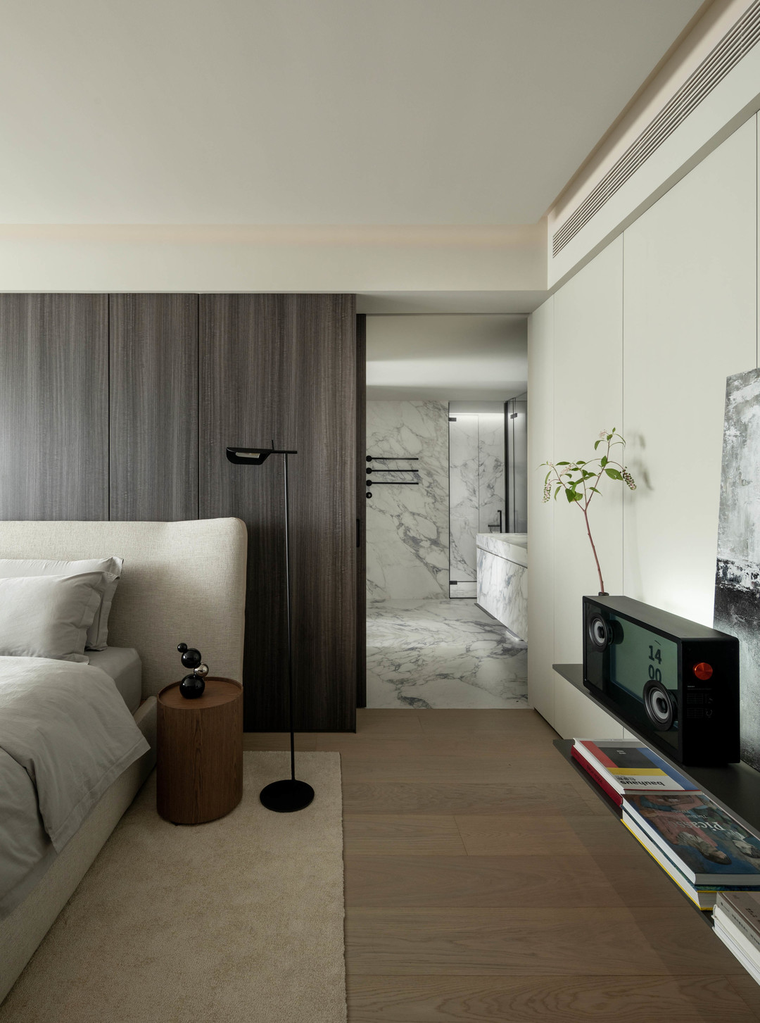 所中,暖灰色橡木饰面与温润的木地板铺陈出宁静基调,西班牙砂岩与洞石