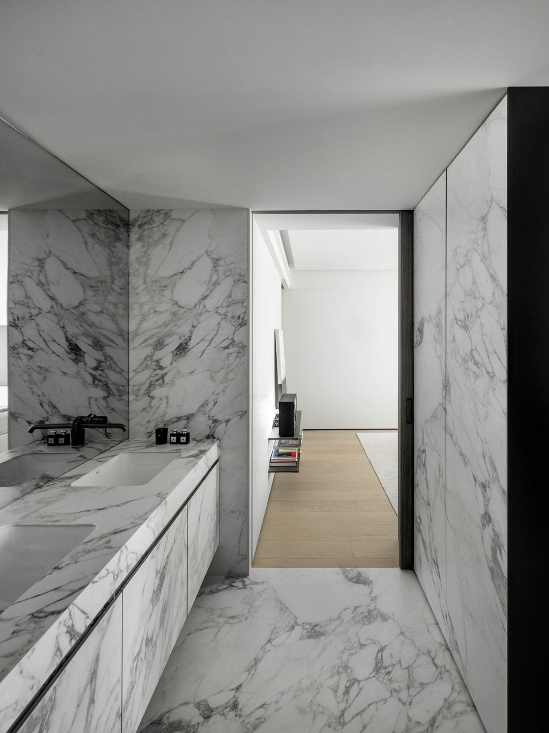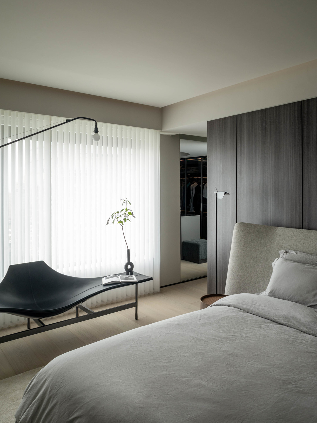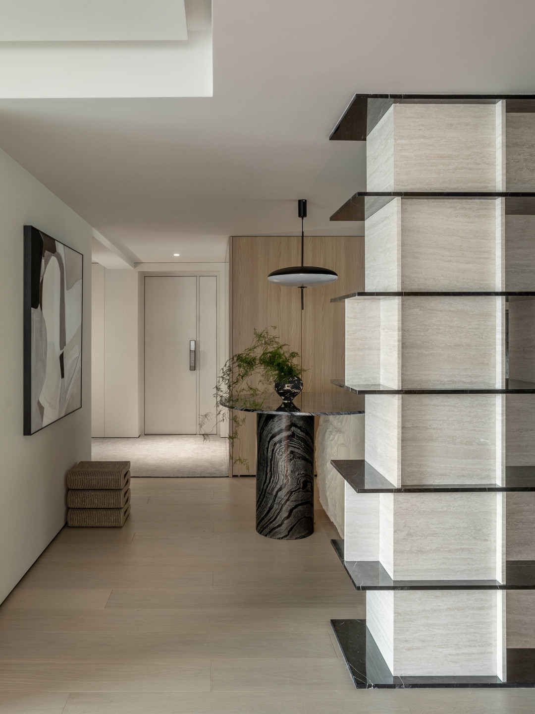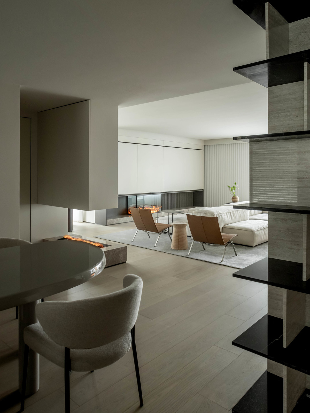 所中,暖灰色橡木饰面与温润的木地板铺陈出宁静基调,西班牙砂岩与洞石