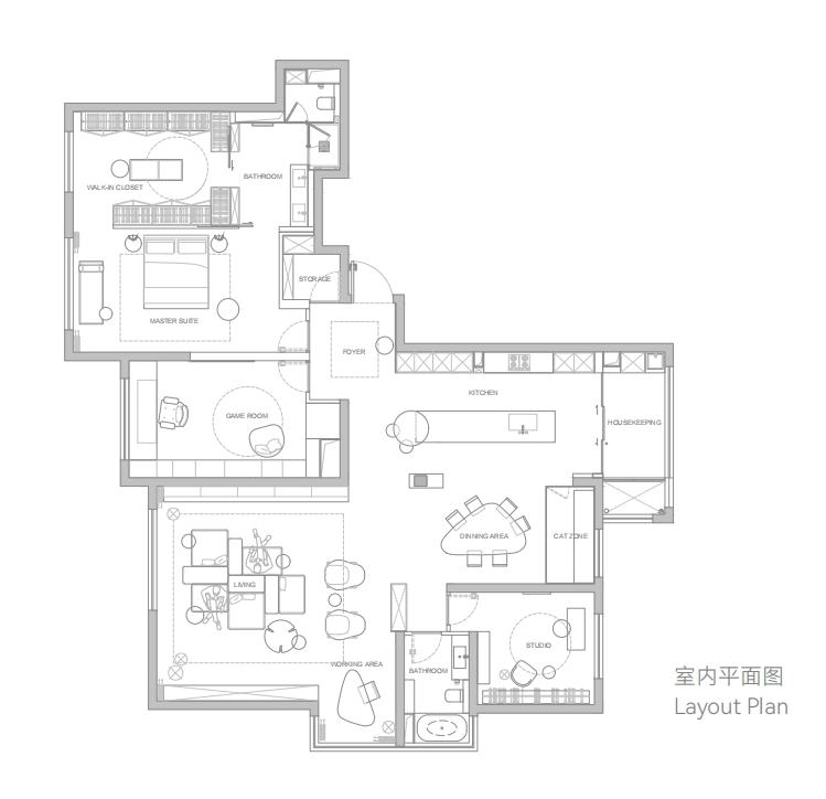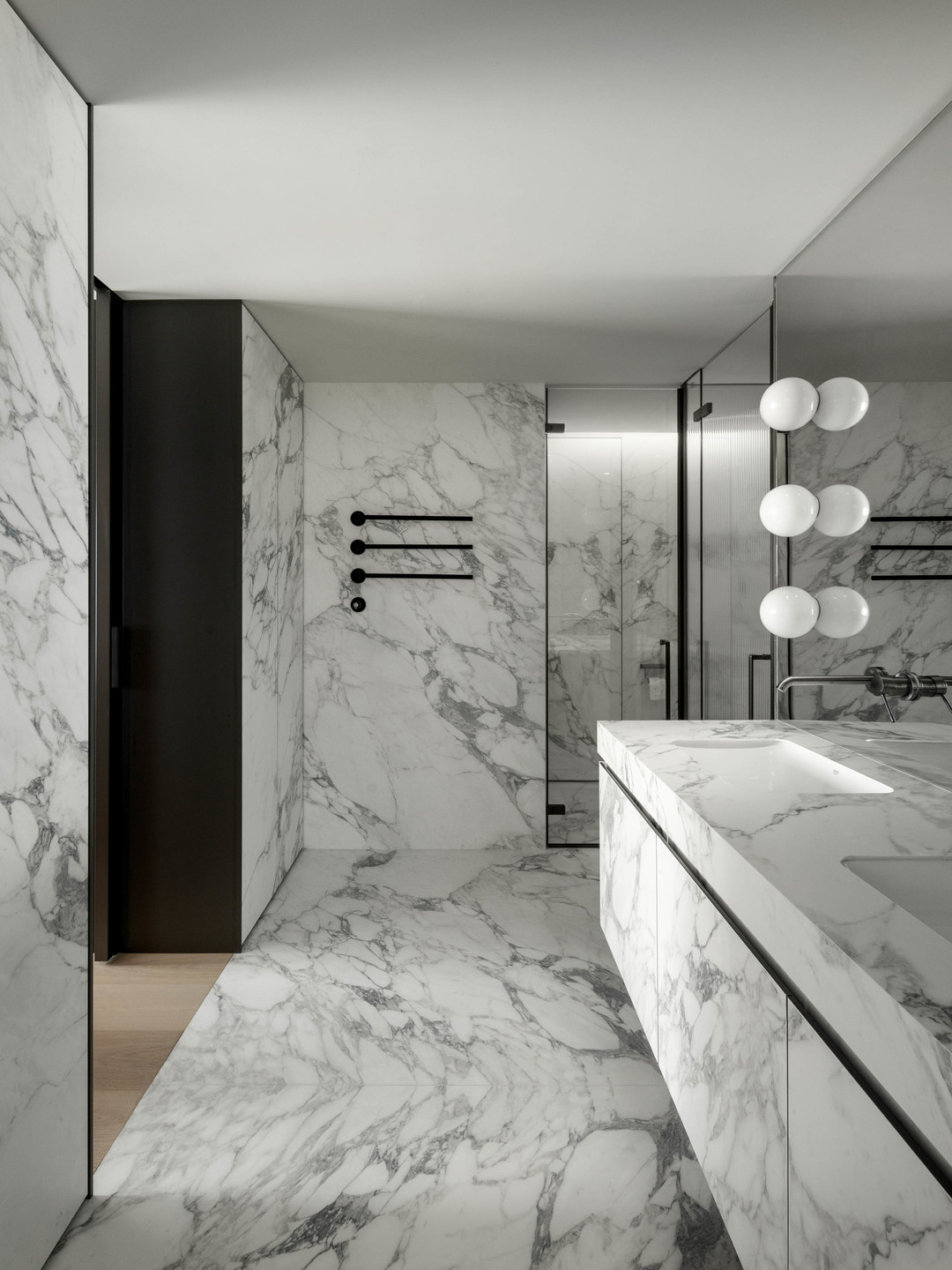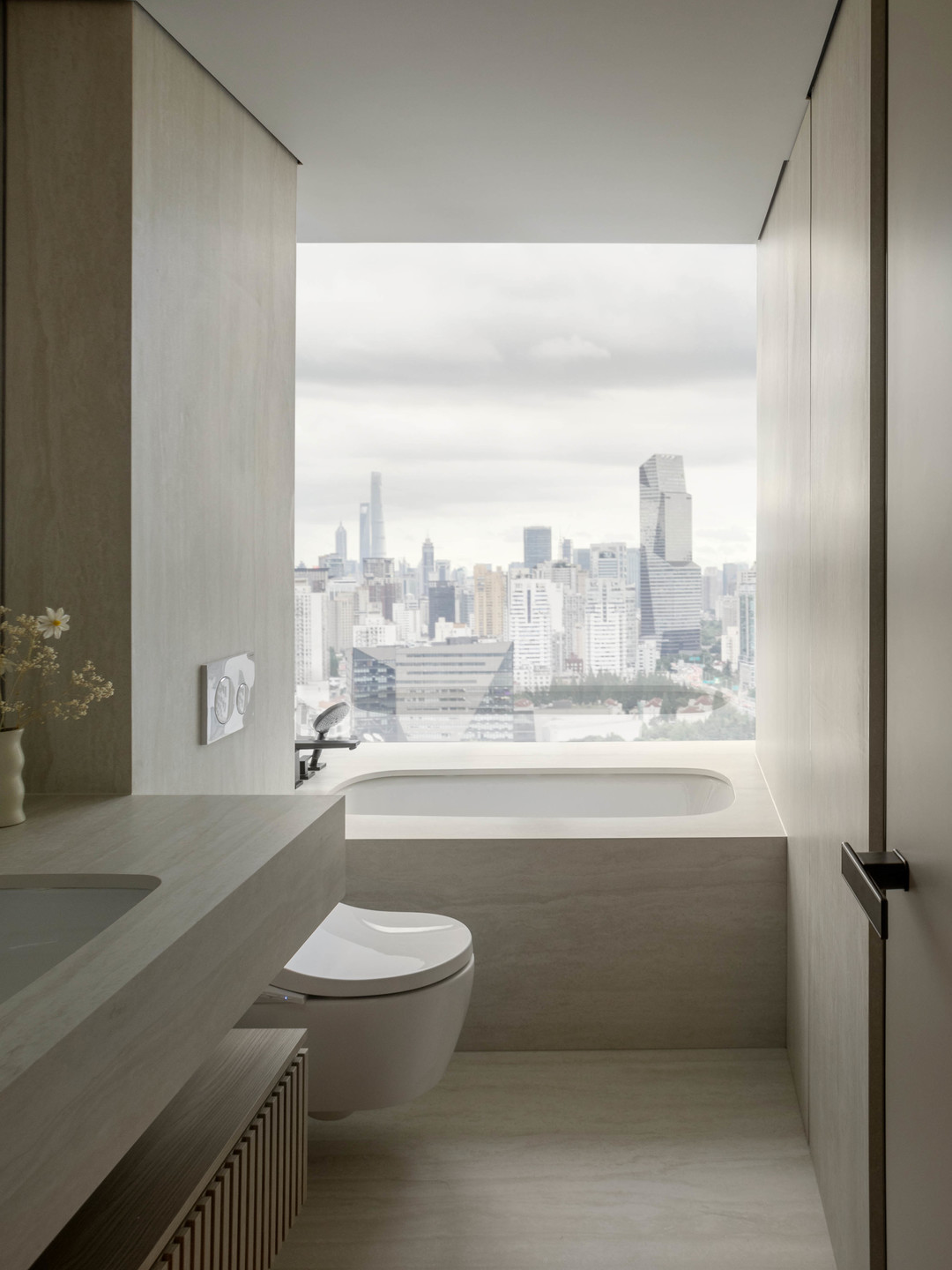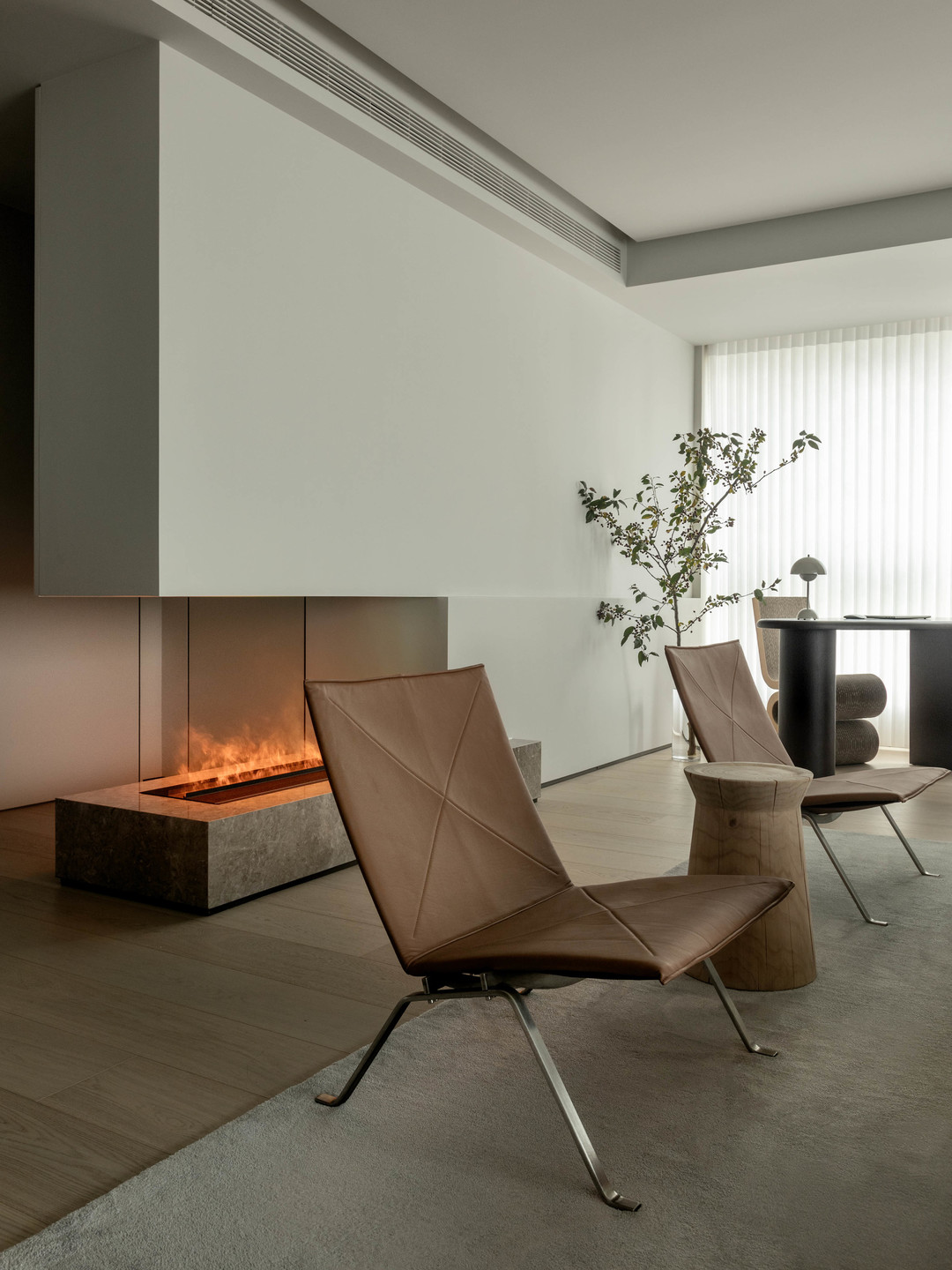 所中,暖灰色橡木饰面与温润的木地板铺陈出宁静基调,西班牙砂岩与洞石