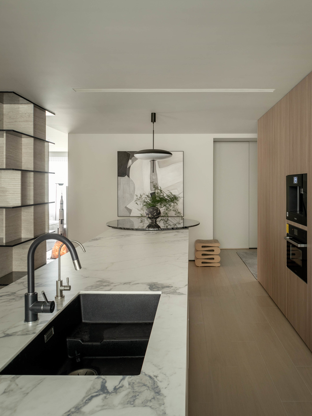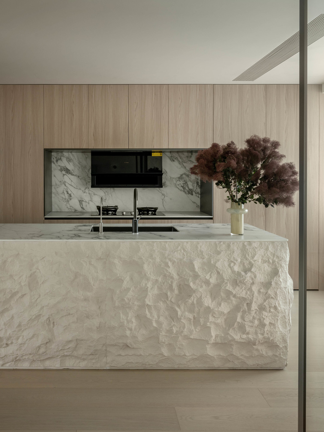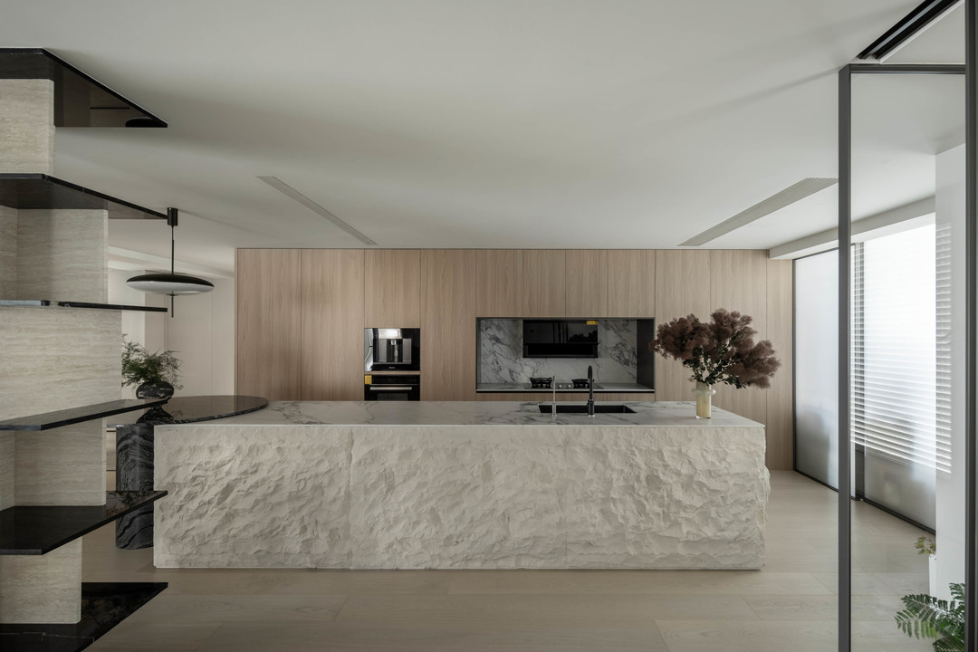 场景;西厨中岛以手工凿刻的西班牙砂岩为台,粗粝如礁石,与细腻的极简线