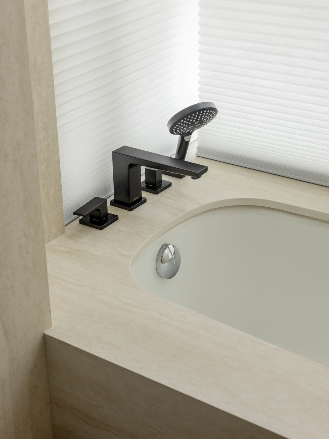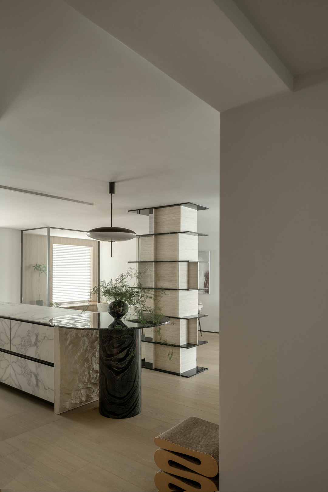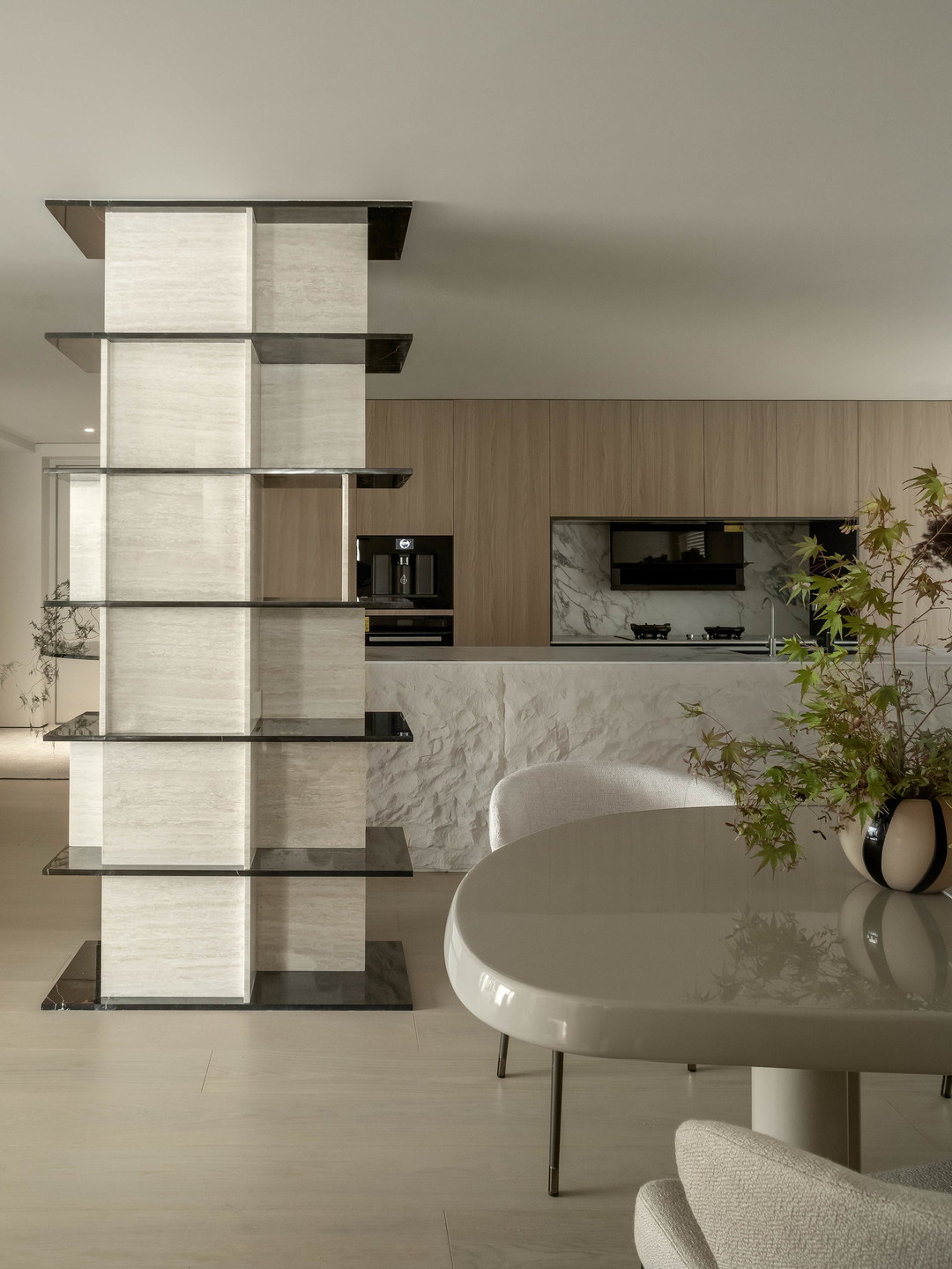 场景;西厨中岛以手工凿刻的西班牙砂岩为台,粗粝如礁石,与细腻的极简线
