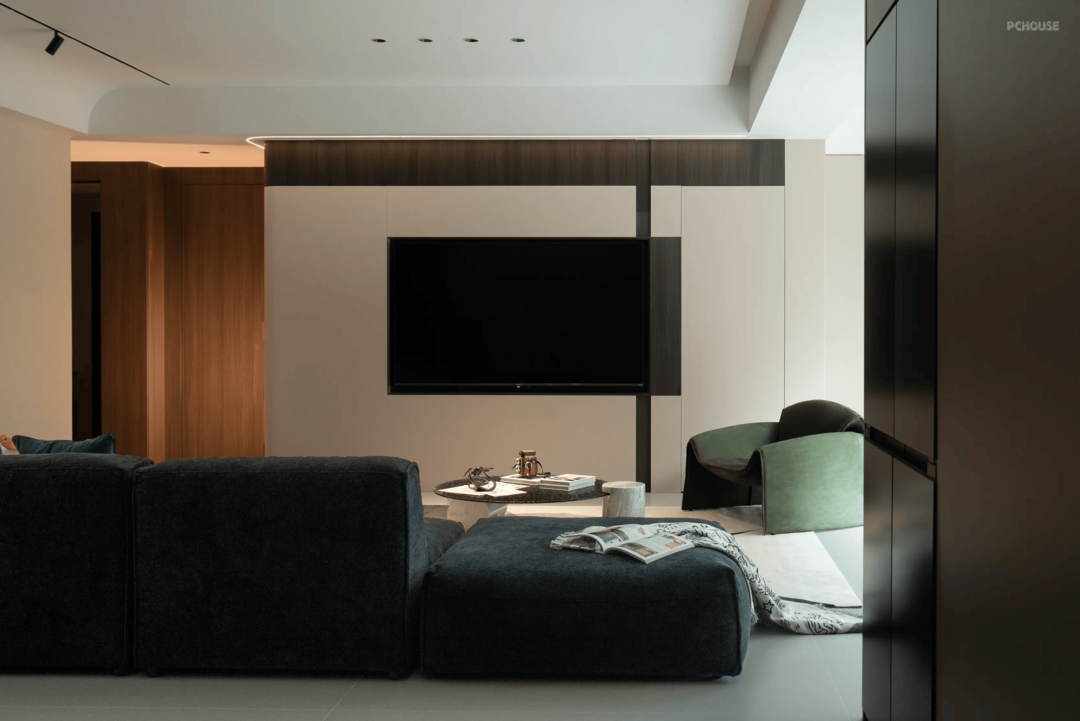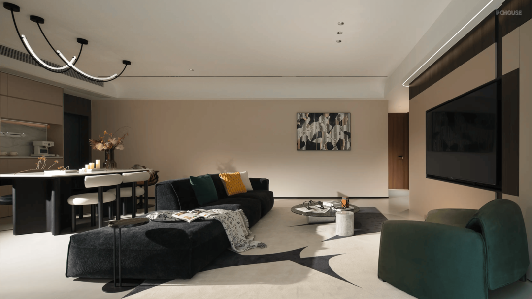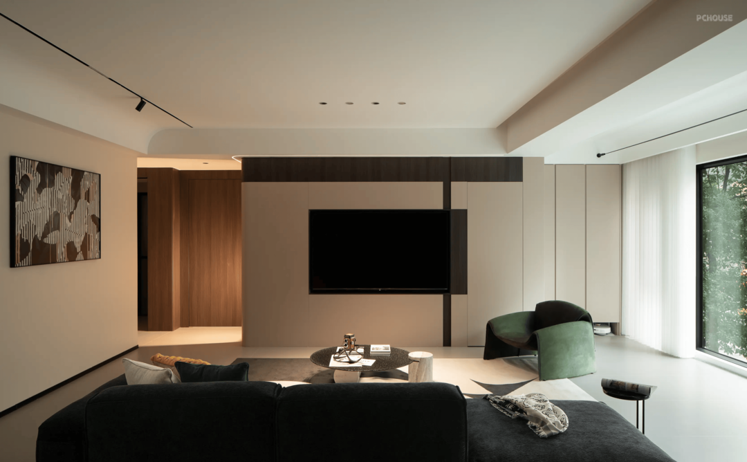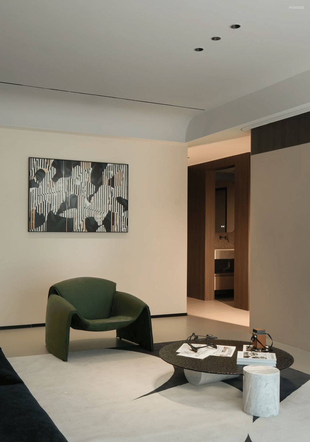 柔和的弧形线条以静态的元素汇集成动态的情绪与感受,在空间中描绘出优雅的韵律轨迹。墨绿色的丝绒单椅成为视觉焦点,与沉稳的深灰色主沙发围合出温馨的休憩、社交场所;电视机采用嵌入式设计,搭配内凹的黑色暗槽增强背景墙的立体与层次,而四周隐藏式的储物系统则将日常琐碎悄然收纳,在视觉上保持公区的连贯与通透。