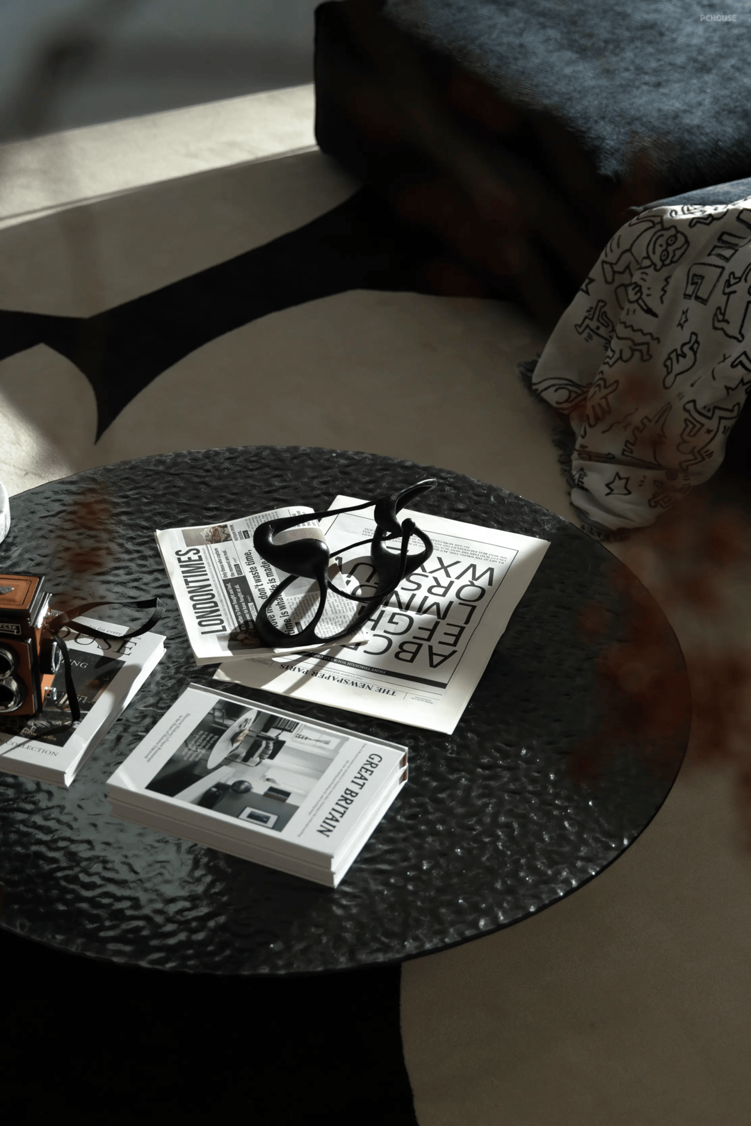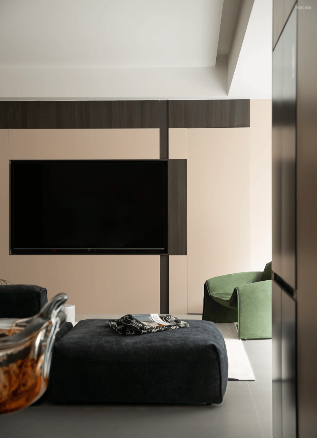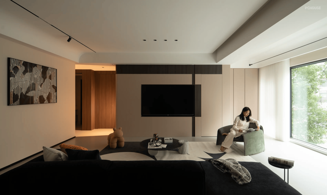 柔和的弧形线条以静态的元素汇集成动态的情绪与感受,在空间中描绘出优雅的韵律轨迹。墨绿色的丝绒单椅成为视觉焦点,与沉稳的深灰色主沙发围合出温馨的休憩、社交场所;电视机采用嵌入式设计,搭配内凹的黑色暗槽增强背景墙的立体与层次,而四周隐藏式的储物系统则将日常琐碎悄然收纳,在视觉上保持公区的连贯与通透。