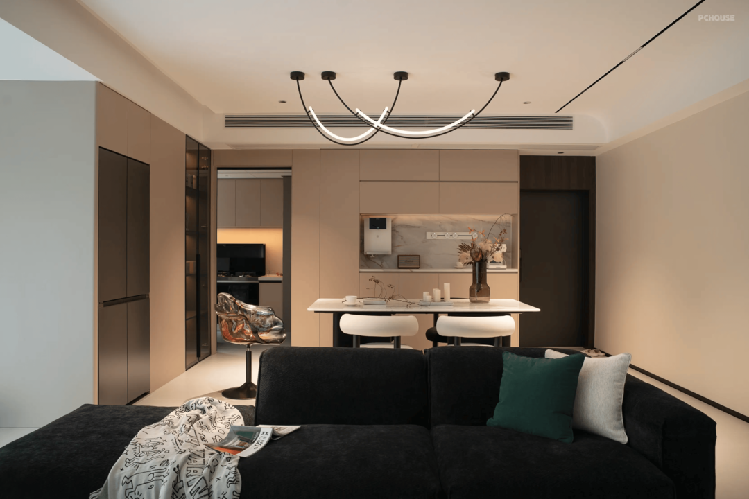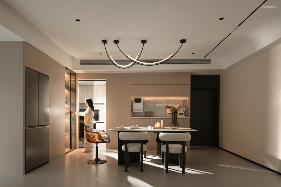 开阔的布局得益于一体化的设计手法,客餐厅以层层递进的贯通视觉,赋予空间无界的自由感。大面积米棕色与温润的木作进行调和,光影流转间,斑驳的肌理镌刻下时光沉淀的印记,呈现出生活的纯粹与平静。