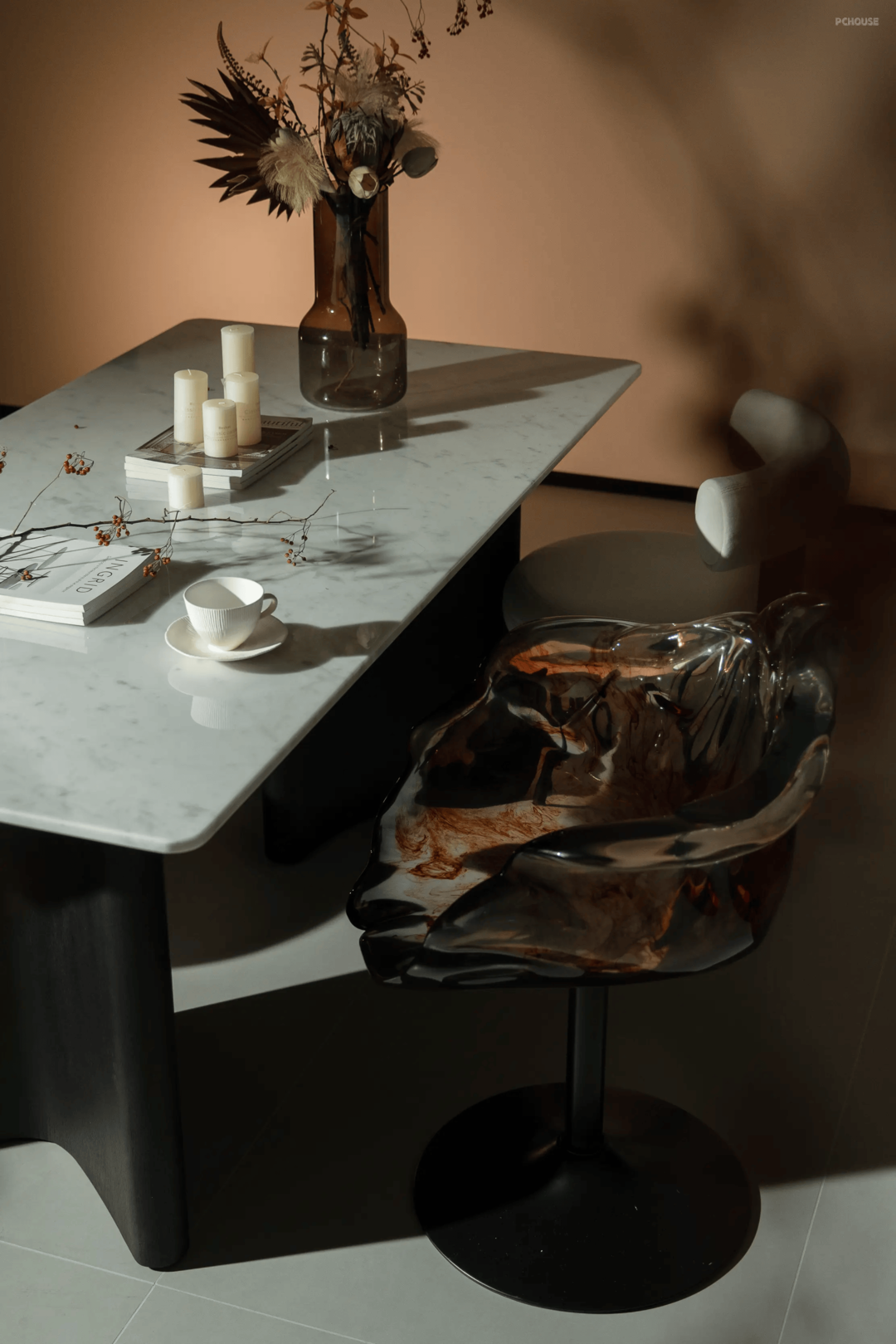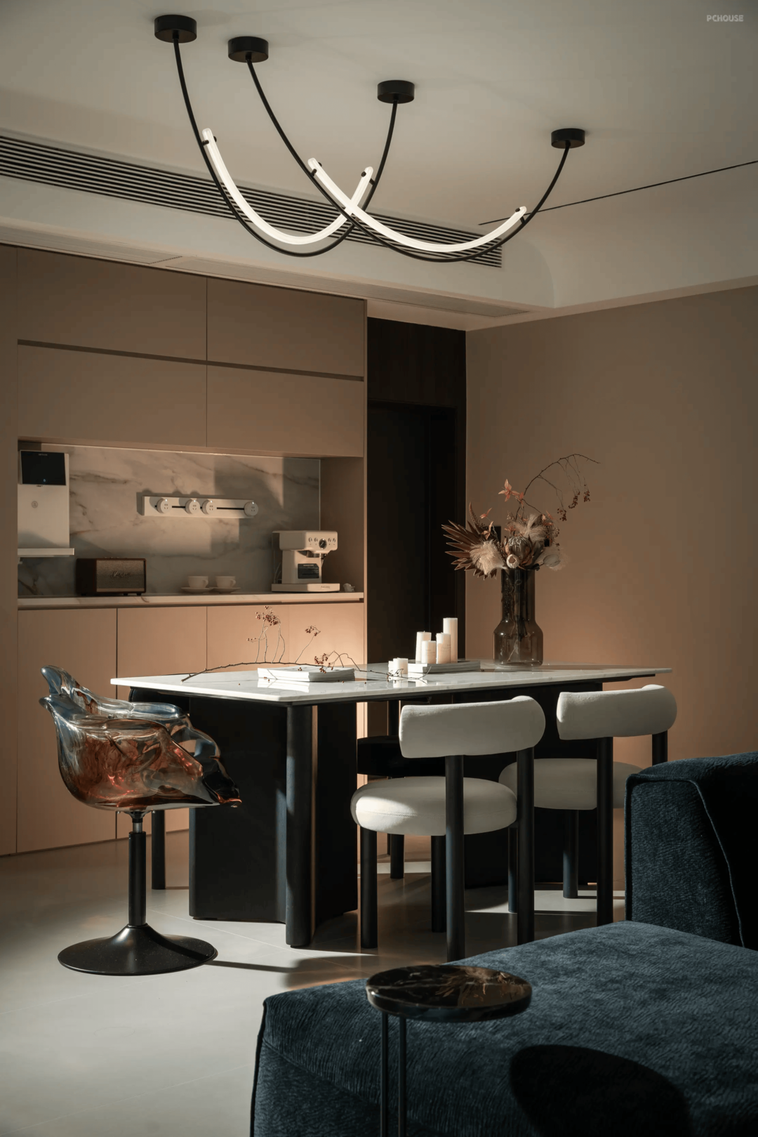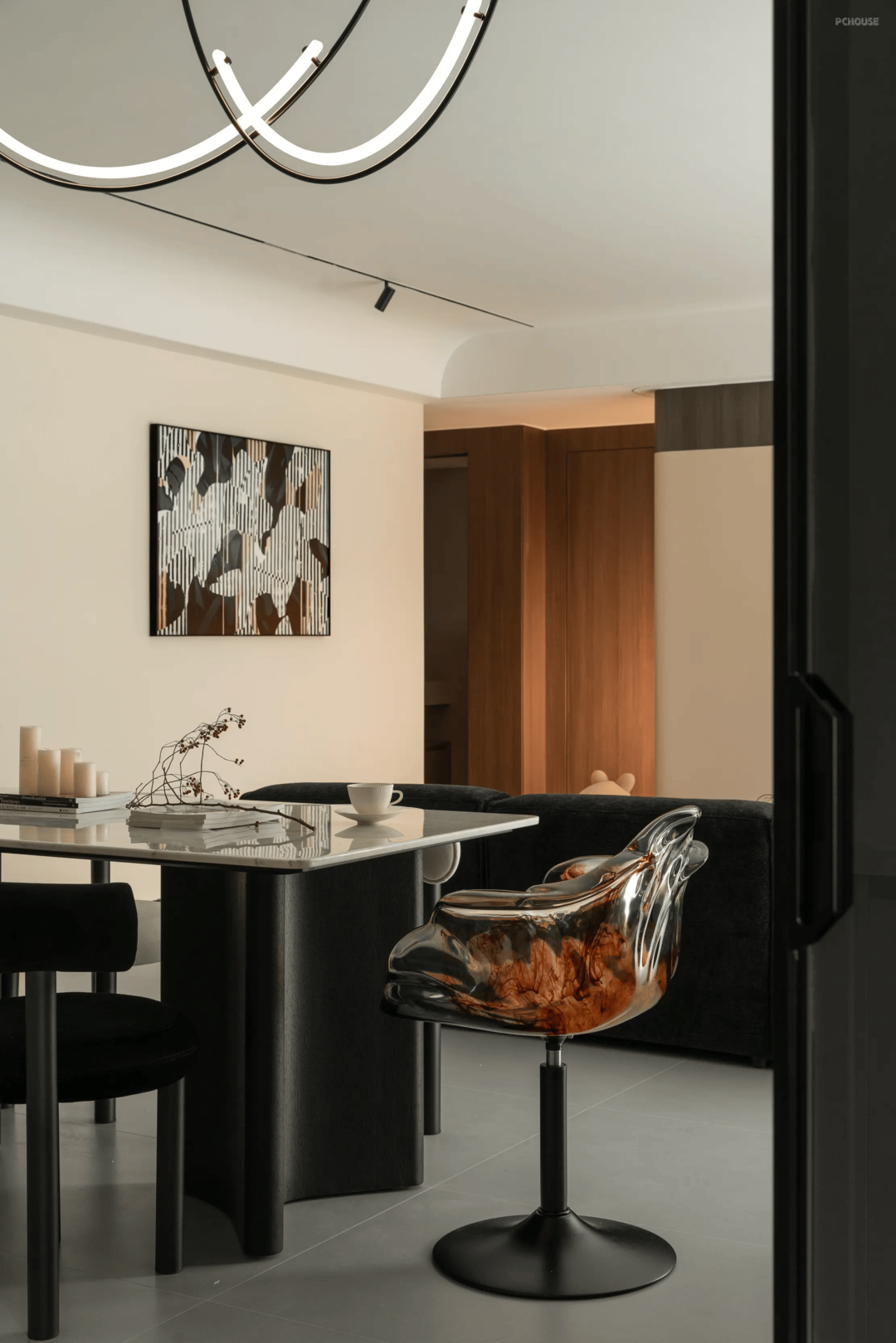 视线落向明媚的餐厅区域,大理石餐桌搭配弧线吊灯营造出优雅松弛的用餐氛围。透明的琥珀色单椅作为视觉中心,与盛放着绿植的玻璃花器形成呼应,让蕴有盎然生机的日常光景常在。餐桌后的鞋柜与酒柜以多元的形式延伸包裹着整个空间,丰富的储物方式让生活更加舒适有序。