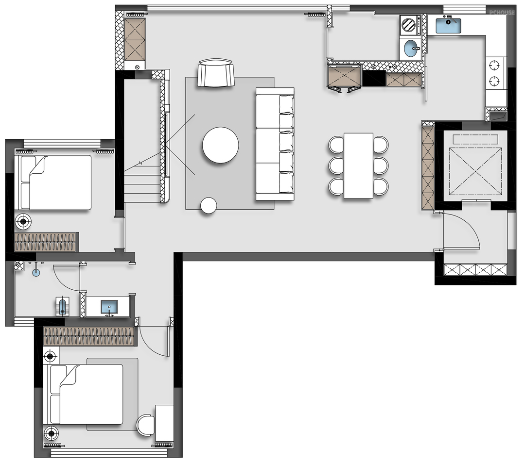 1. 把原始的楼梯结构迁移至电视墙后,既隐去楼梯形态提升美观度,又巧妙拓宽餐厅的使用面积,实现功能与美学的双重升级;