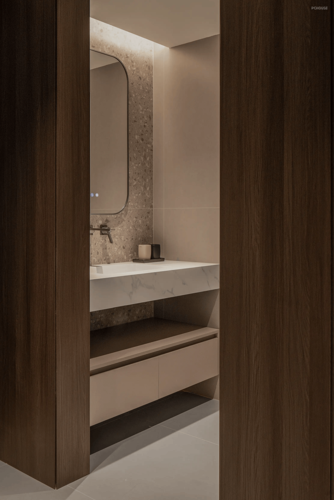 卫生间以浅色系的岩板在木质基调中绘就静谧与雅致。悬浮式的白色台盆在柔和的光晕中轻盈舒展,与水磨石墙面的自然纹理相映成趣,材质与光影的巧妙对话,将舒适惬意的空间情绪娓娓道来,让日常洗漱升华为富有仪式感的品质生活。