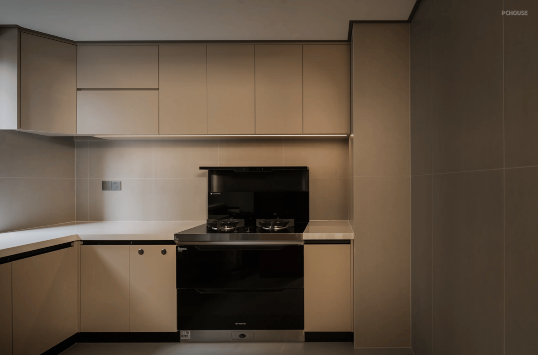 厨房以流畅的动线、充足的收纳,将柴米油盐的细碎安排的精巧得当。嵌入式黑色集成灶台与隐藏式灯带相得益彰,既勾勒出利落的几何轮廓,又营造出兼具实用功能与艺术氛围的烹饪场域,将日常炊事升华为品质生活的诗意呈现。