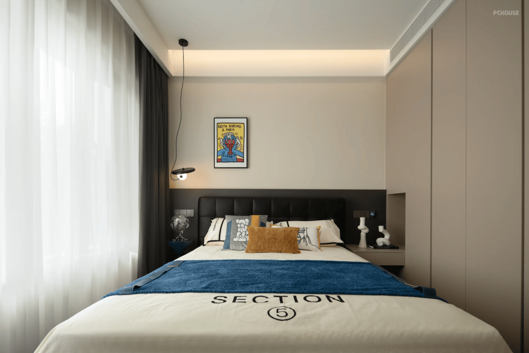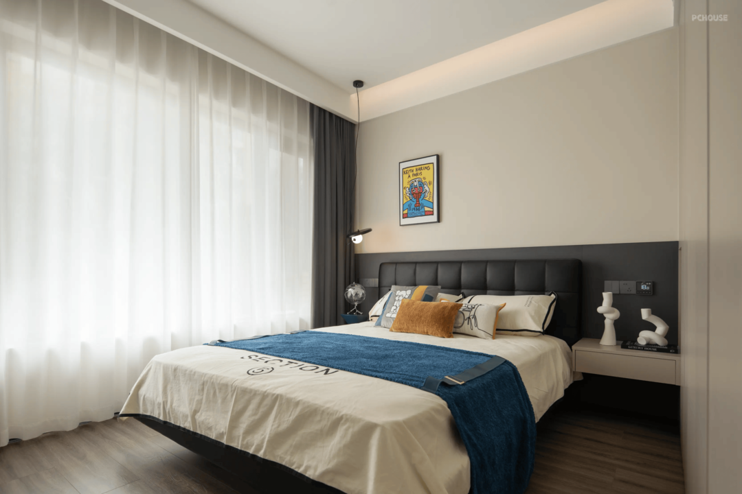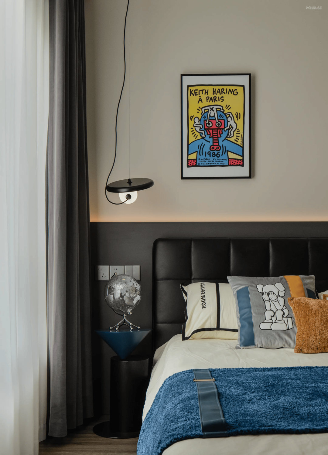 儿童房延续长辈房的表现形式,以简约的风格、现代的设计手法,打造出充满秩序又舒适安逸的当代居住空间。凝练的中性色调铺陈沉稳底色,点缀以明快的蓝橙跳色,在保持整体格调的同时,迸发出蓬勃朝气。黑色真皮床头与缤纷的几何抱枕碰撞出时尚格调,艺术挂画与造型灯具则交织出活力场域,每一个细节都在实用功能与艺术趣味间取得精妙平衡,既满足日常的起居需求,又营造出舒适且高级的氛围