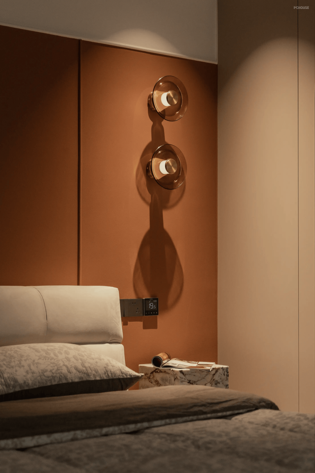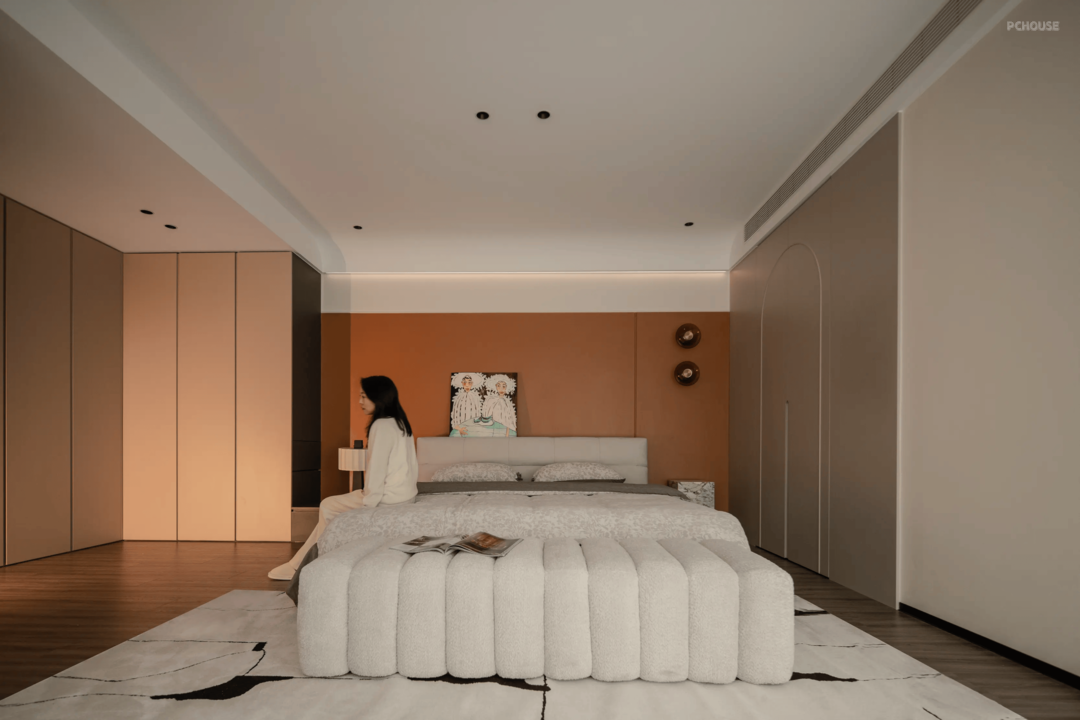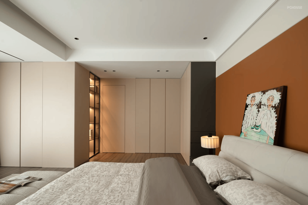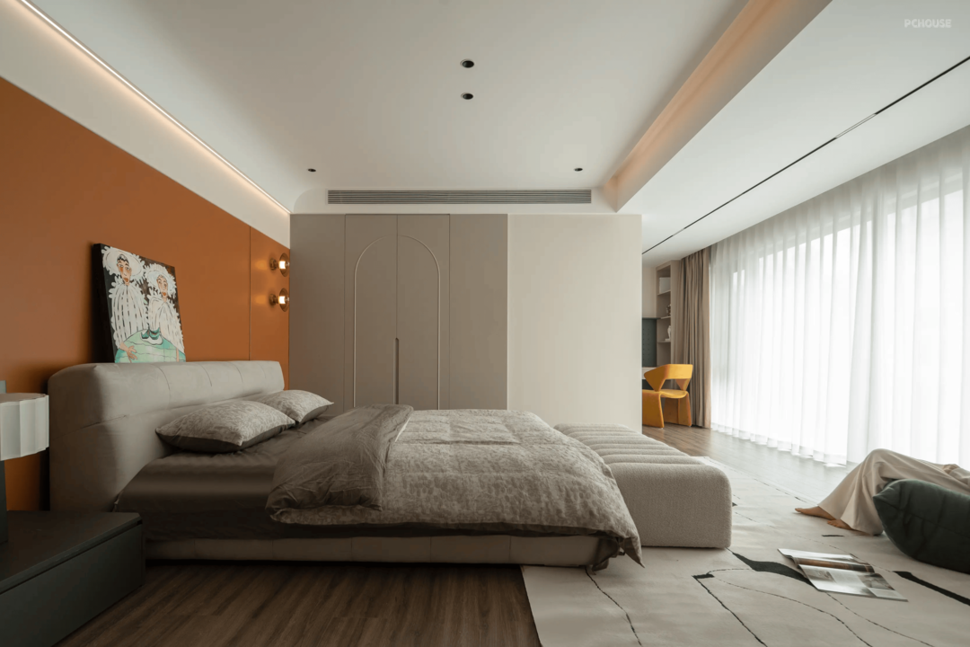 主卧以人性化设计为核心理念,巧妙重构功能分区,将办公、休憩与收纳等生活场景有机融合。我们以流畅动线串联起空间的多元场景,睡眠区两侧"藏露有致"的衣帽系统,在一隐一显间,储纳着私密与共享的生活节奏。背景墙缀以跳脱的橙色作为点缀,打破单一感的同时激荡出场域的生命力,在理性布局中绽放感性表达。