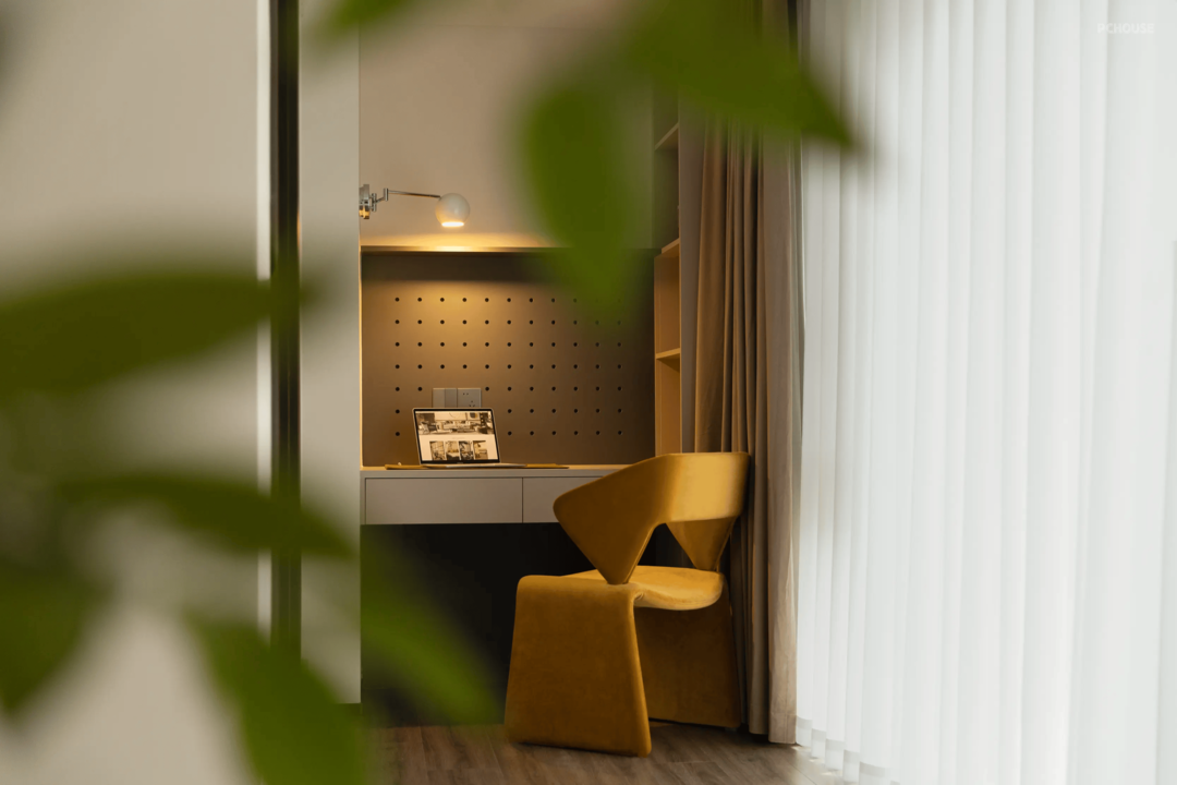 书房以通透的玻璃砖与梯间为界,在卧室一隅开辟出独处的精神领地,思绪与阳光在此自由穿梭,为创作注入灵感活力。悬浮式书桌与多功能洞洞板巧妙组合,既满足收纳需求,又成为个性展示的艺术墙面,将生活意趣延伸至精神世界的每个角落。