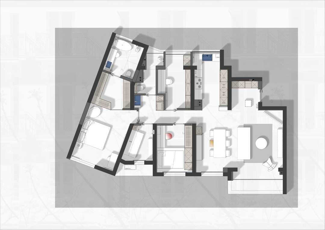 2. 闲置北阳台高效利用,将拉通的阳台一分为三,分别纳入厨房、书房与客卫。尤其拓展了客卫的空间,使得客卫实现三分离,方便多人同时使用卫生间。