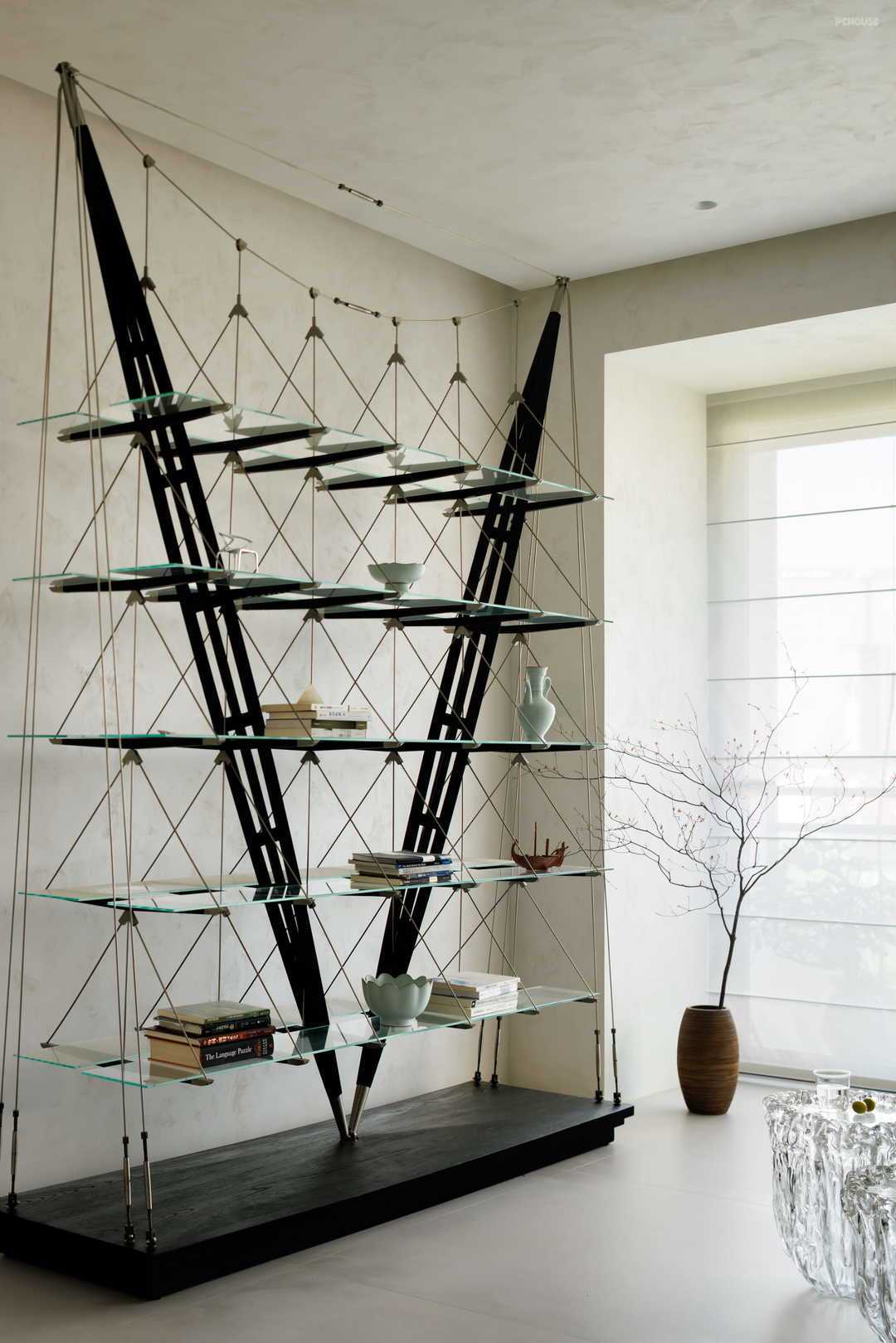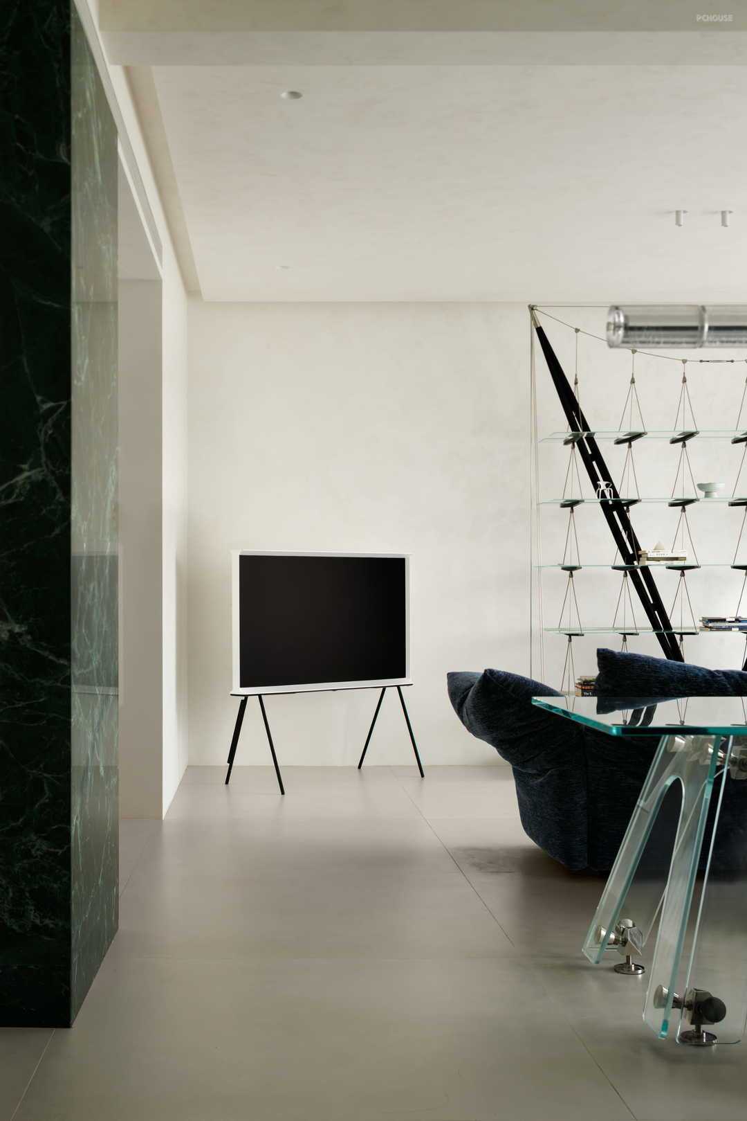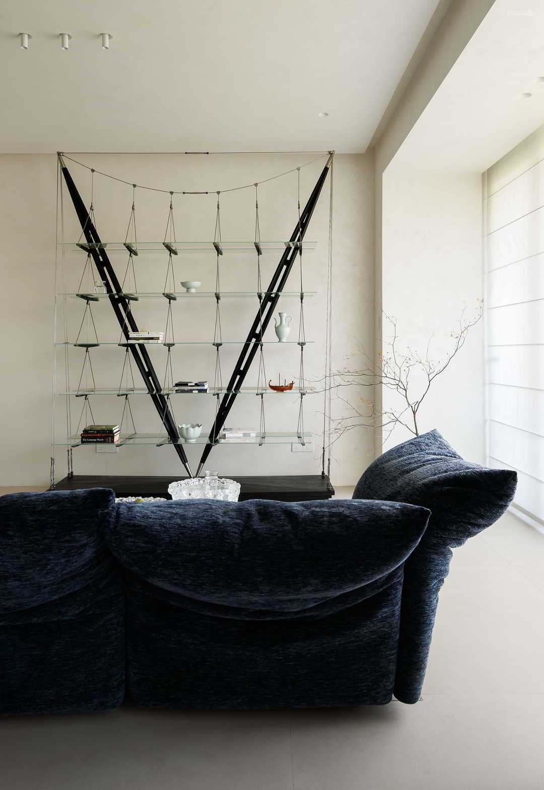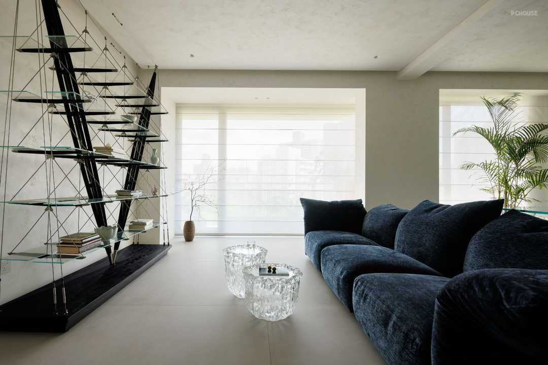 点睛之处是不走寻常路的客厅墙面,设计师完全抛弃略显厚重的柜体,以玻璃隔板、金属支架、黑色木板构建了既承担功能又体现美感的置物架。交错的点、线、面让客厅空间有了透气感。置物架形似船索、缆绳的样态,又呼应玄关处的绿色大理石“海面”,营造统一风格与意境。