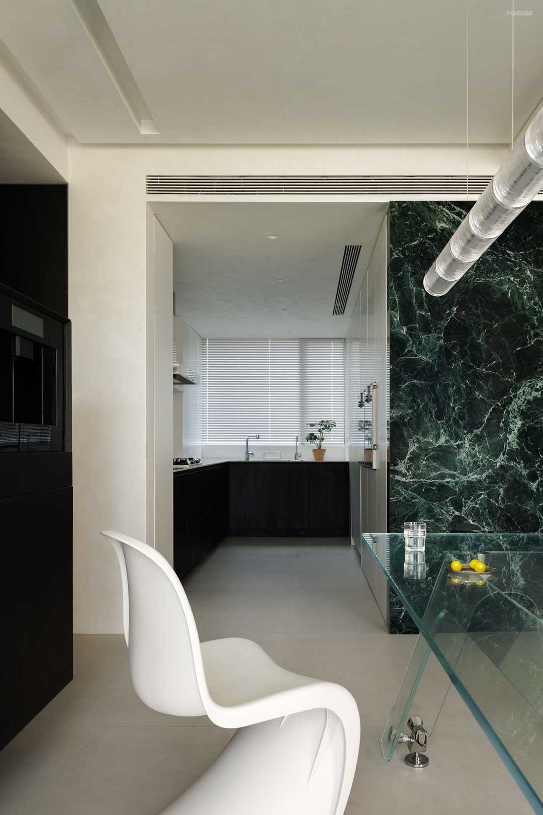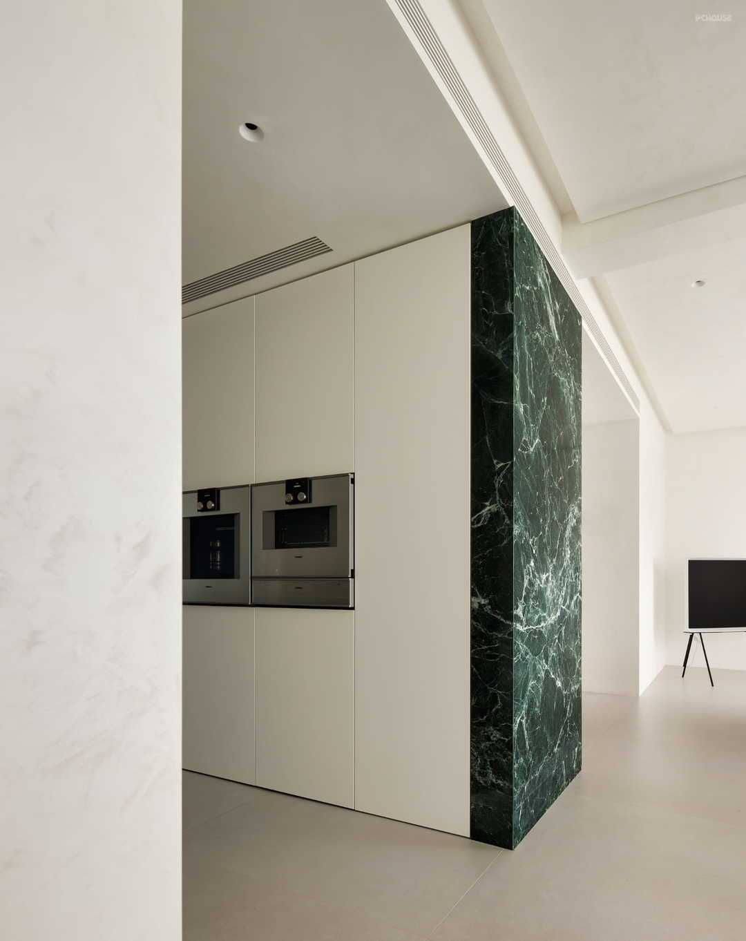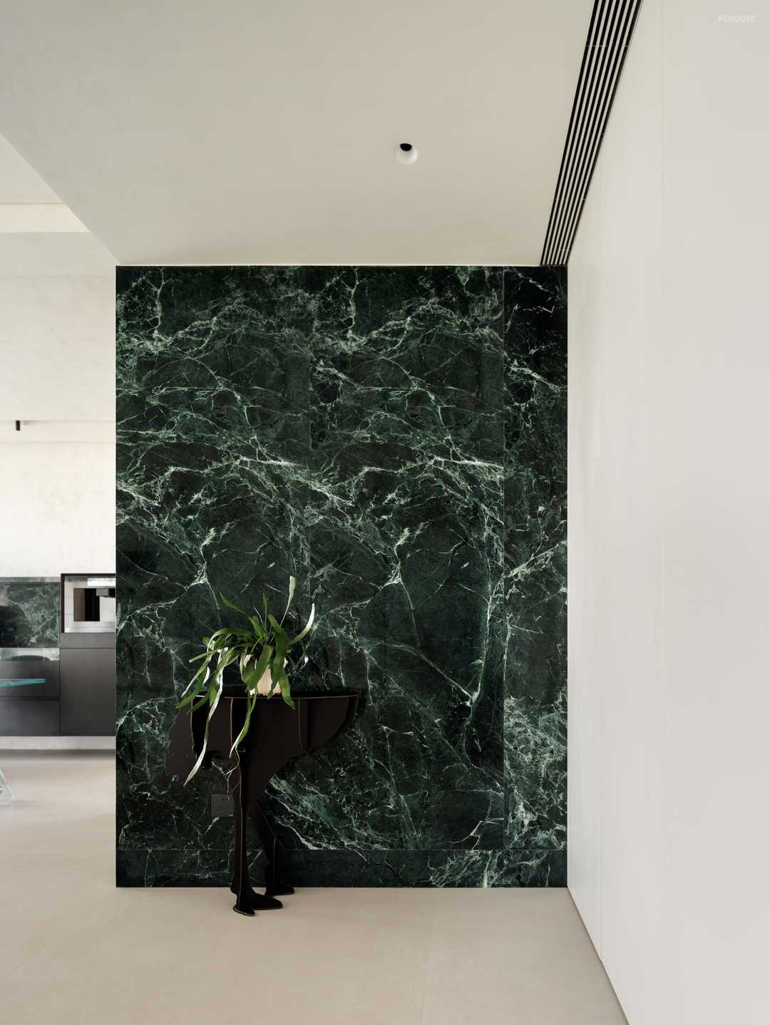 迈入玄关,整面绿色大理石墙措不及防冲进视线,好像亲临深海之上,看海面波涛翻滚。在白色墙面的衬托下,给人一种神秘、大气之感。更妙的是,这种生机盎然的绿也顺势延展,以一种流动感衔接至厨房空间,让整个玄关处成为整个公区的视野核心之一,无论在客厅的哪一处,目光中都可以锁定这抹绿,既简洁也不失高级,更是赋予整个家一种生机感。