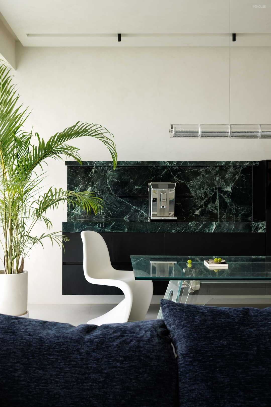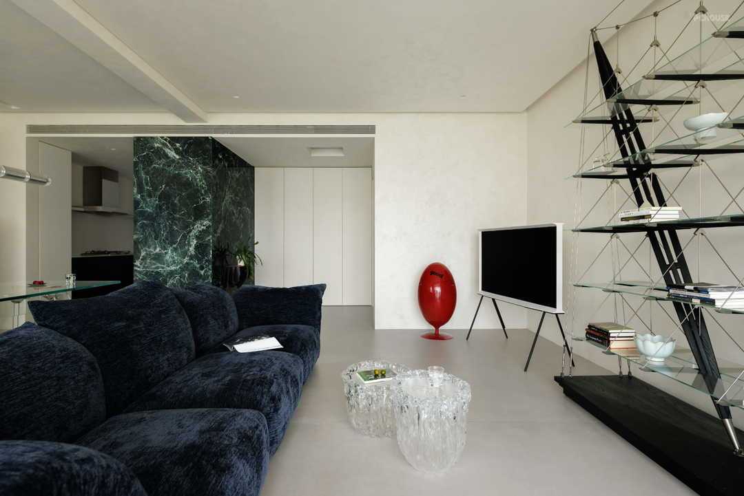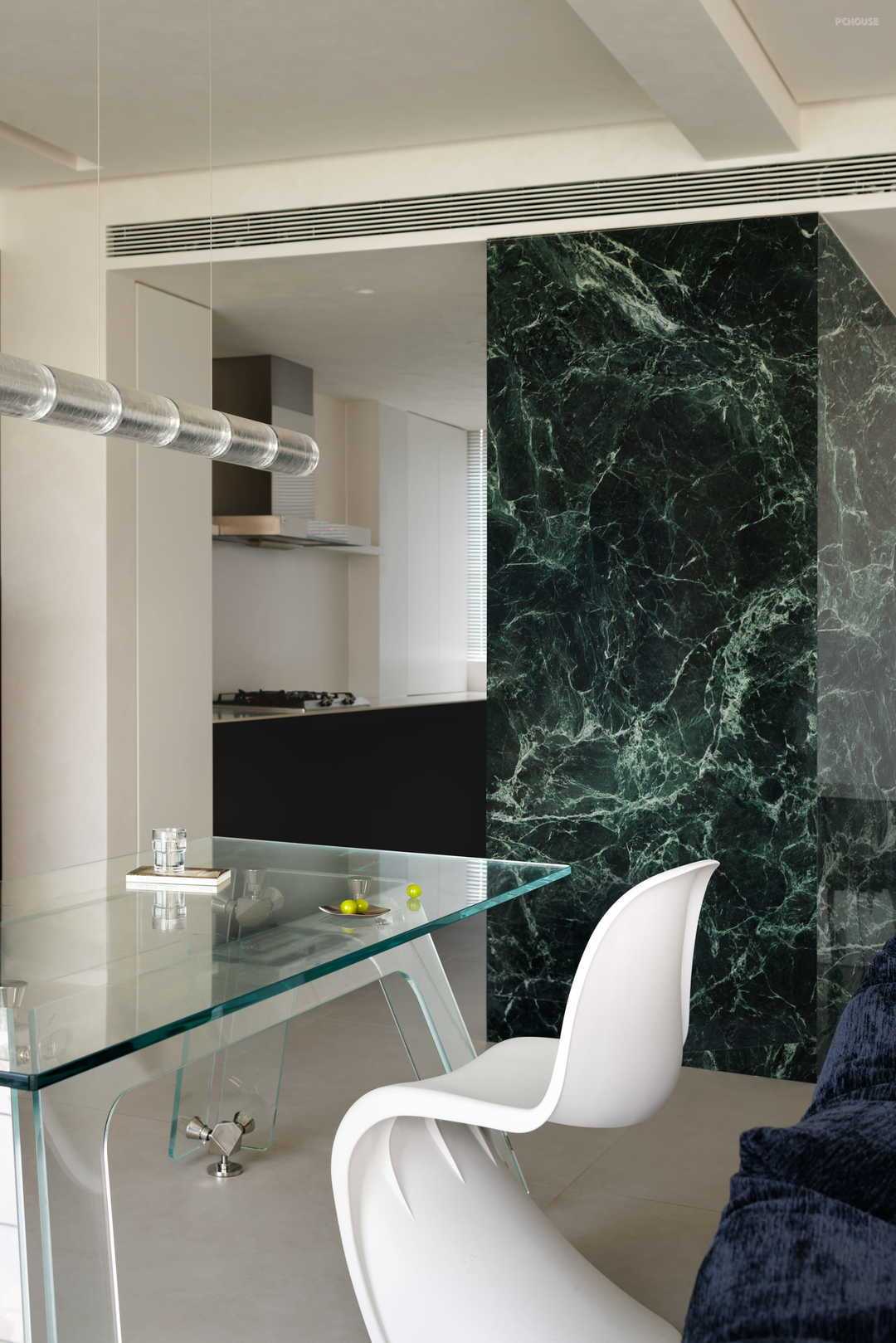 迈入玄关,整面绿色大理石墙措不及防冲进视线,好像亲临深海之上,看海面波涛翻滚。在白色墙面的衬托下,给人一种神秘、大气之感。更妙的是,这种生机盎然的绿也顺势延展,以一种流动感衔接至厨房空间,让整个玄关处成为整个公区的视野核心之一,无论在客厅的哪一处,目光中都可以锁定这抹绿,既简洁也不失高级,更是赋予整个家一种生机感。