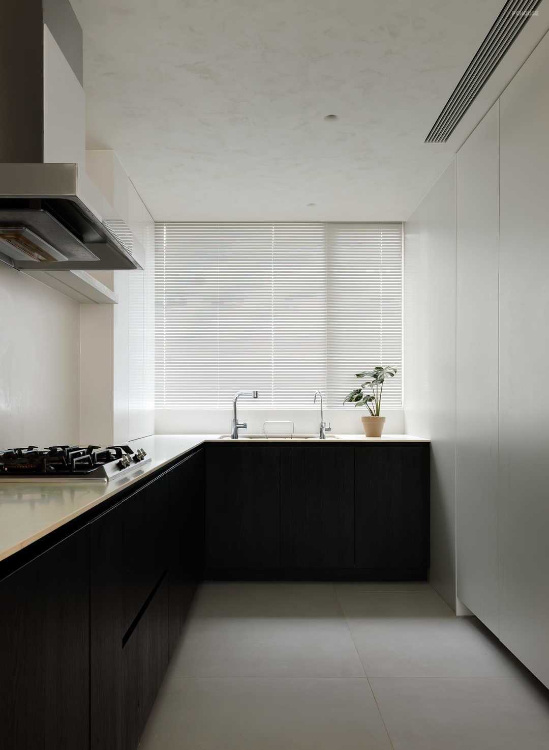 厨房设计一面墙的整体隐藏式高柜,黑白色的主基调与整体的简约风格一致,电器也均能安置于高柜中,让厨房保持了极简风。