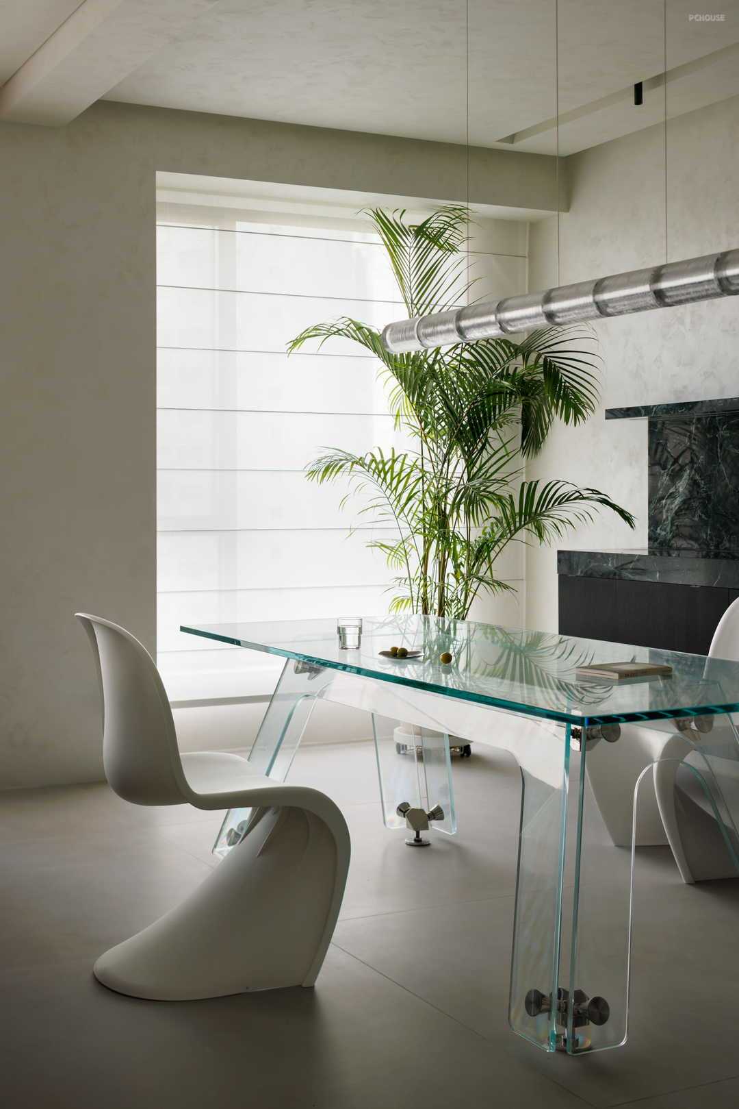 白色墙面若隐若现的暗纹,犹如隐隐绰绰的山水画,为整个空间再赋予一丝沉静之感。白色tradition吊灯与墙面艺术漆颜色一致,又以点、线的几何形式,与墙面结合,以低调之姿给予空间一丝情趣。