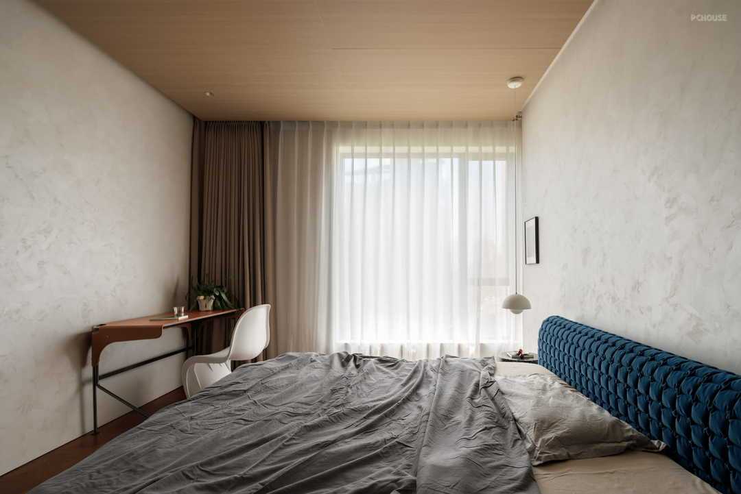 进入私区,虽仍是简洁风格,但木质地板与木饰顶面瞬间营造了与公区不同的温润感。蓝色的墙面与同色系的床背也给予一种踏实、舒适的感受,每一个细节都宣告着这是让人放松的休憩之所。