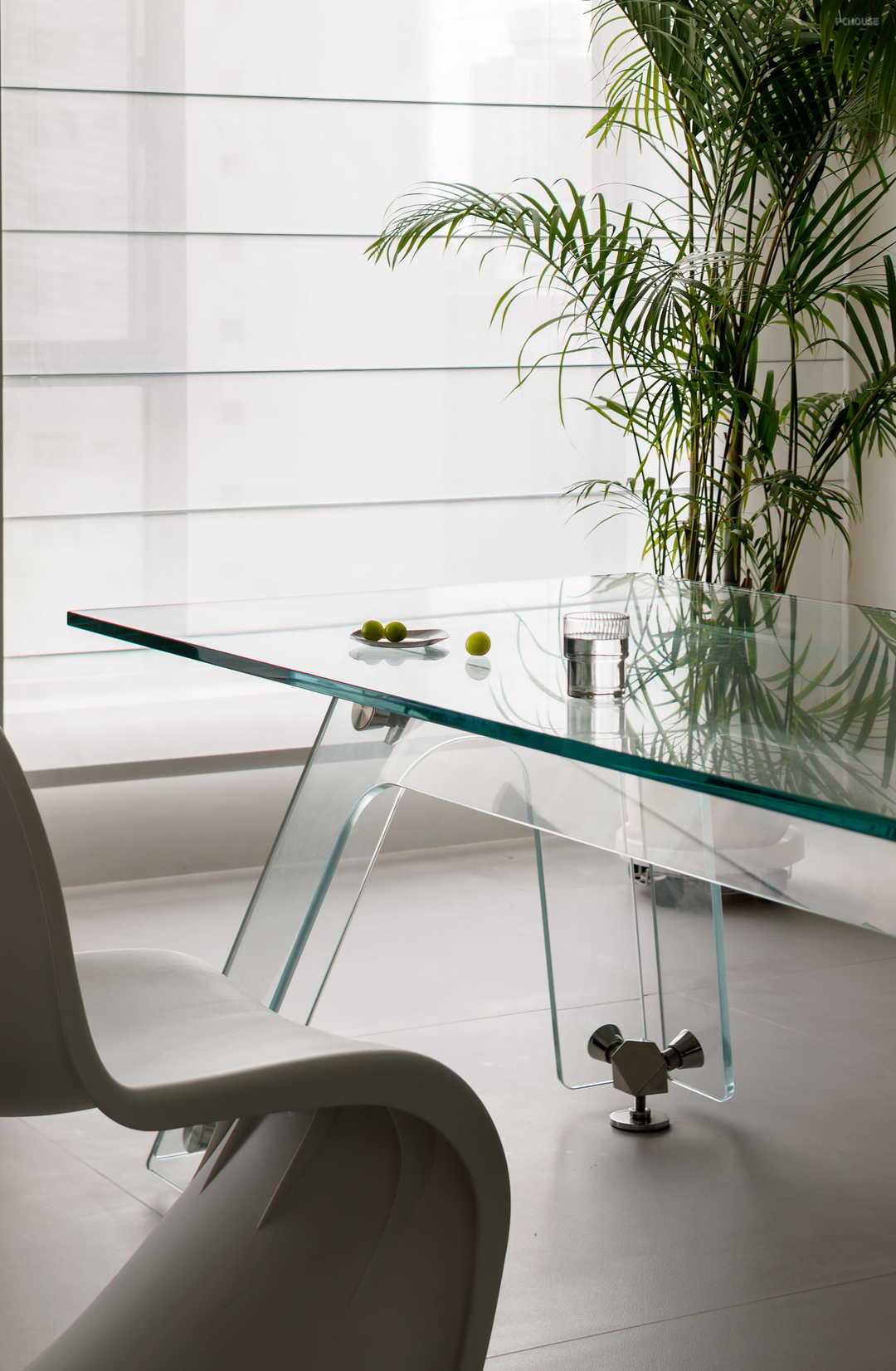 透气性是餐厅给人的整体感受,这种感受来自于餐桌的材质以及悬空餐边柜的设计。餐厅不仅在空间上与客厅融合,在风格上也延续客厅的简洁与大气,以玻璃面餐桌作为分割空间的中心,餐桌在材质选择上与置物架隔板一致,透明的色调赋予空间简洁通透的属性。