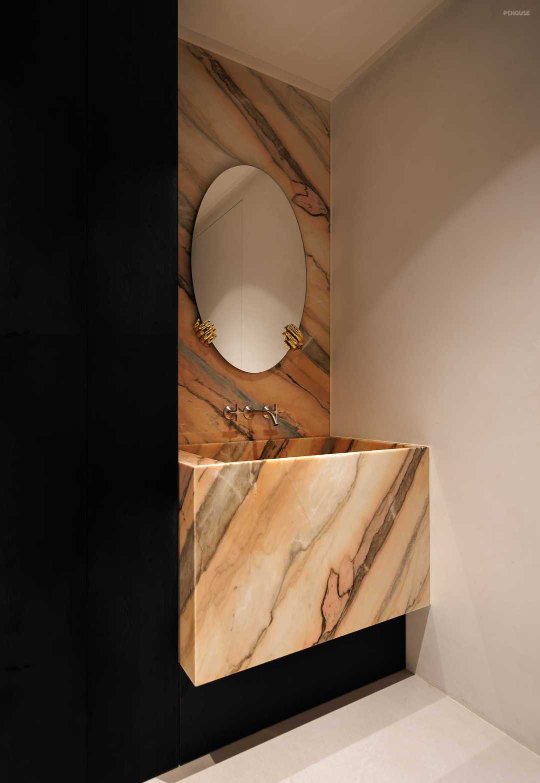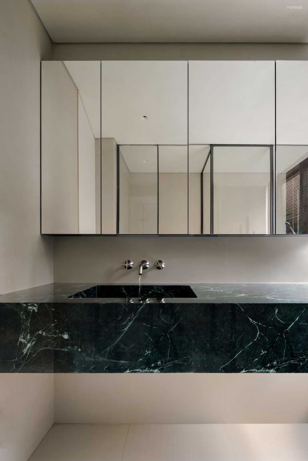 卧实现套房化,融合衣帽间,三分离卫生间,打造更方便的生活动线。管线、龙头埋入墙体,增加美观度,尽显极简风。同时,主卧卫生间的台面依然延续玄关处的绿色大理石,为整个房屋的统一性再加一笔,更体现了设计师的整体规划能力。