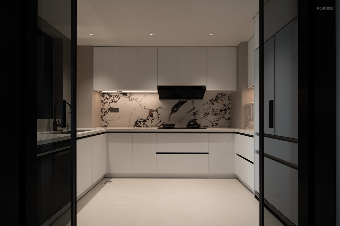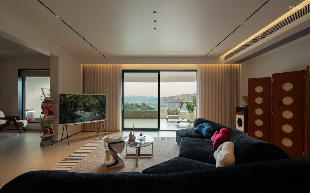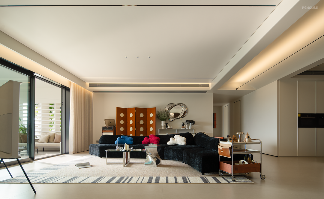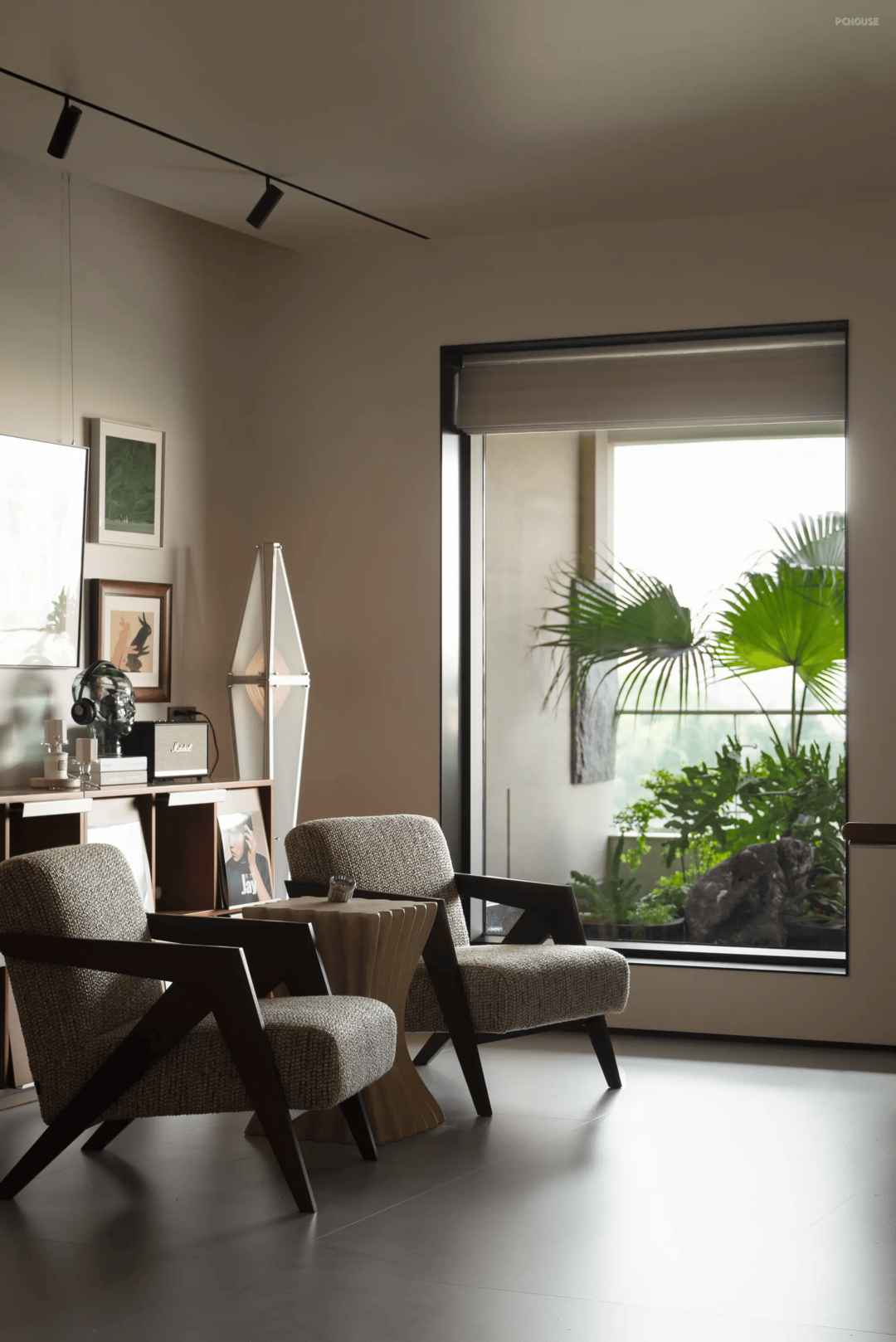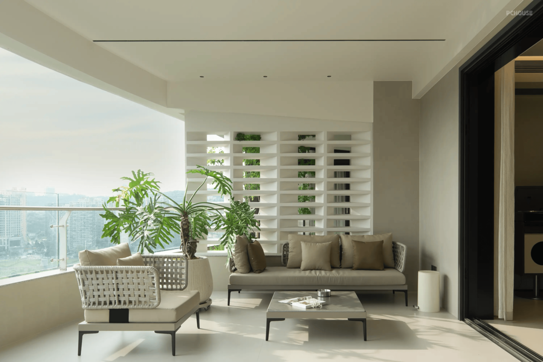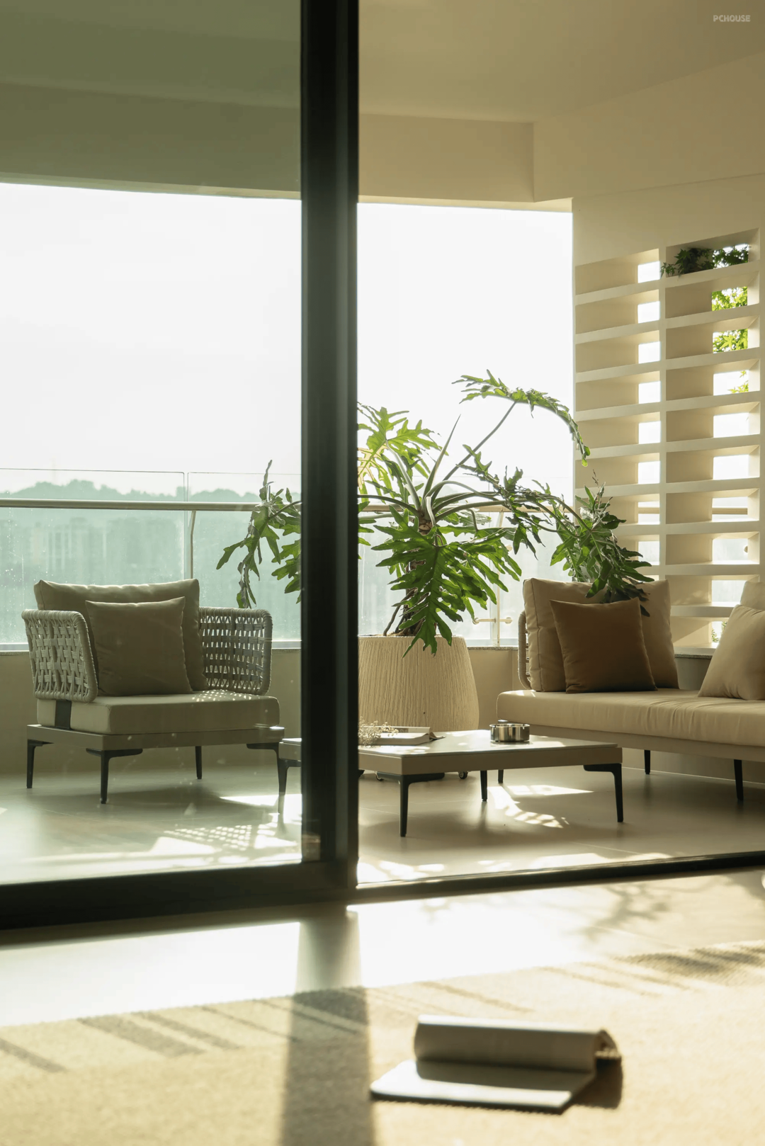 阳台与客厅联动互通,自然光线得以自由穿梭,在空间中描摹出明亮通透的生活图景。纯白格栅借镂空设计,将斑驳日光与盎然绿意编织成画,室内外的分野被温柔模糊,生活的诗意在光影交错间自然生长。