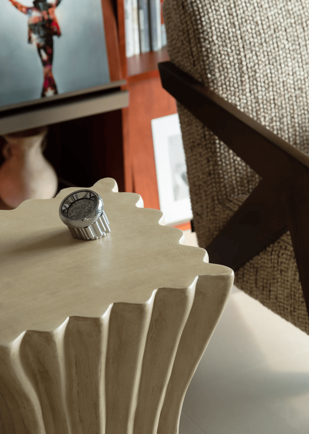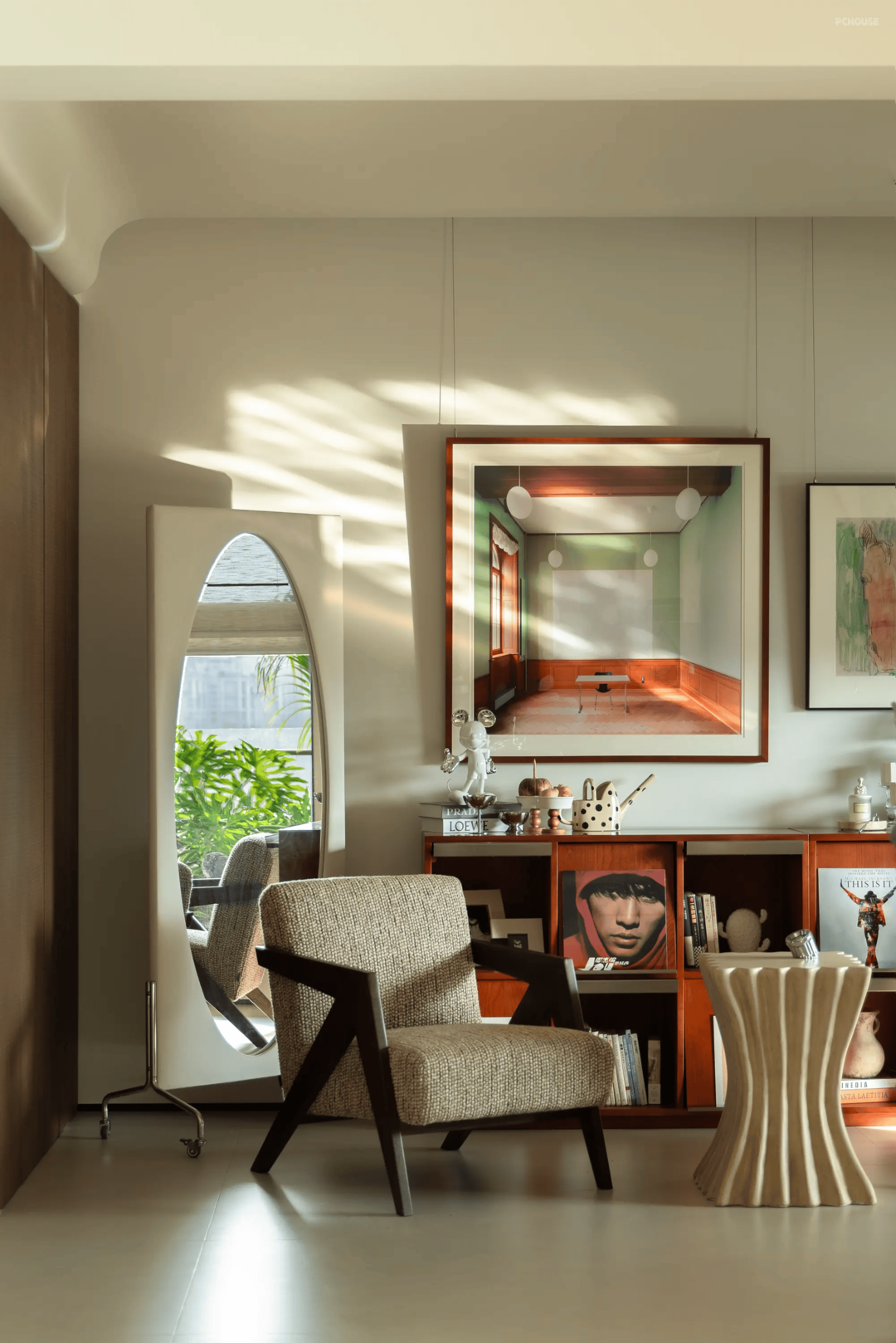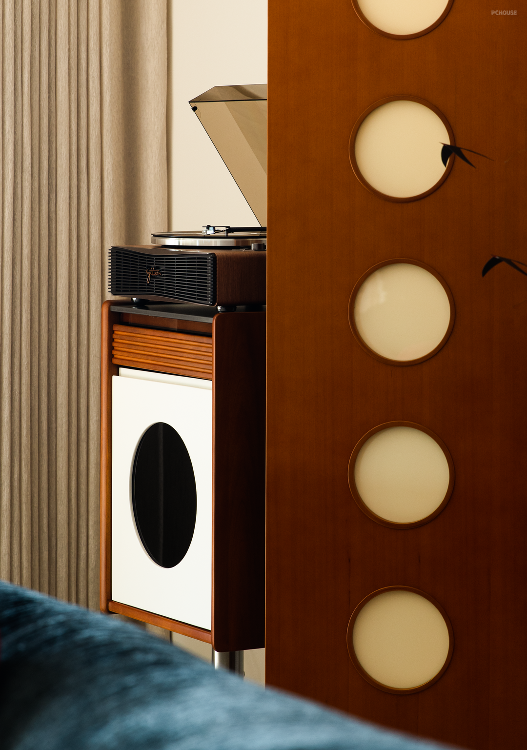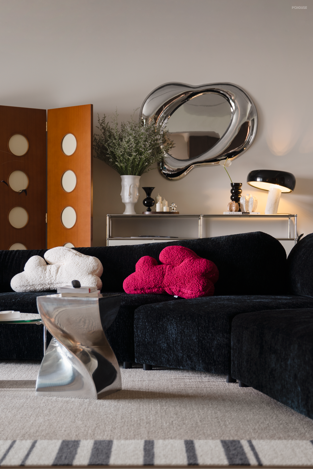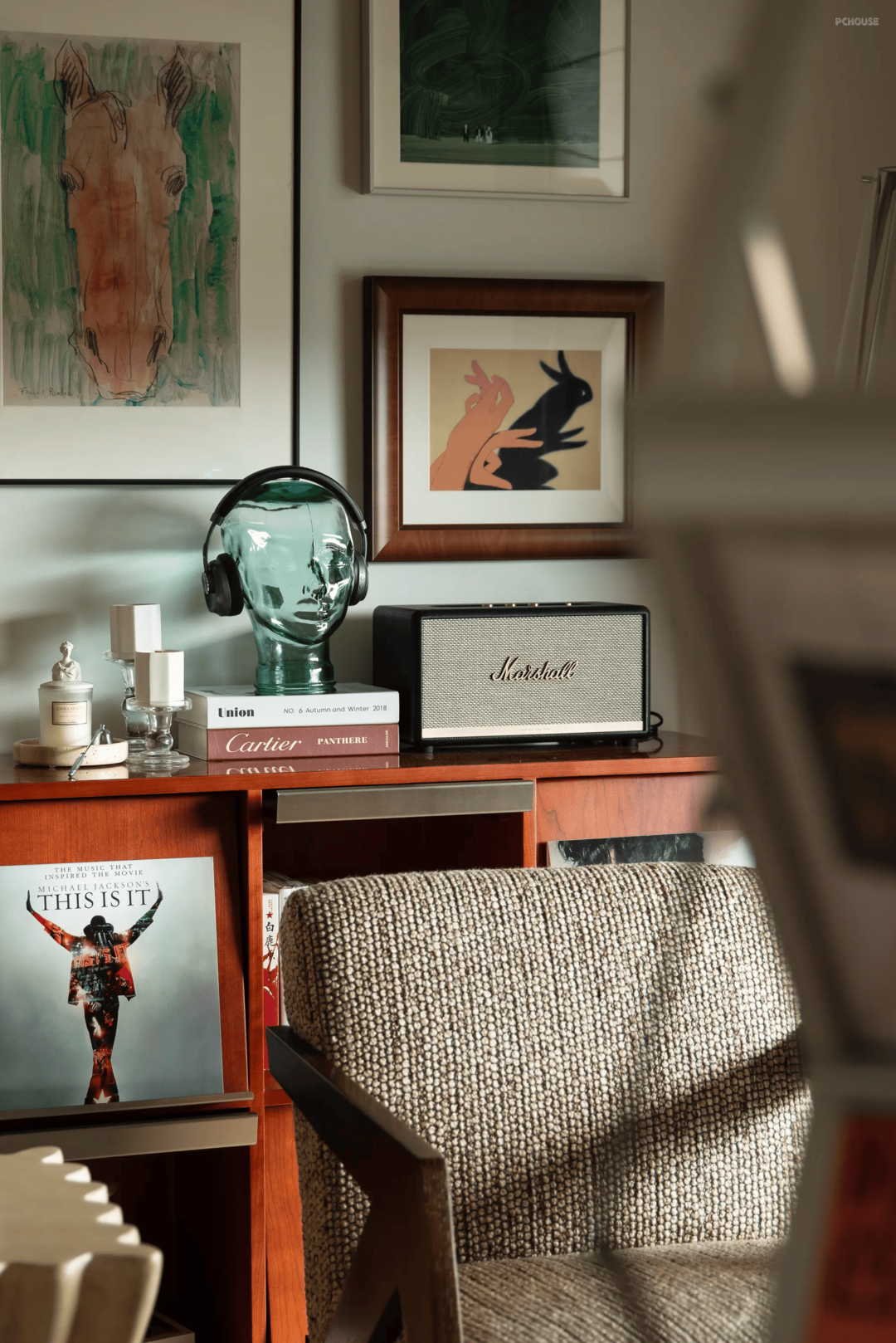 客厅似自由生长的浪漫容器,任婆娑光影与多元色彩在其间肆意绽放,将温暖的期许与生活的理想娓娓道来。深邃的沙发以包容围合之势,圈起一隅自洽与恬淡。其后,一扇木质中古屏风静静伫立,温润的木纹与黑胶唱片机流转的密纹彼此唱和,在流动的空间中谱写出一首关于质感与岁月的叙事诗节,让每个角落都成为承载生活艺术的展示剧场。