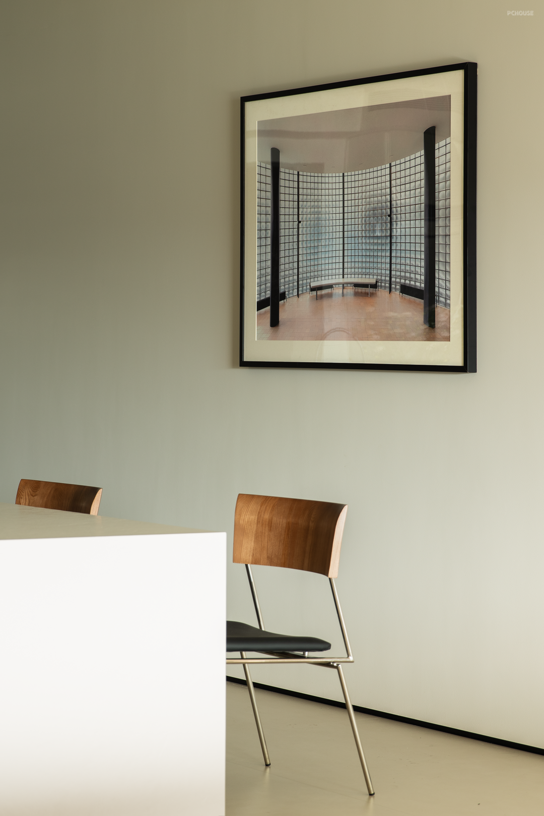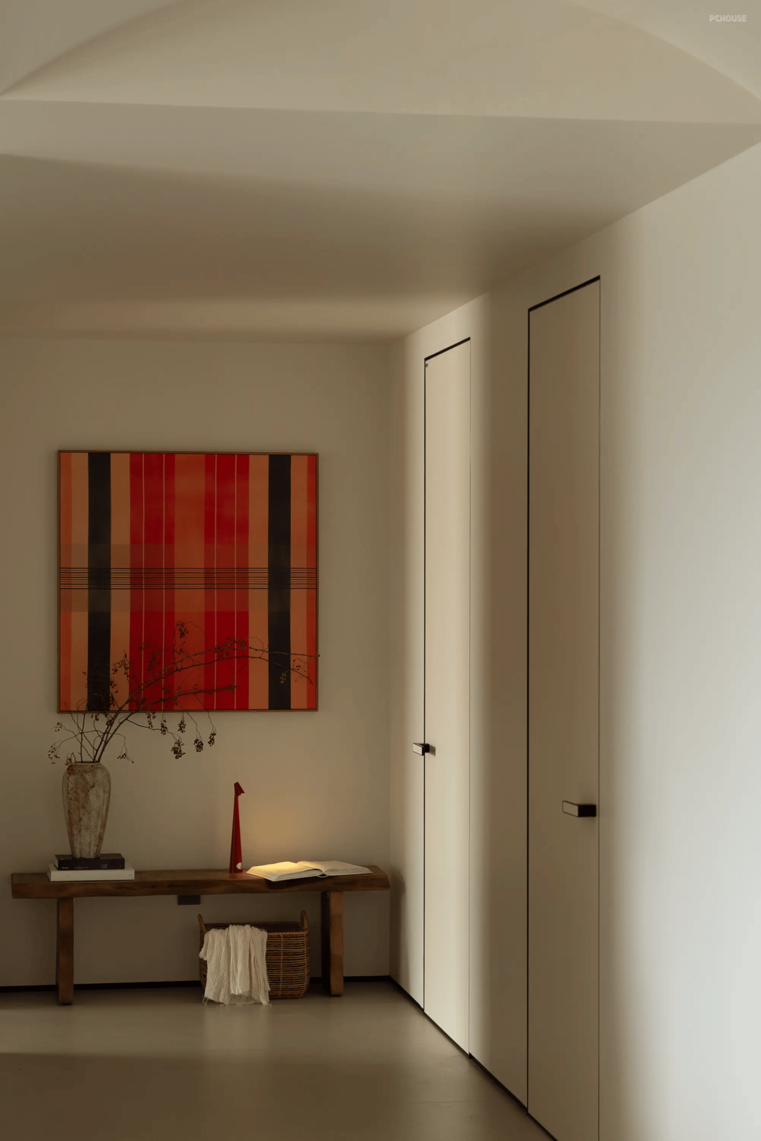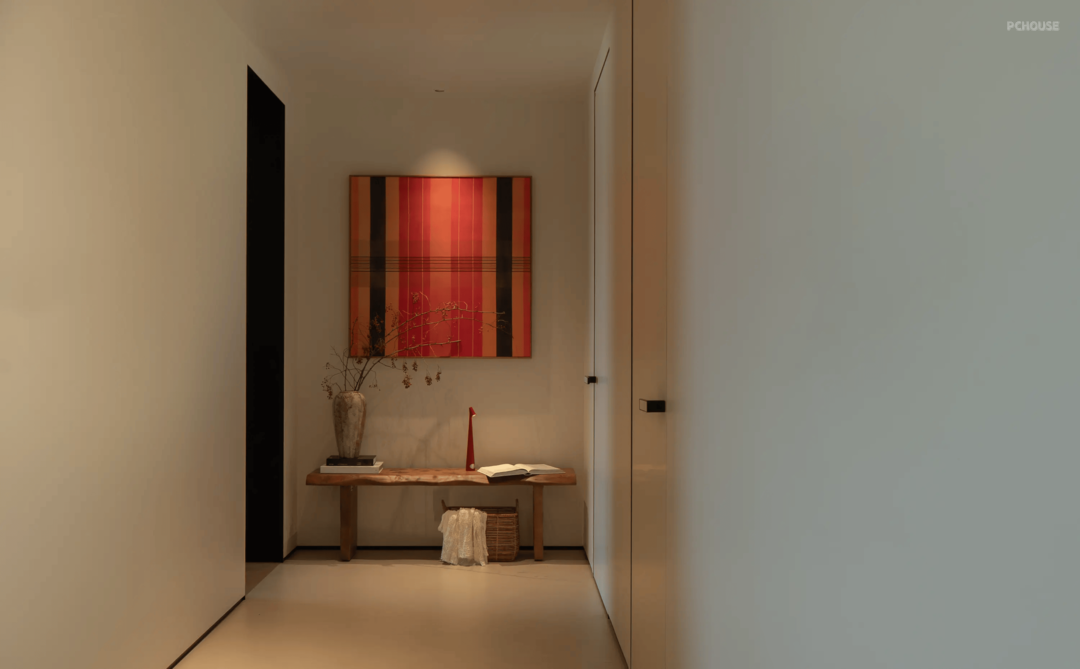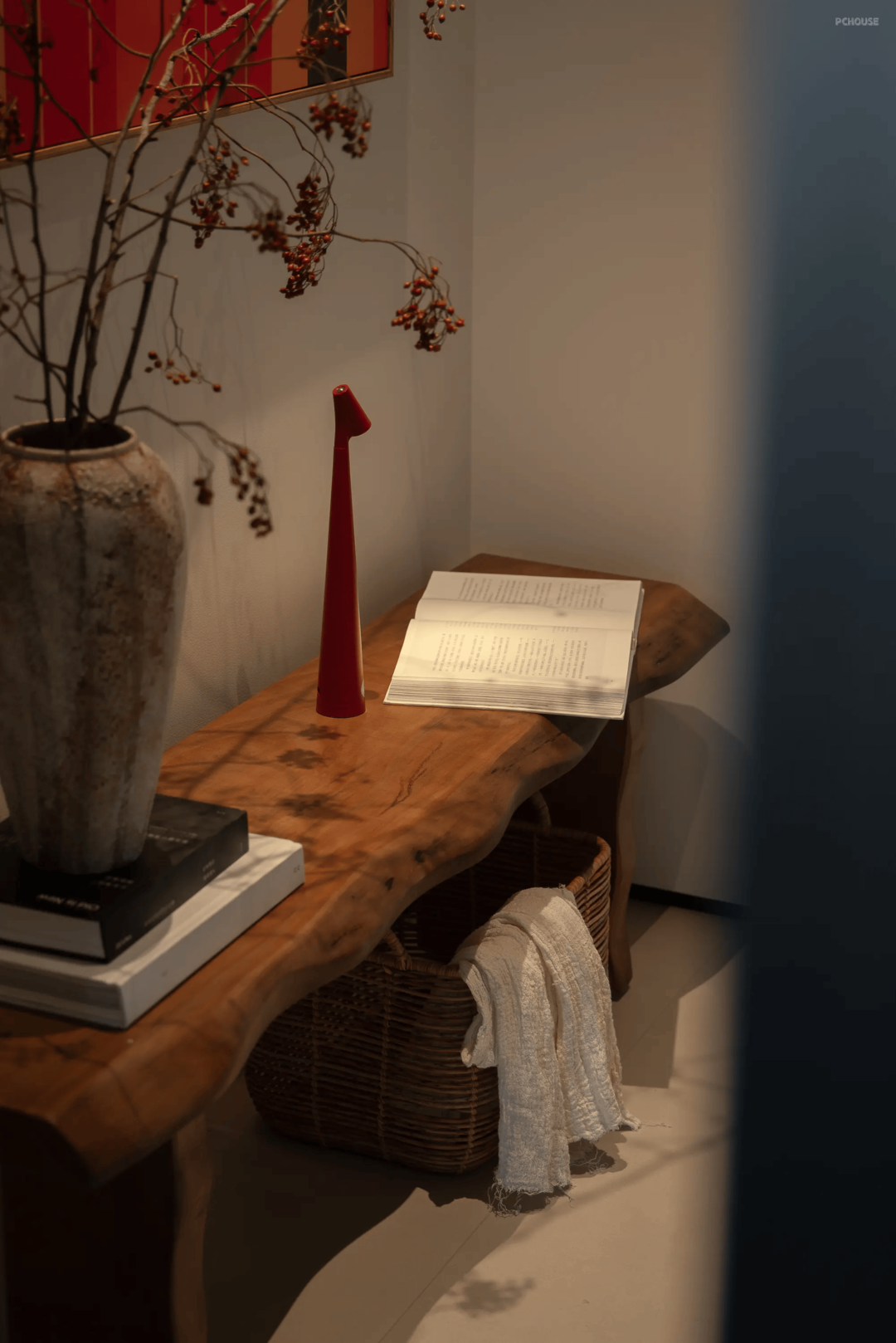 廊道末端以艺术画作为视觉焦点,与未经雕琢的原木台面、虬曲的枯枝花器共同给予空间自然的感受。温煦的光线在墙面、地面与器物间肆意游走,描摹出明暗交织的立体光影,生活的诗意也随之缓缓铺陈。
