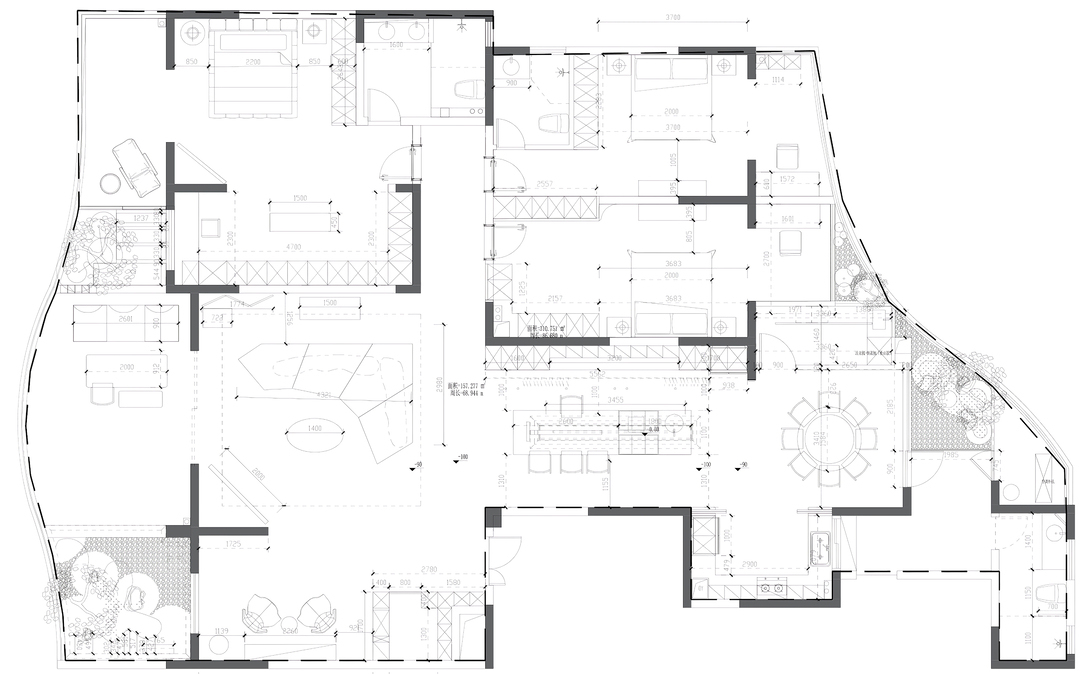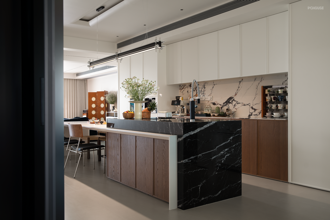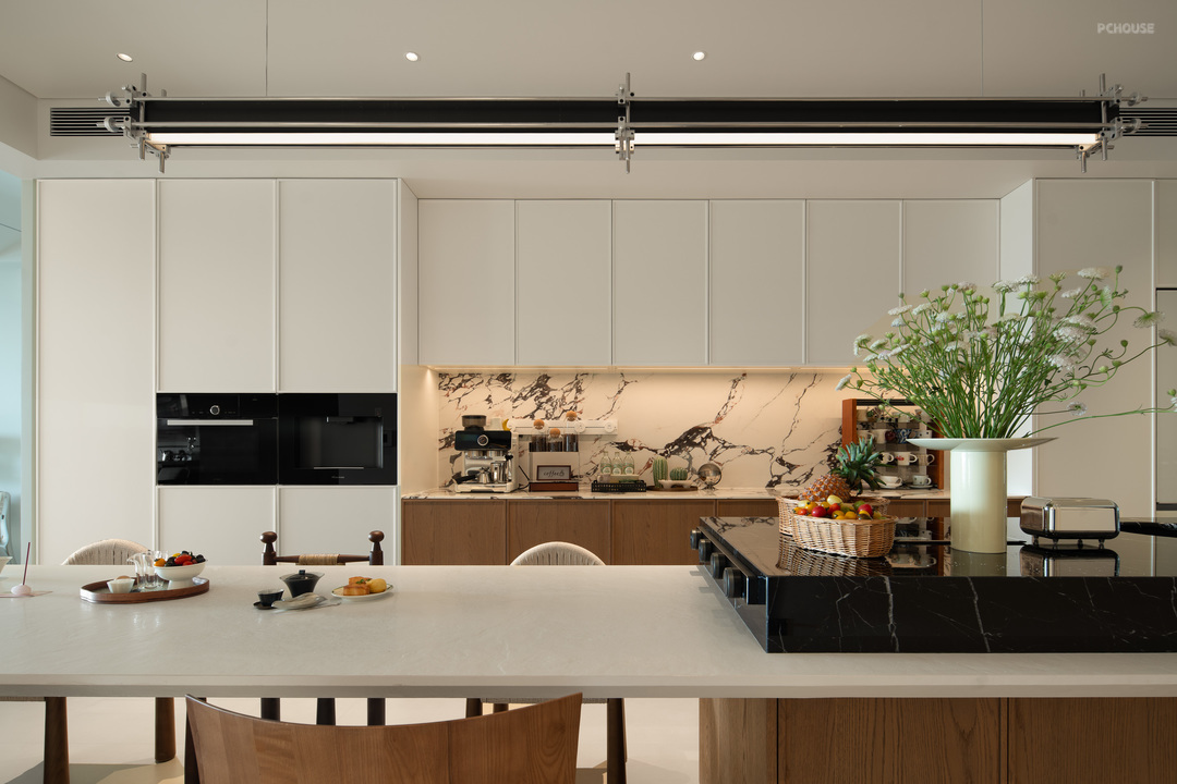 餐厅被打开后,以自由流畅的动线与岛台、厨房形成互动关系。温润的木质圆桌作为空间锚点,与垂落的弧形吊灯相呼应,构筑出优雅的视觉韵律。窗外婆娑绿意若隐若现,每一次入席,都似与静谧雅致相拥,将寻常餐叙升华为诗意的生活仪式。