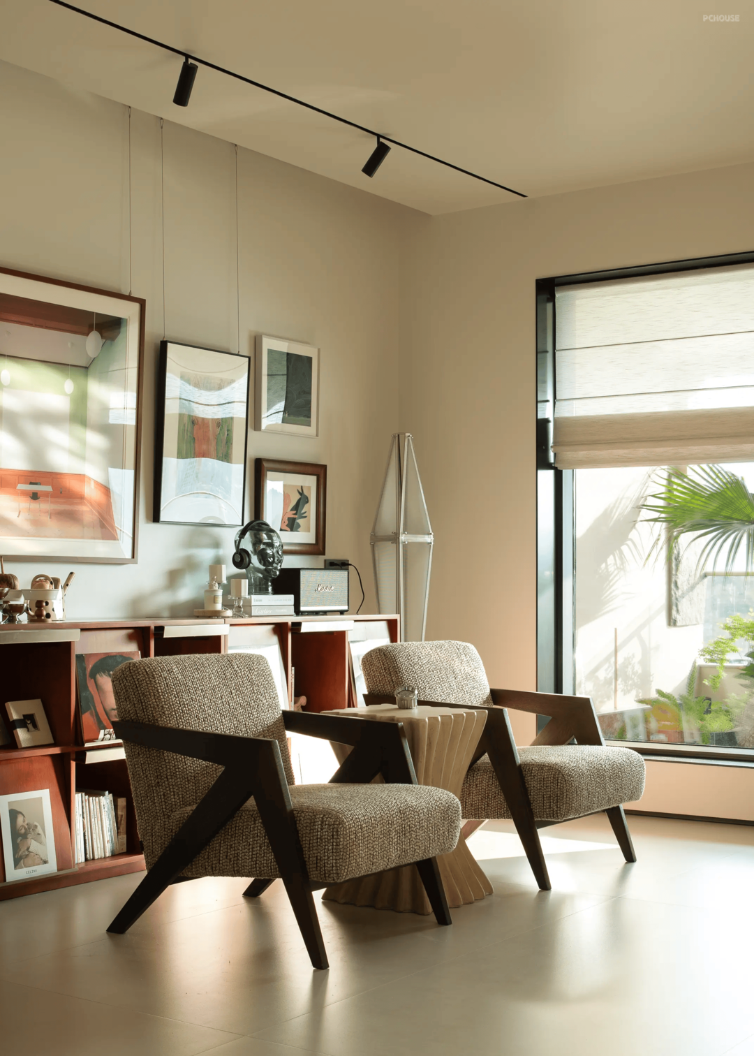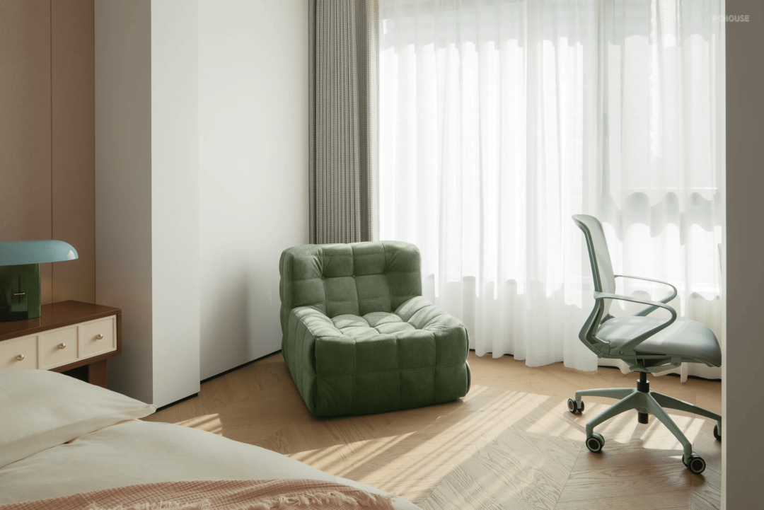 我们以释放空间为起点,在原有户型的基础上着重调整房屋格局,改变孤立的空间关系,使公区呈现开放式布局。晨光漫溯,在布艺椅面与白墙间晕染出朦胧光晕,两把扶手椅静待来客,让每一隅都浸润在慵懒文艺的治愈氛围里。