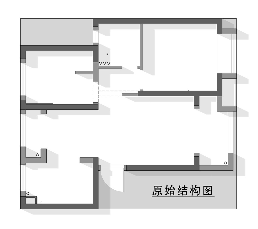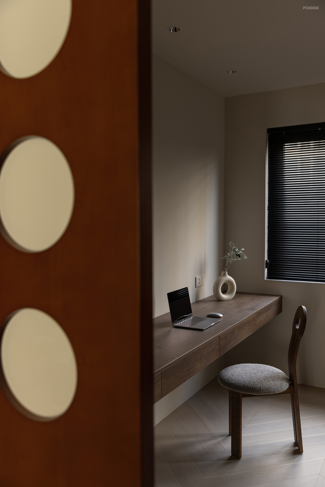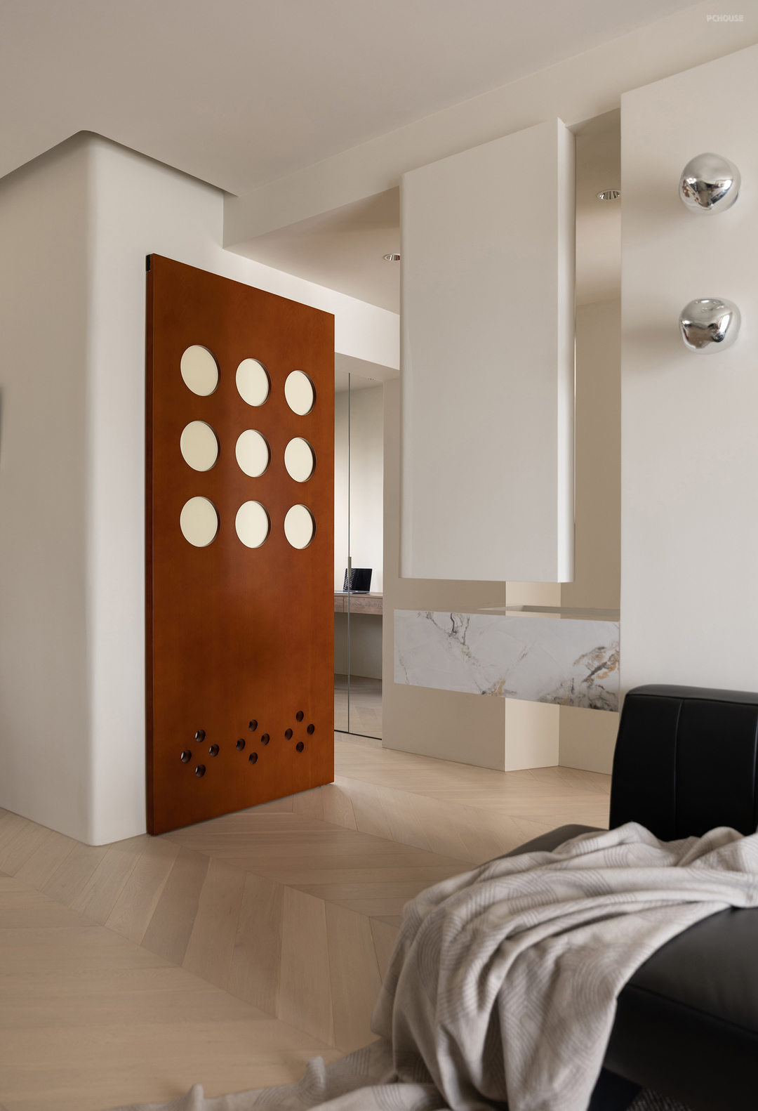 7㎡次卧改为多功能房,两个人居住且对书房的隐私性需求并不高,日常保持开放状态。为了营造屋主所偏好的自由自在、不拘一格的氛围,设计师特别选了中古洞洞“幽灵门”。“幽灵门”采用复古风格的实木贴皮,并以封闭漆处理,淡雅的纹理与艺术漆效果相似,呈现出一种独特的质感。门扇上设计了9个透光的小孔,内嵌奶黄色的亚克力板,既保证了光线的柔和渗透,又不失私密性。门扇下方的小圆孔则计划进行油漆修饰。幽灵门的宽度需比门洞宽出205毫米,高度则高出105毫米,因此在设计时必须精确计算尺寸,确保在门半开和全闭状态下,圆孔的视觉效果都能达到预期。