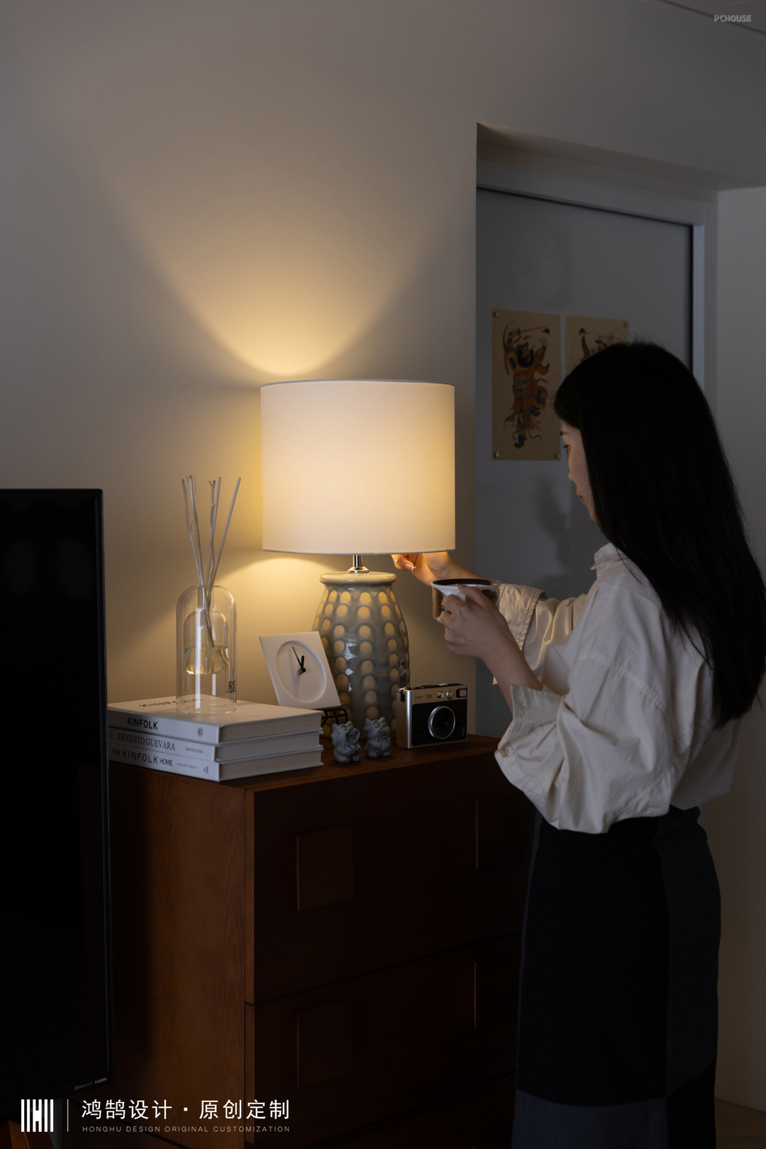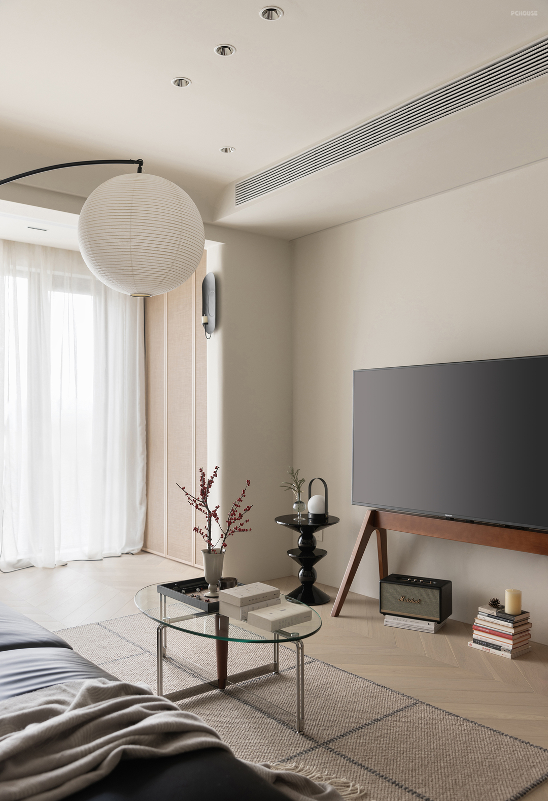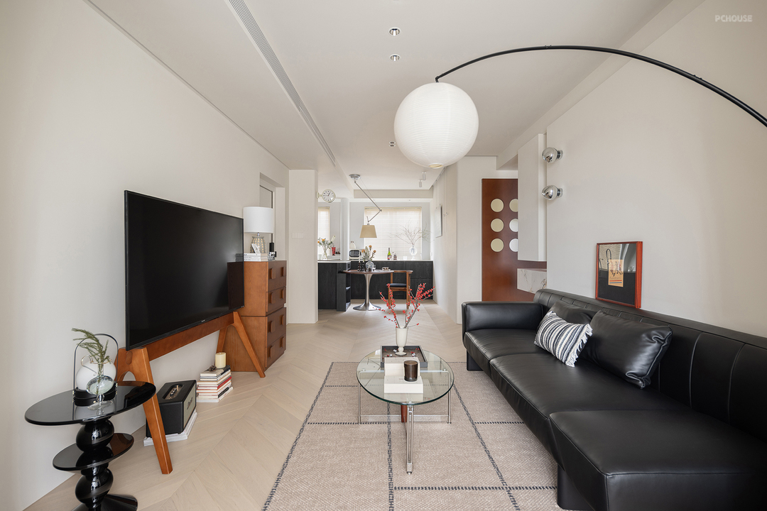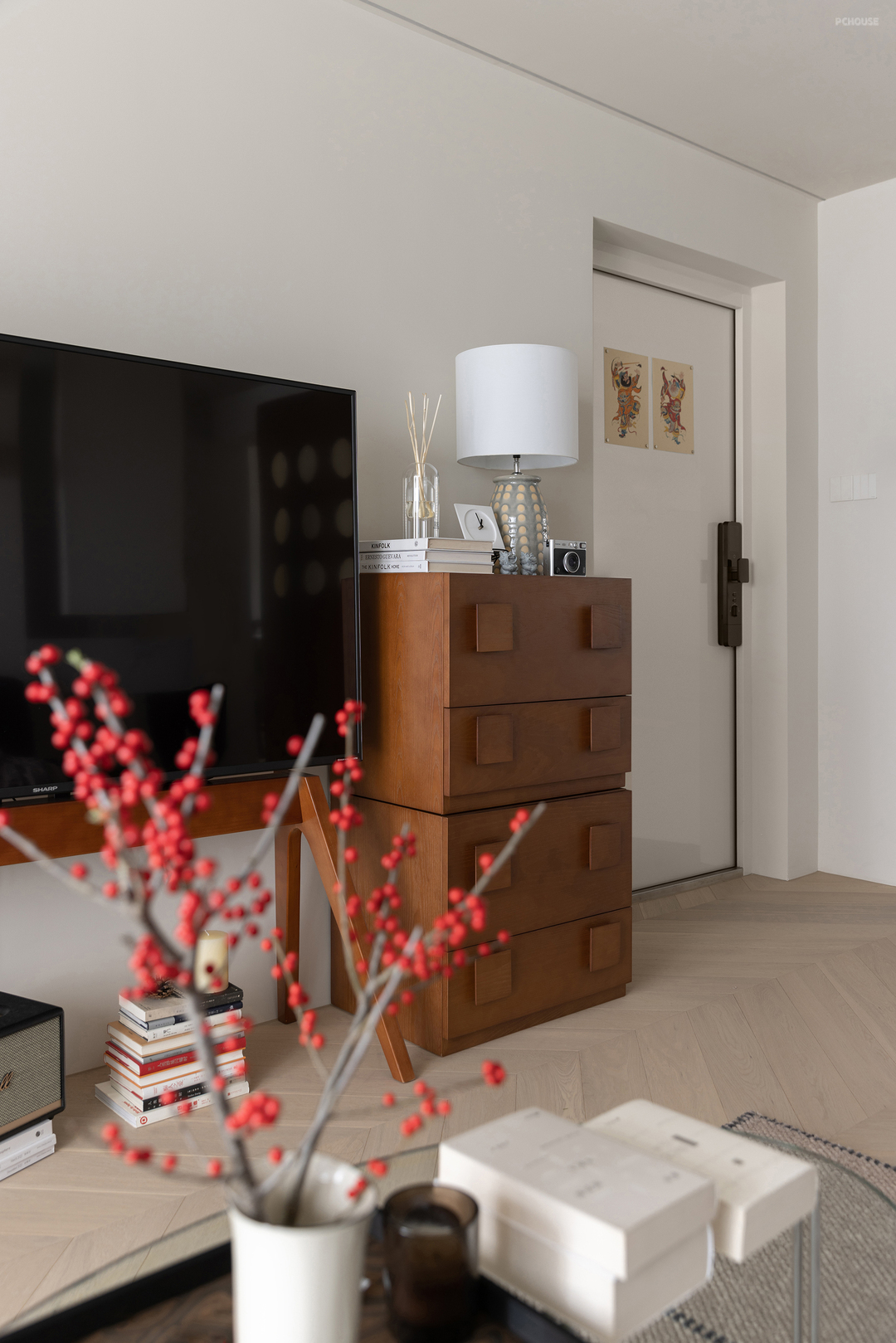 中古风与留白结合,通过材质质感及配色体现空间克制不张扬的气质,看似随意摆放的挂画、边几、音响…都是设计师的精挑细选,有层次、不单调、具备视觉重心。
