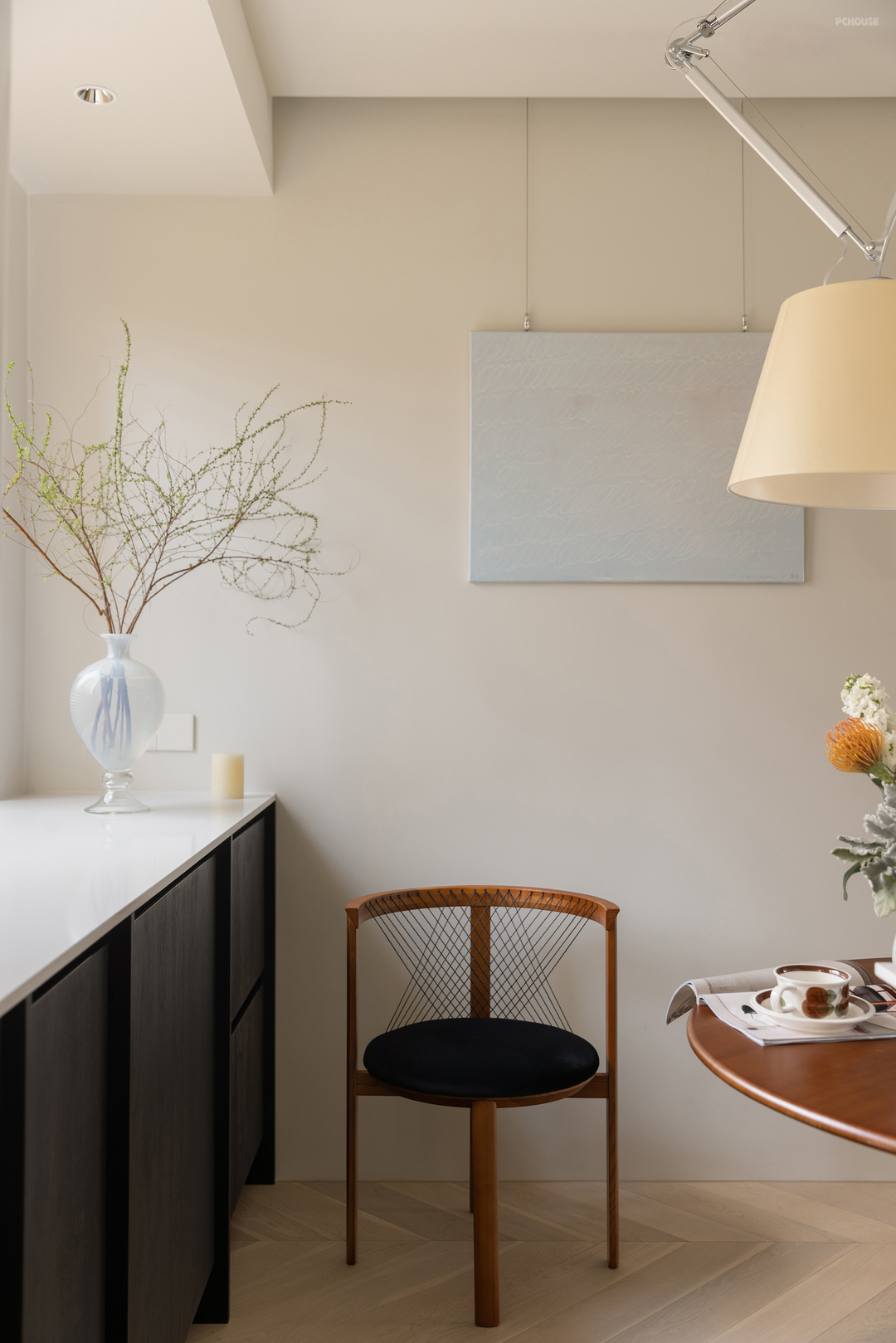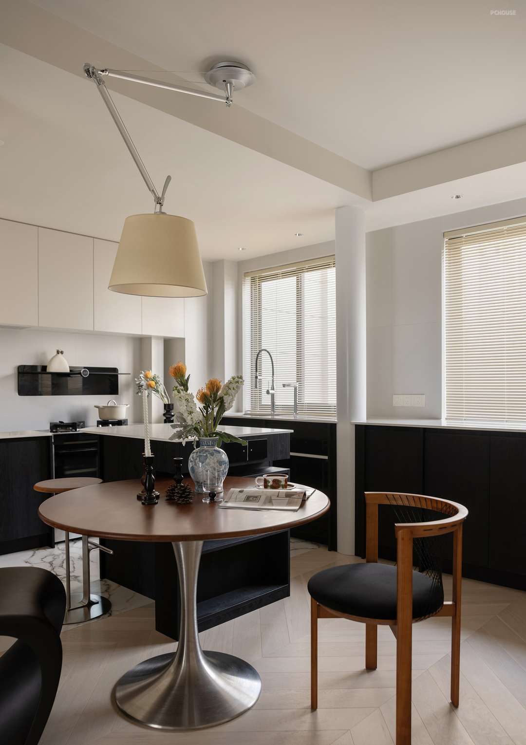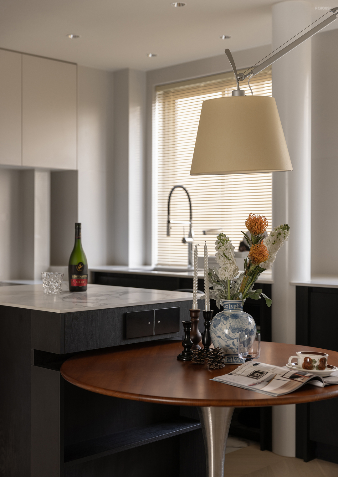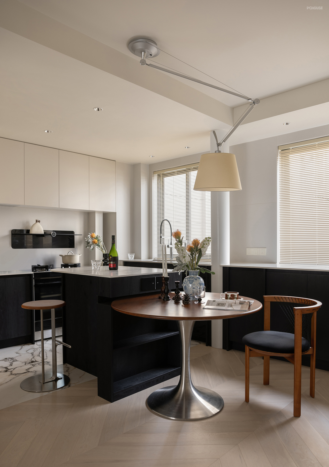 餐厨联动设计,拥有双面自然采光的区域最大限度拓宽了视线,这是让家显大的一个秘诀。一张直径1.1米的圆形餐桌嵌入0.91米高的方形岛台内,满足日常两人用餐需求,多人聚餐时也可以轻松拉出,变身独立圆桌,灵活应对各种聚会需求。餐厨一体的洄游动线,一盏自由折叠旋转的吊灯,根据餐桌位置自由调整,为每一次聚会营造恰到好处的氛围。