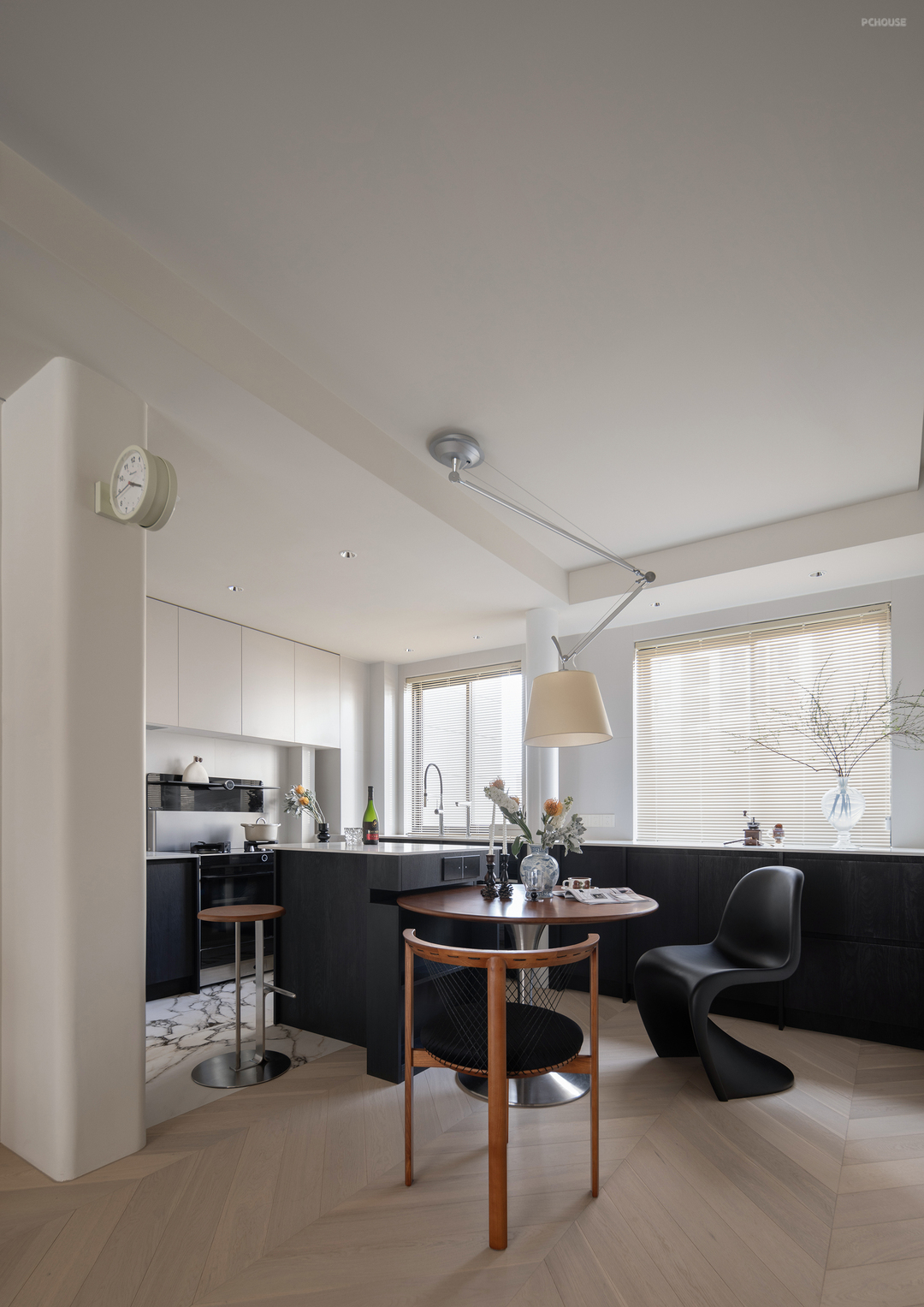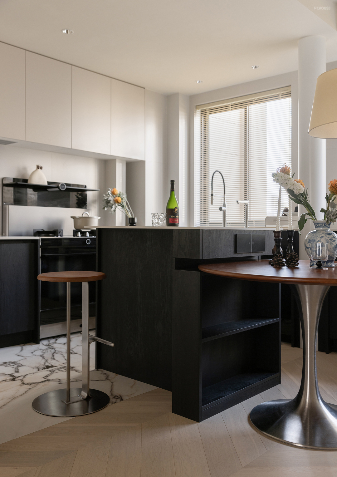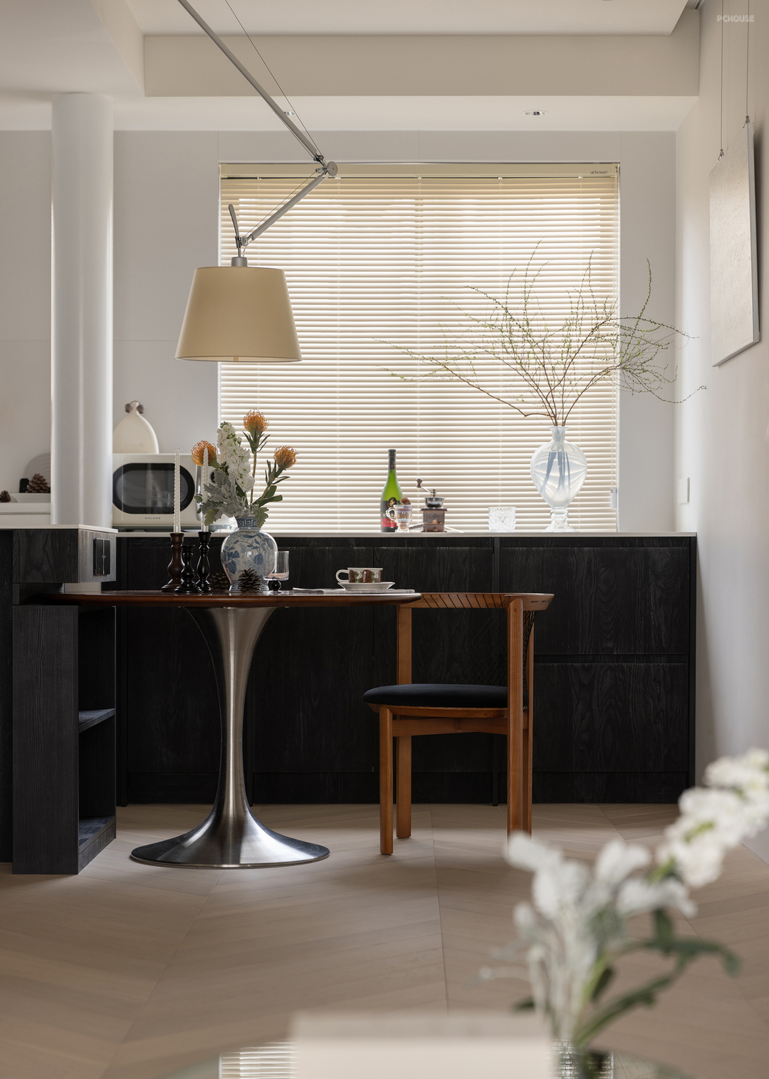 餐厨联动设计,拥有双面自然采光的区域最大限度拓宽了视线,这是让家显大的一个秘诀。一张直径1.1米的圆形餐桌嵌入0.91米高的方形岛台内,满足日常两人用餐需求,多人聚餐时也可以轻松拉出,变身独立圆桌,灵活应对各种聚会需求。餐厨一体的洄游动线,一盏自由折叠旋转的吊灯,根据餐桌位置自由调整,为每一次聚会营造恰到好处的氛围。