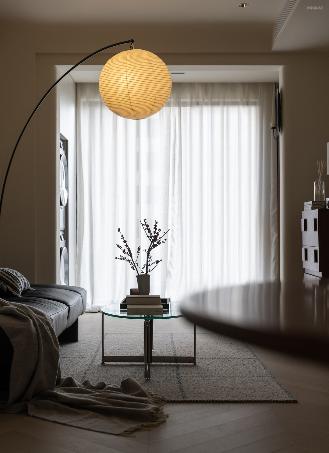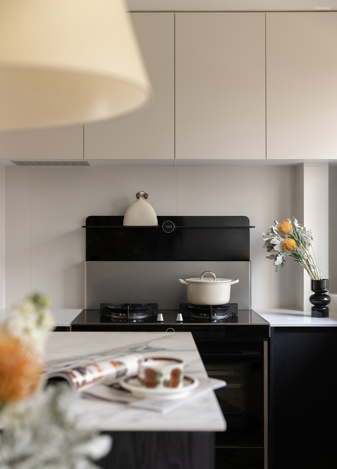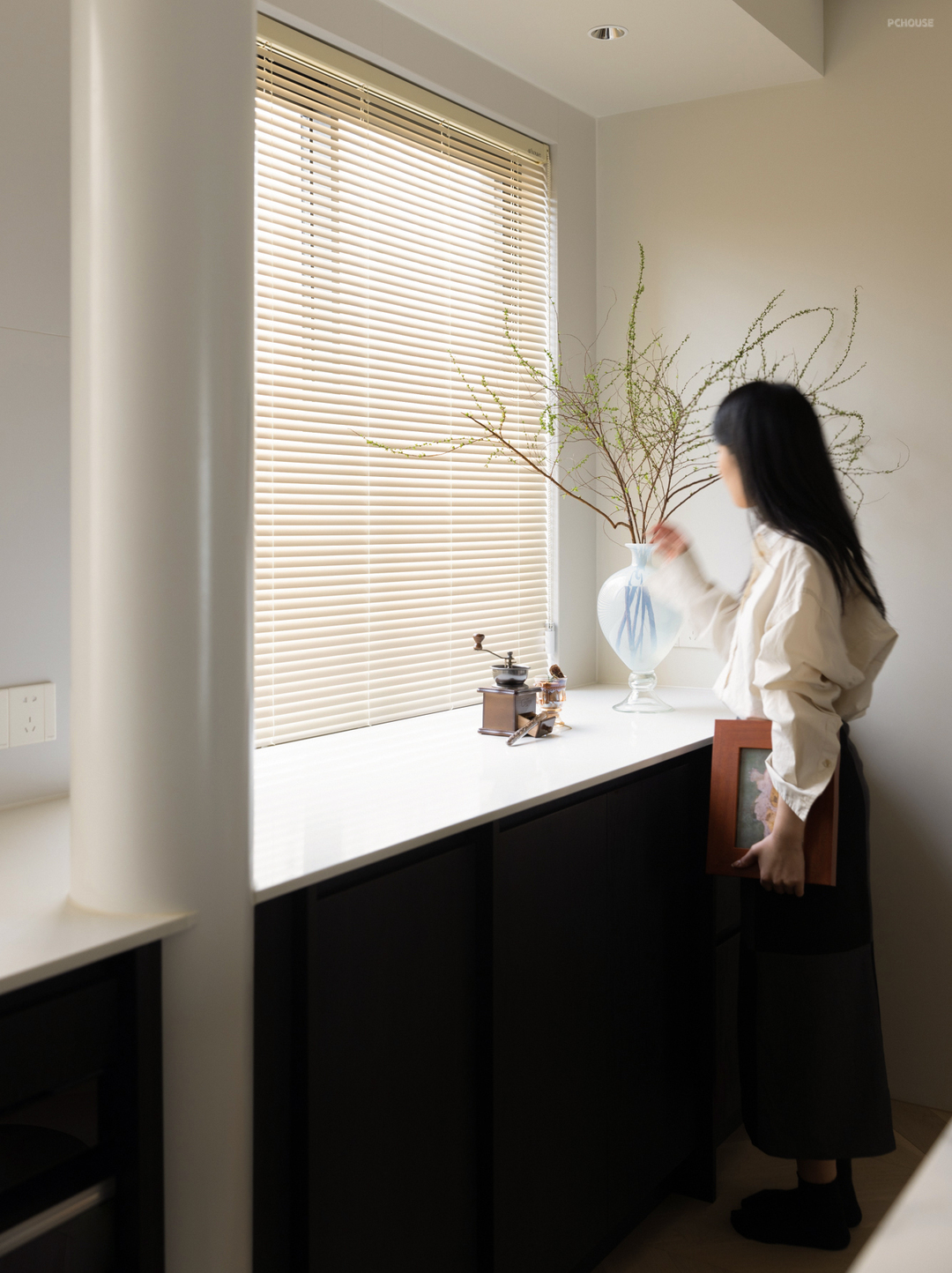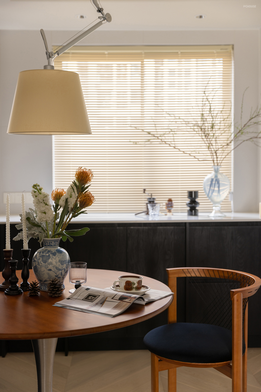 餐厨联动设计,拥有双面自然采光的区域最大限度拓宽了视线,这是让家显大的一个秘诀。一张直径1.1米的圆形餐桌嵌入0.91米高的方形岛台内,满足日常两人用餐需求,多人聚餐时也可以轻松拉出,变身独立圆桌,灵活应对各种聚会需求。餐厨一体的洄游动线,一盏自由折叠旋转的吊灯,根据餐桌位置自由调整,为每一次聚会营造恰到好处的氛围。