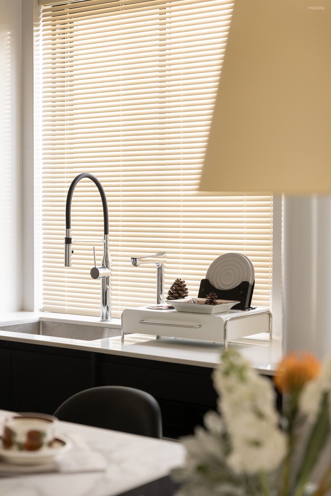 纯白岩板台面的岛台,侧面设计开放格储物空间用于摆放饮料和常用物品,方便取用。岛台内部则暗藏玄机,两格大抽屉收纳力满满,让厨房用品各归其位,保持空间整洁有序。为了呼应整体中古风格,设计师在材质选择上别具匠心。黑色骨骼线款式的岛台,搭配极薄隐藏款插座,细节之处尽显精致与质感。