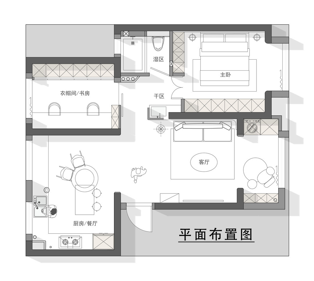 主卧预留了两个储物区域,床对面柜体设计悬空,床侧面是次净衣区。