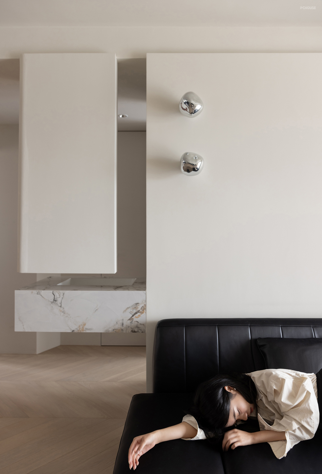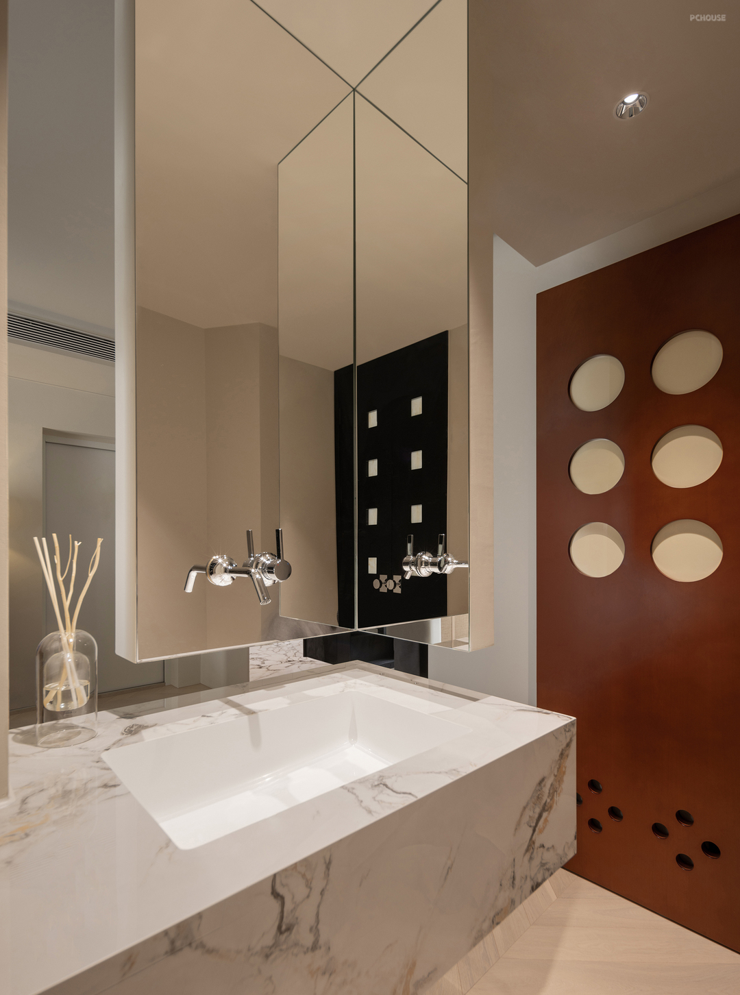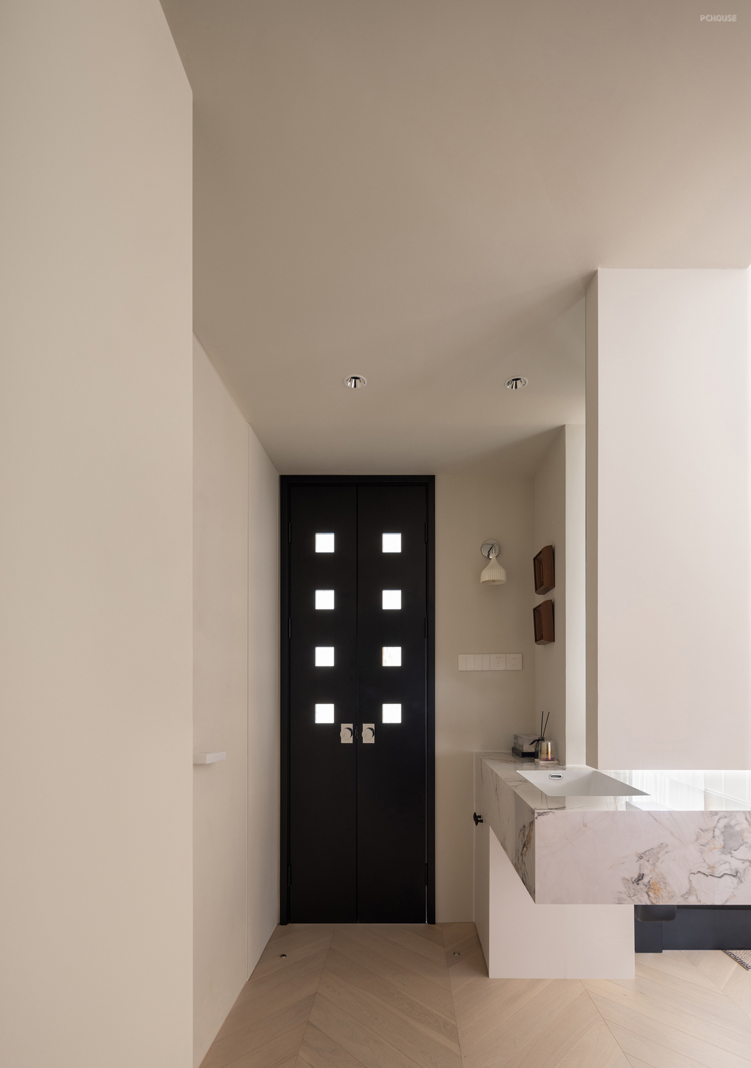 在转角L型墙体处设置镜面以扩大空间感,悬浮台盆与玄关相结合,确保了透光性和通透性。最初的设计理念是为了给过道的门增添趣味性,因此,即便是小小的干区走廊,也设计了三种风格迥异的门。南北两侧的门采用了不同造型的洞洞门,它们不仅引入了自然光线,无论是白天从卧室与书房透进来的自然光,还是夜晚的起夜照明,这个空间都能保持良好的可见度。当然,干区的照明设施如壁灯、顶部筒灯和镜前灯也需要预先规划好。卫生间湿区的隐形门设计让马桶和淋浴区得以隐藏,门涂刷与墙面同色乳胶漆。由于厕所门是频繁使用的区域,为避免白色门面上留下手印,特别选择了与门同色系的极简风格门把手。悬浮式台盆是岩板陶瓷一体盆,台面颜色选用与厨房地砖接近的冷翡翠