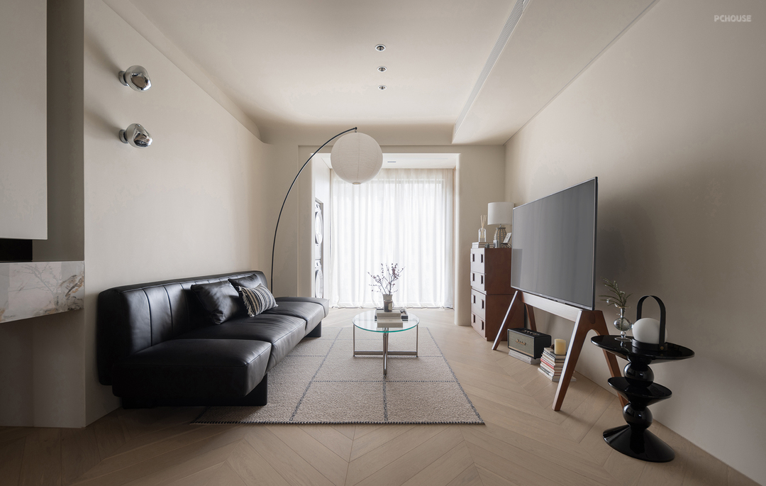 将阳台纳入客厅,让公共区域变得更加敞亮。客厅不需要遮光度很高,2倍褶皱包黑边的单层亚麻帘拖地6cm,透光半透人真的很有氛围感,不易皱垂坠感也好。