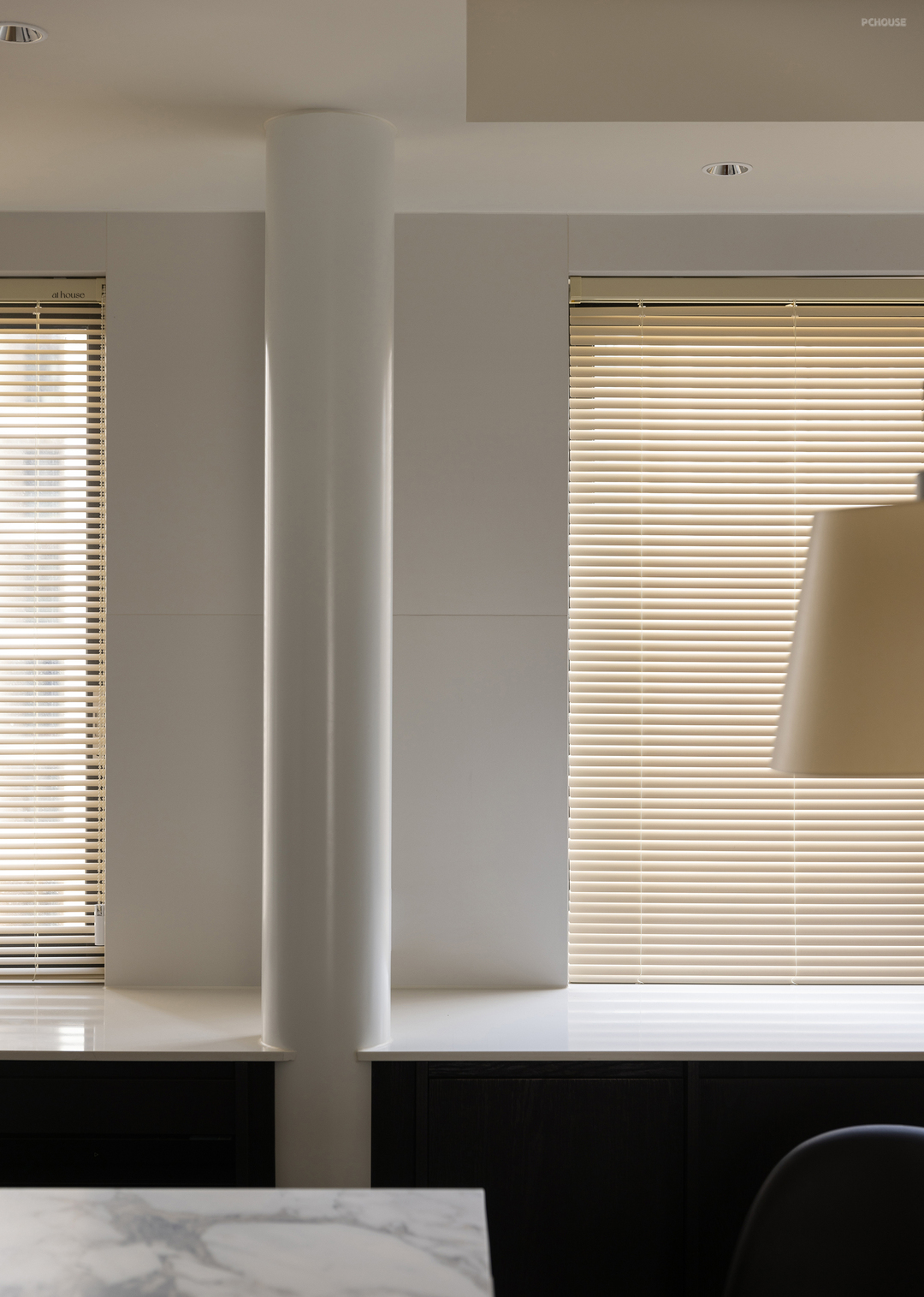面对开放式厨房中无法移动的下水管问题,设计师打破常规,特别设计了较薄的不锈钢包管,并进行了白色烤漆处理。管道被嵌入餐边柜中,与硬装融为一体,成为空间中的一道独特景观。